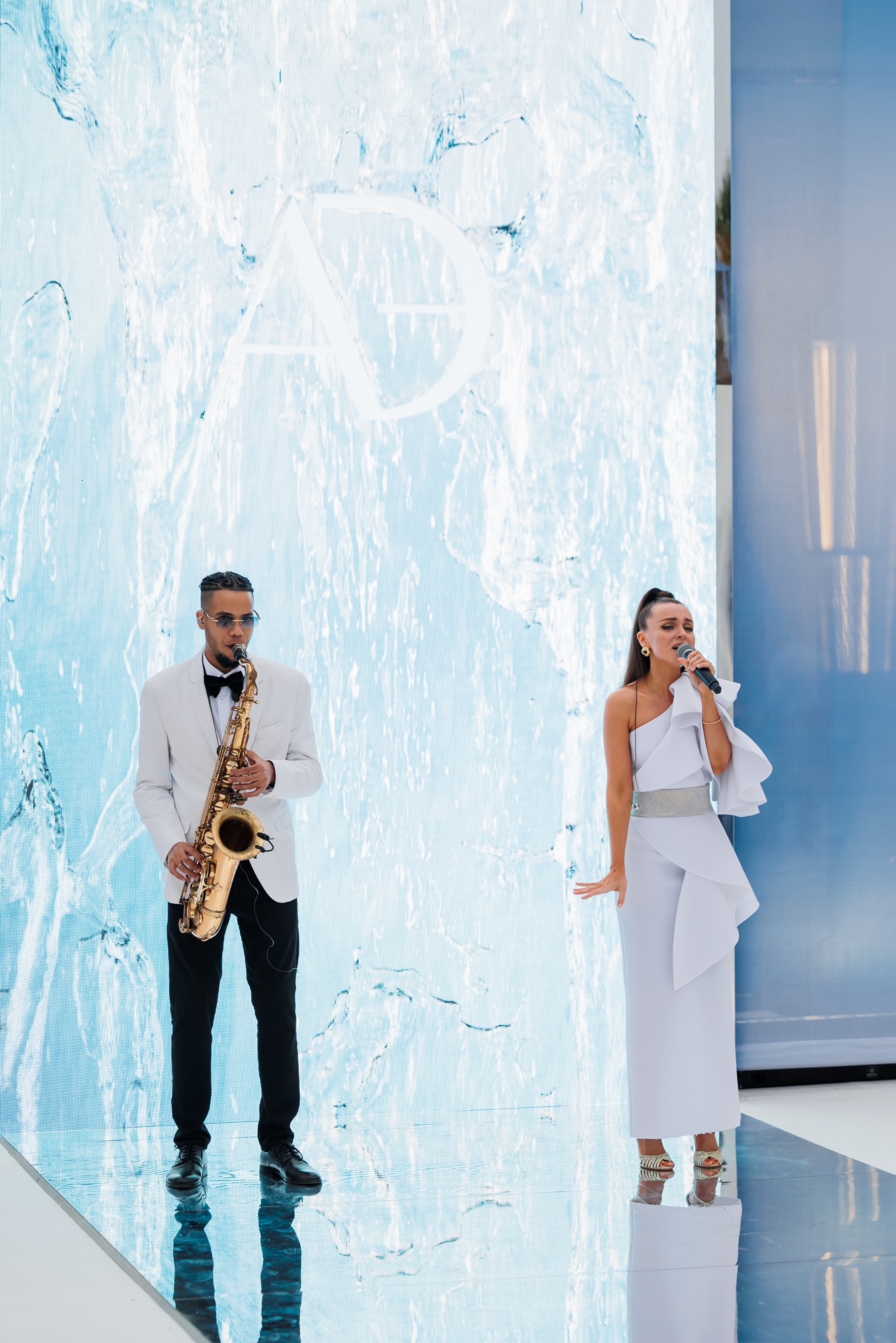 В течение двухдневного монтажа мы полностью перевоплотили площадку — убрали весь зеленый цвет, максимально осветлив и выбелив пространство. К побережью Персидского залива мы привезли замечательных специалистов из Москвы и в целом из России: это и студия декора, и команда по техническому обеспечению, фотографов и видеограф, ведущий и кавер-группа, режиссер мероприятия, а также артист проекта — Егор Крид.