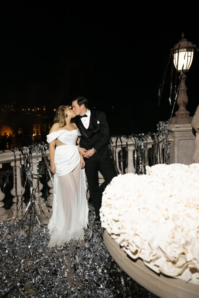 Богатый русский колорит, легендарные «Русские сезоны» Дягилева, многовековое зодчество, искусство рукоделия и широта нашей души — все это нашло отражение в красочной свадьбе в стиле, а la russe. На основной свадебный образ невесту Александру также вдохновил русский фольклор. Сказочное белоснежное платье и голубое перо в волосах — словно Царевна Лебедь.