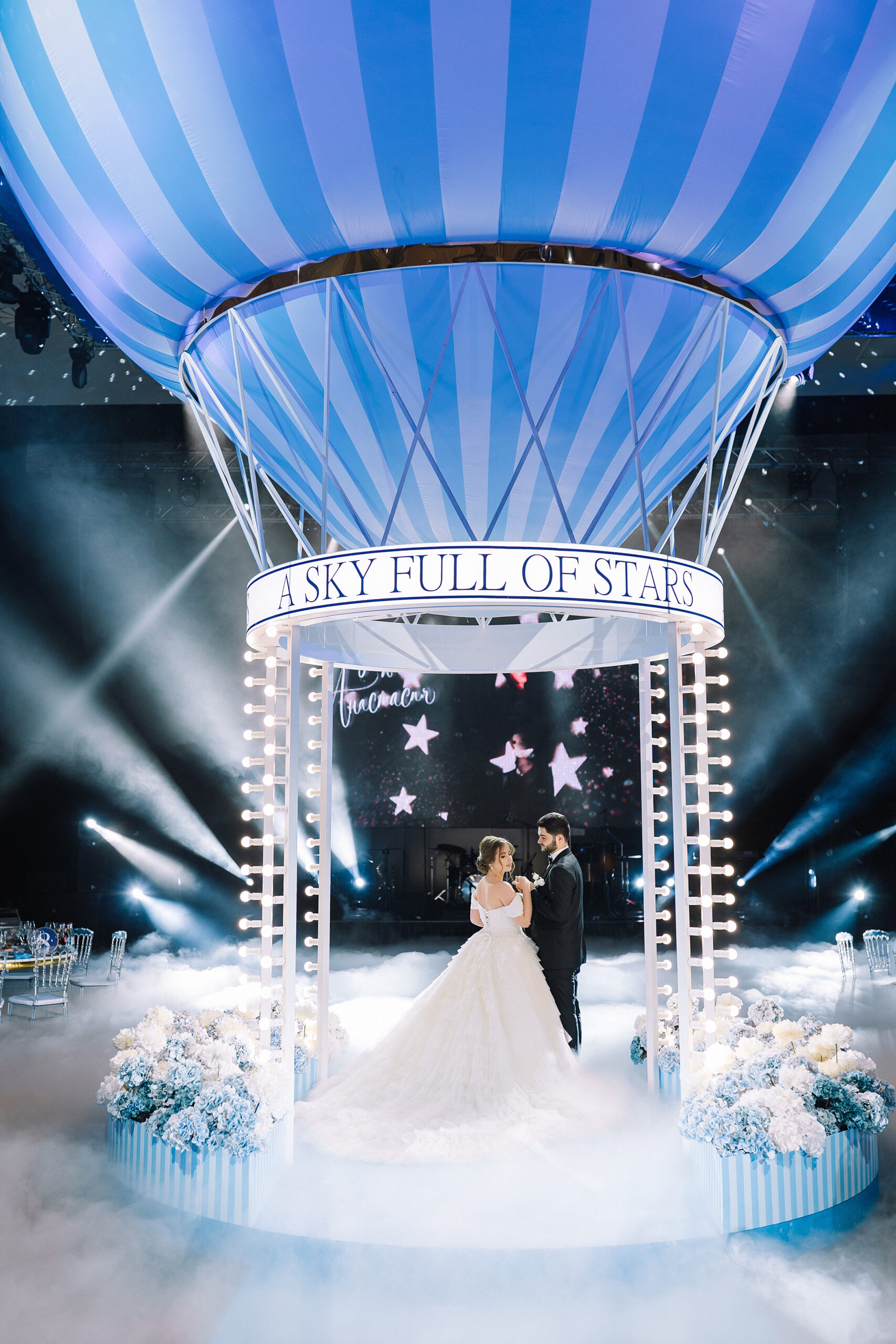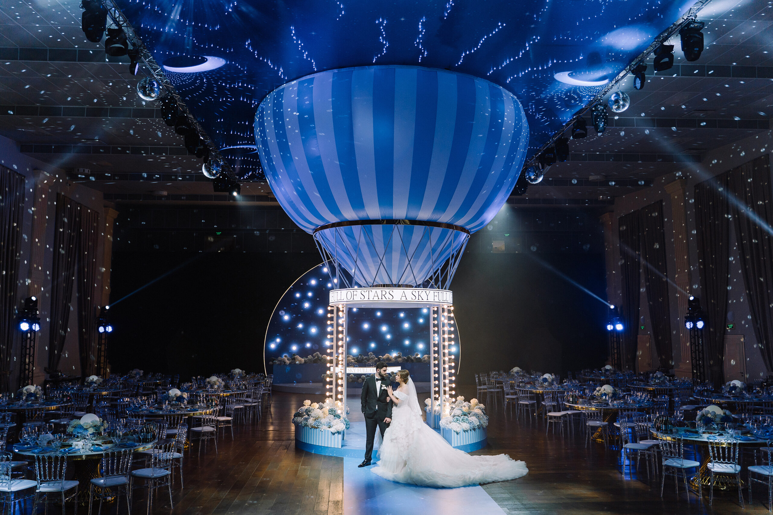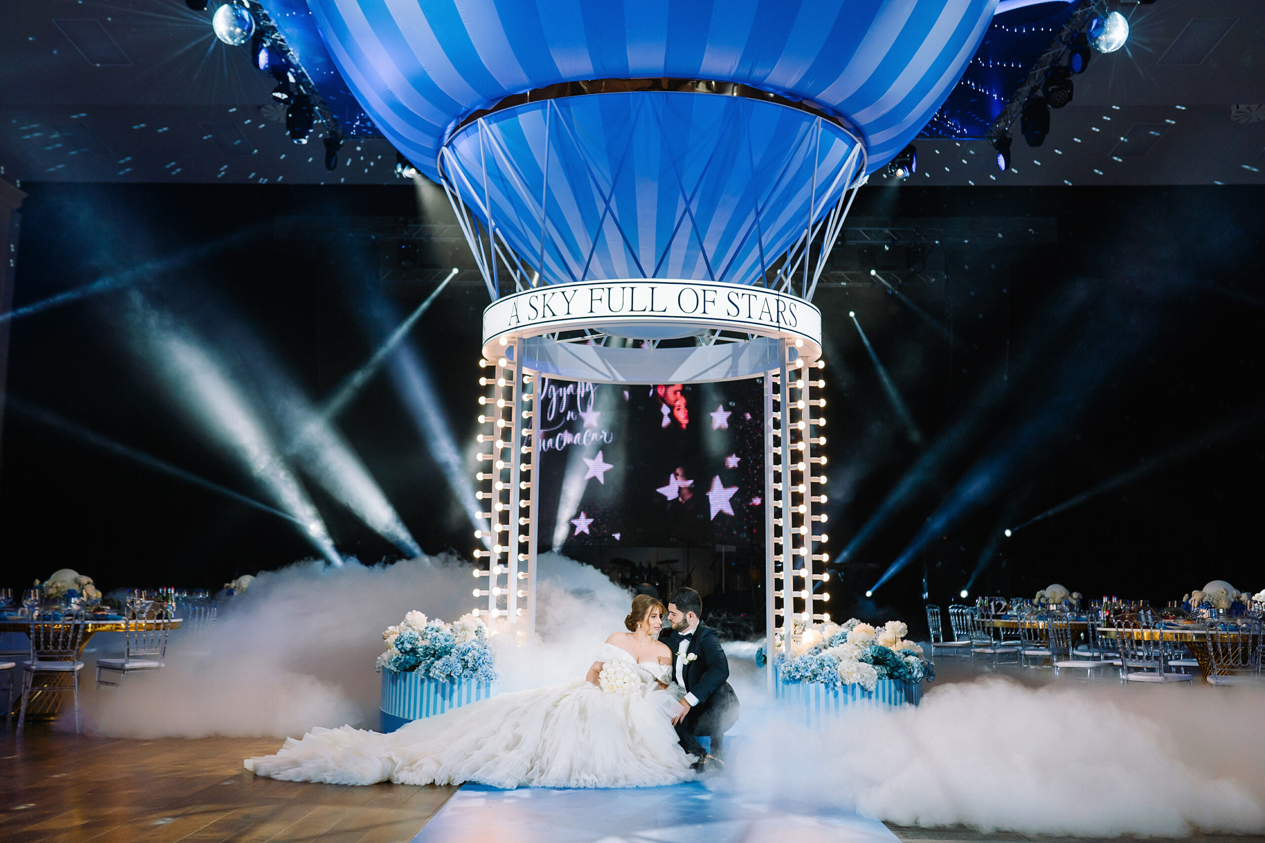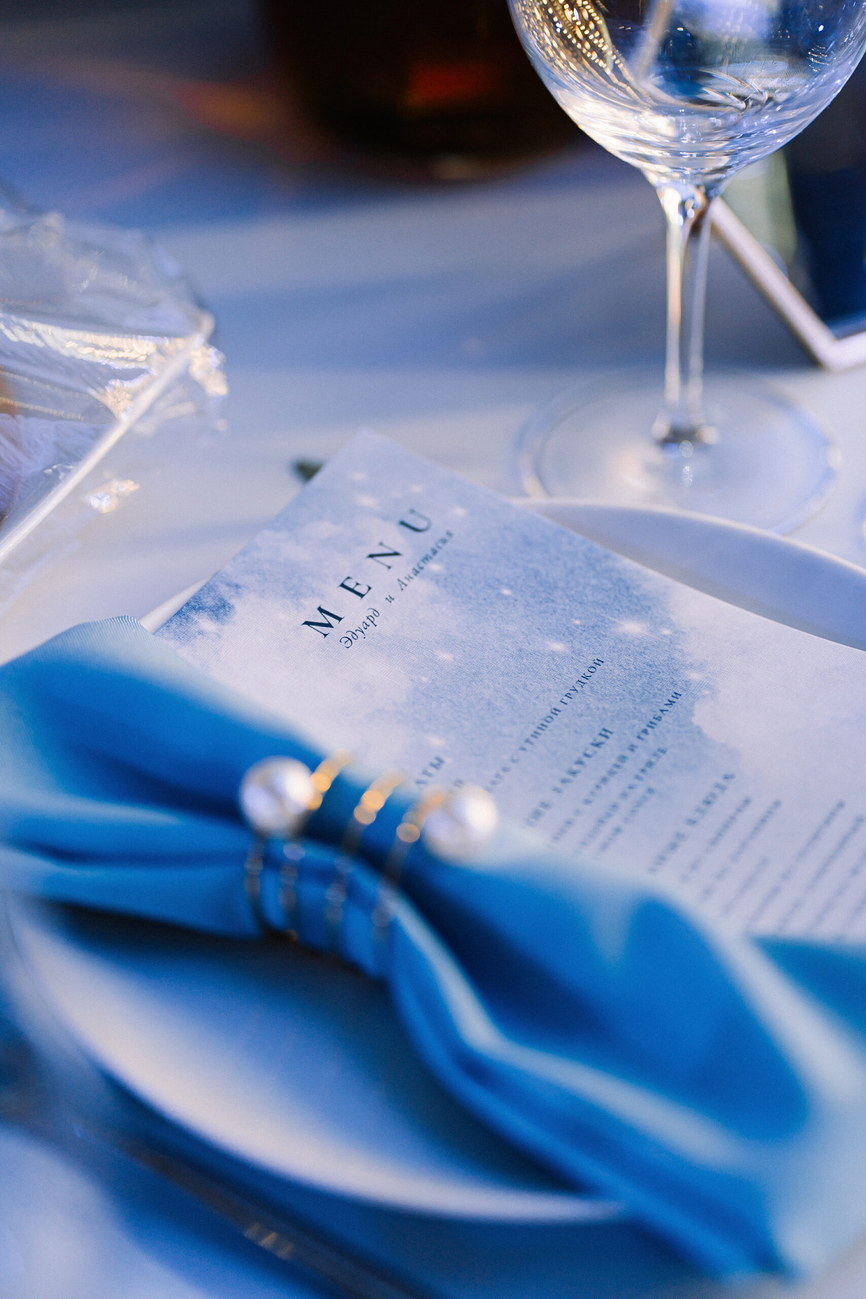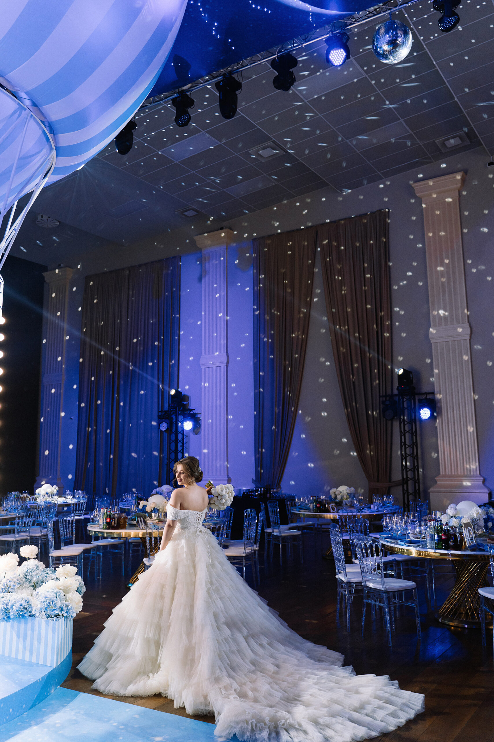 Воздушный шар — это символ большой любви Анастасии и Эдуарда и бесконечного пространства, в котором пара вместе достигает новых высот легко и свободно. Поэтому именно он стал центральным элементом зала, заполняющим вертикально все пространство от пола до потолка, что позволило эффектно обыграть появление пары, первый танец и торжественный вынос свадебного торта. Приглашения на свадьбу, букет невесты, флористика и сервировка столов, — все это стилистически поддерживало бело-голубую свадебную палитру и помогло создать особенную атмосферу, где каждая деталь рассказывала историю отношений Эдуарда и Анастасии.