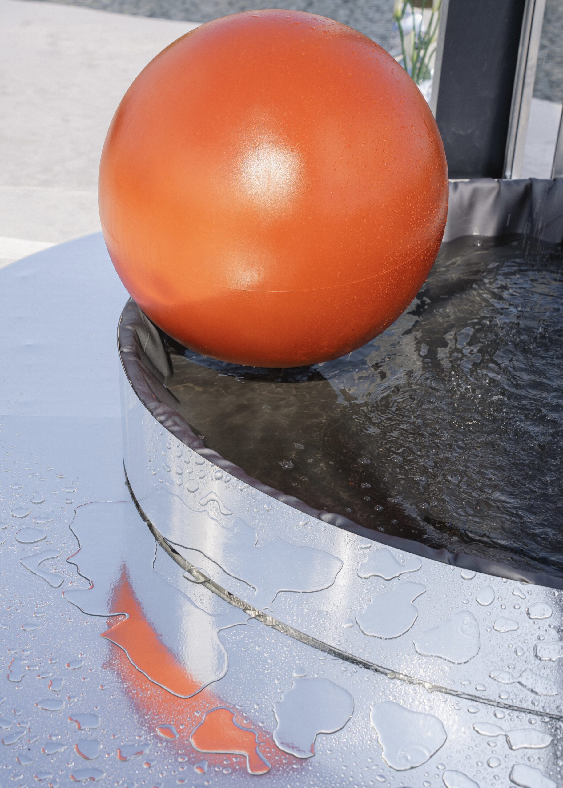 Арка футуристического дизайна обтекаемой формы со струящейся по ней водой создавала эффект бесконечного источника. Яркий шар, лежащий в бассейне, символизировал баланс и концентрацию энергии.