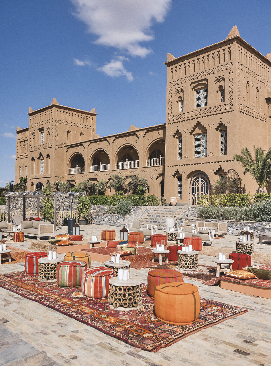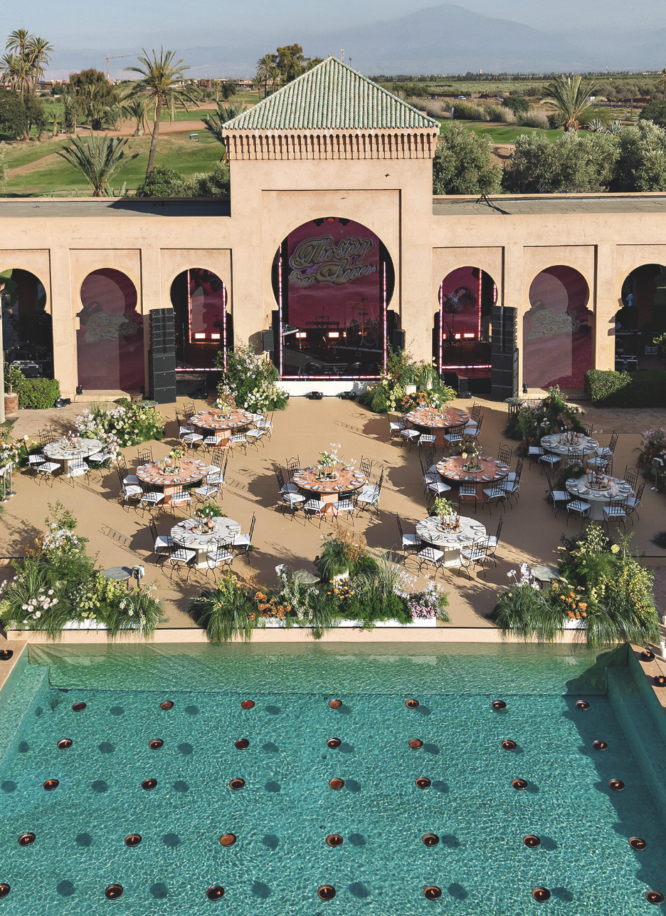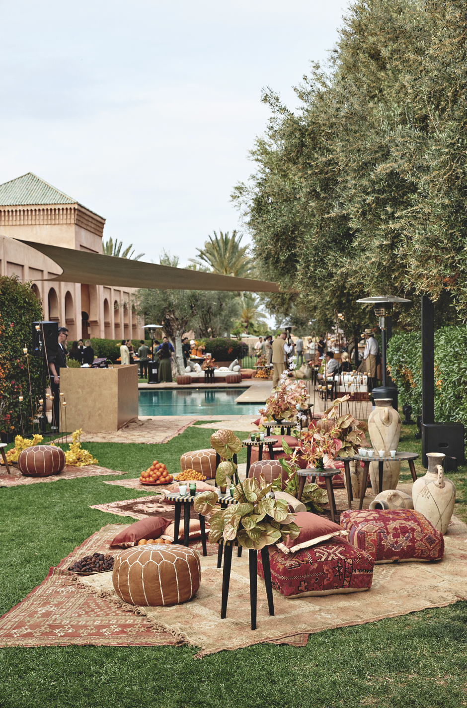После возвращения в отель ком- пания разделилась по интересам: кто-то поехал на экскурсию в музей Ива Сен-Лорана, кто-то на базар за коврами. Все это мы координировали через специально созданный TG-канал. А вернувшись, гости делились впечатлениями от города и, конечно, от свадьбы — во время тематического марокканского вечера. Для него поляна за главным бассейном Amanjena превратилась в декоративный восточный базар с открытой кухней, на которой готовили традиционные блюда, берберскими музыкантами и чайной церемонией. Как вы уже поняли, программа была максимально насыщенной, поэтому с наступлением темноты все были счастливы просто улечься на подушки и посмотреть на большом экране видеонарезку предыдущих дней.