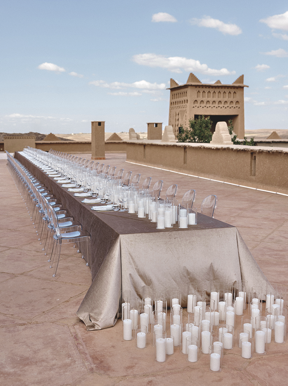 На крыше замка был накрыт длинный стол лаконичного дизайна, за которым прошел ужин с французским сетом из пяти перемен блюд. А после него гости спустились на уровень ниже, к бассейну, где провели вечер с диджеями: московским артистом Dimma Urih и турецким дуэтом Depart. Гарантируем: лучи нашей световой инсталляции, бившей в черное небо пустыни, были видны даже из Марракеша. И конечно, на стены замка был спроецирован главный символ праздника — сияющее сердце.