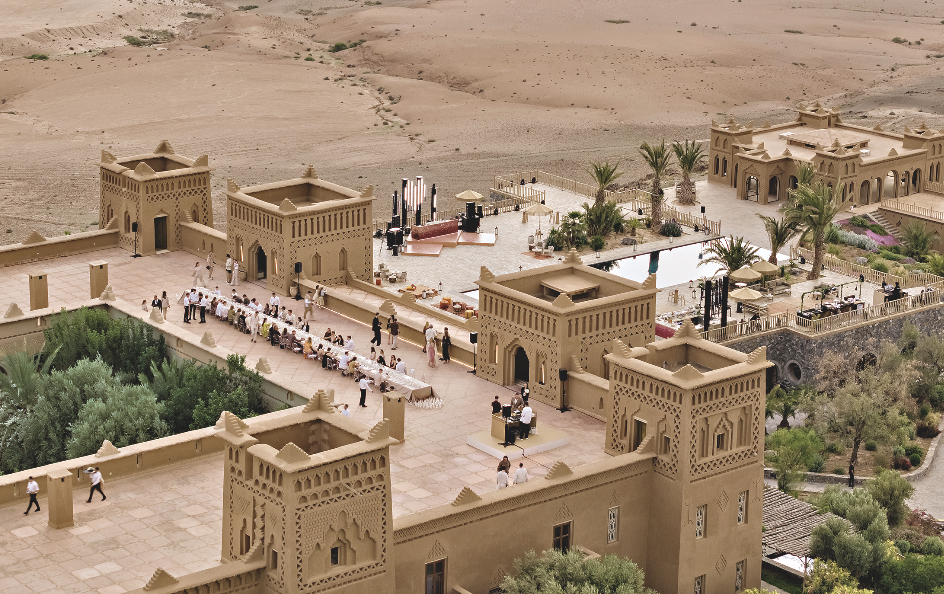 А наутро нас ждала марокканская пустыня Агафай, ставшая фоном и главным героем третьего дня. Всех гостей увезли в секретный замок-отель с панорамой 360°. Когда мы обсуждали планы с парой, они выступали категорически против классического ужина посреди пустыни — с шатрами, огненным шоу и бедуинской атмосферой. Поэтому был найден фантастический восстановленный замок, превращенный в отель и только что открывшийся. Мы заранее предупредили гостей, что они уезжают из Amanjena с ночевкой и что там их будет ждать все необходимое. Так и было: мы подготовили пижамы с сердечком-логотипом (долго обсуждали с женихом и невестой ткани и дизайн — в итоге получилось очень красиво; было особенно приятно на следующий день за завтраком видеть в этих пижамах и мужчин, и девушек, и даже маленьких гостей) и косметички со всем необходимым, включая небольшой hangover-набор. Другими словами, предусмотрели все мелочи.