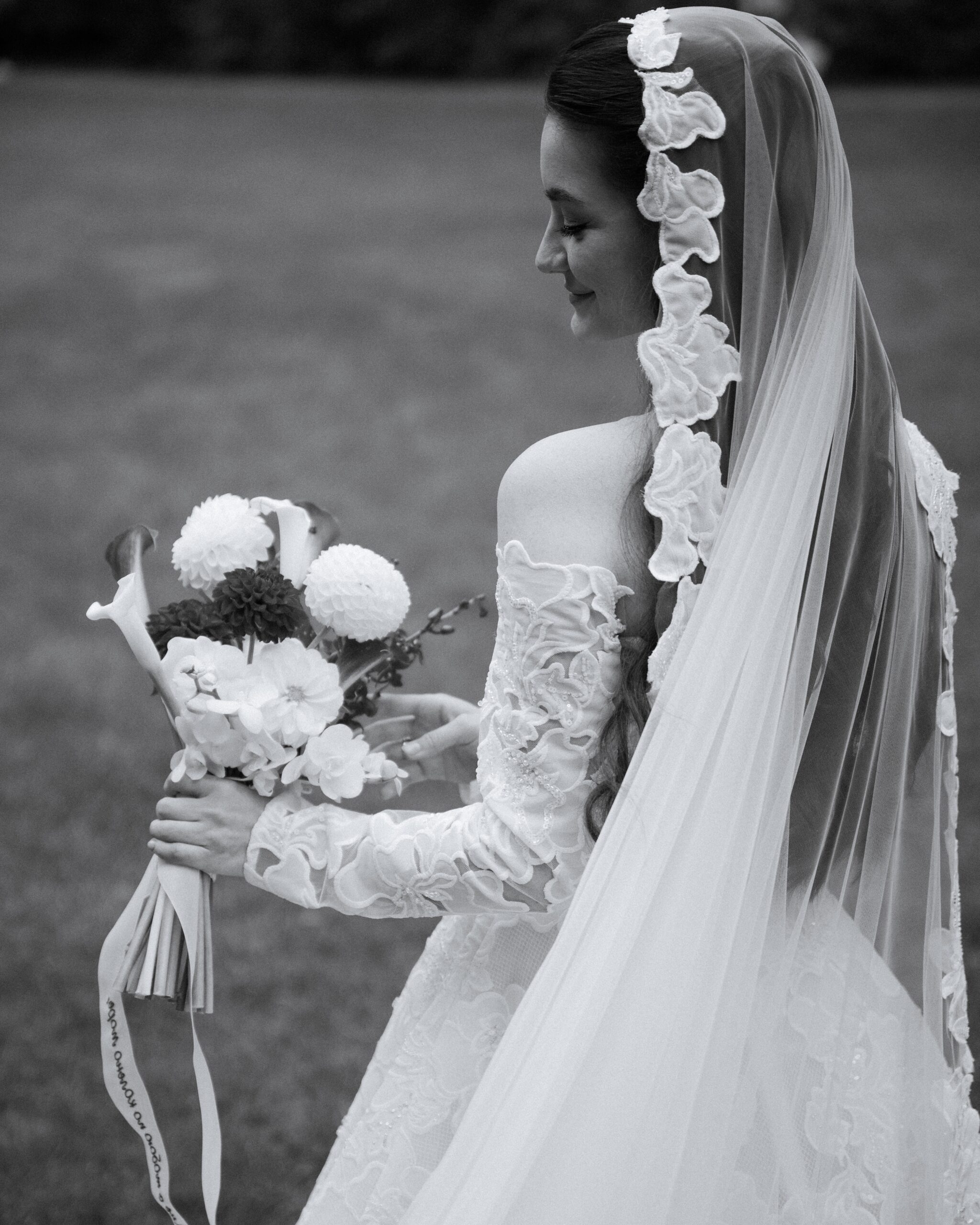 Для Софьи было создано два букета. Один — полностью из амаранта, второй — с бордово-белой флористикой, декорированной лентой с надписью «Мне с тобою по колено море, будем жить не зная бед».