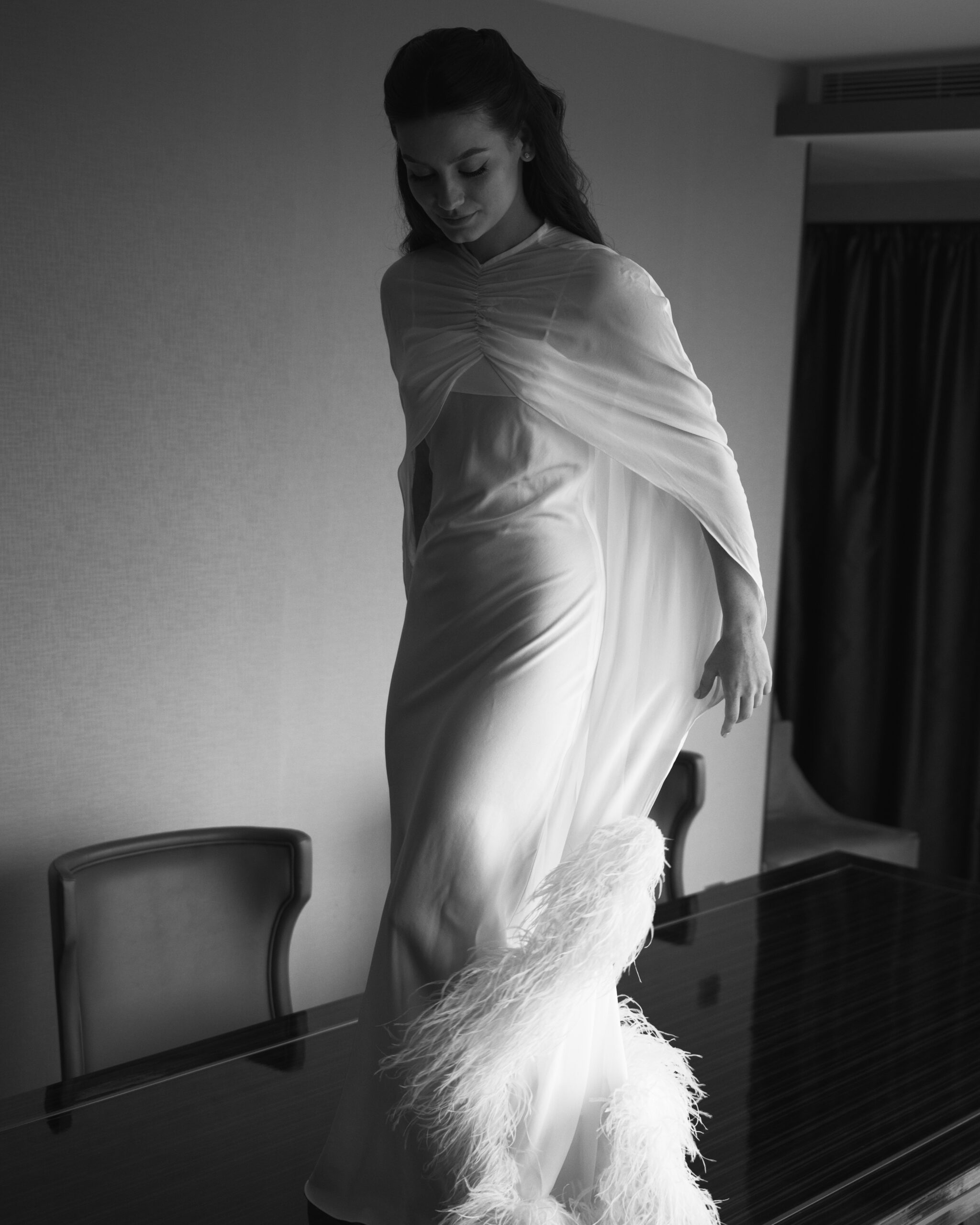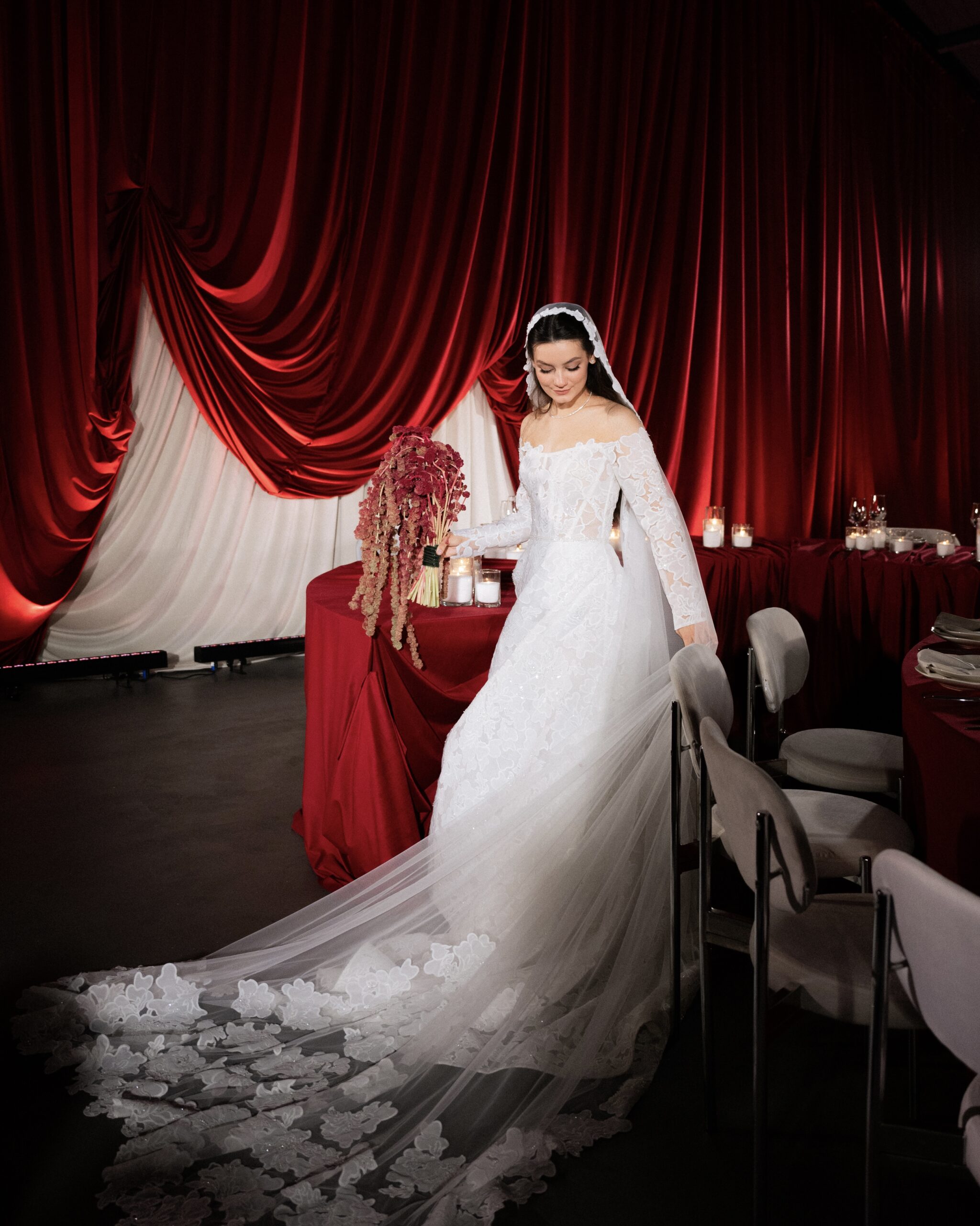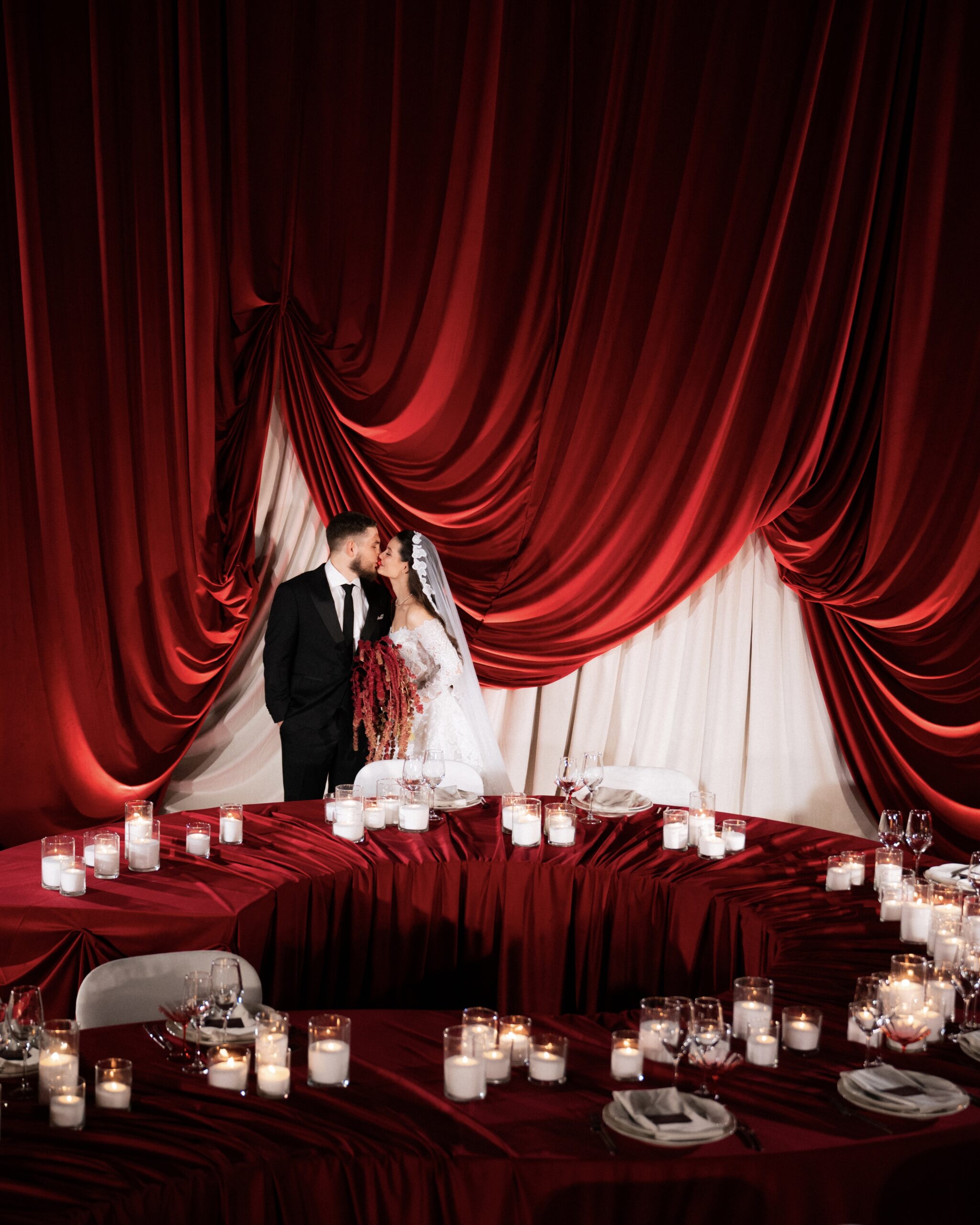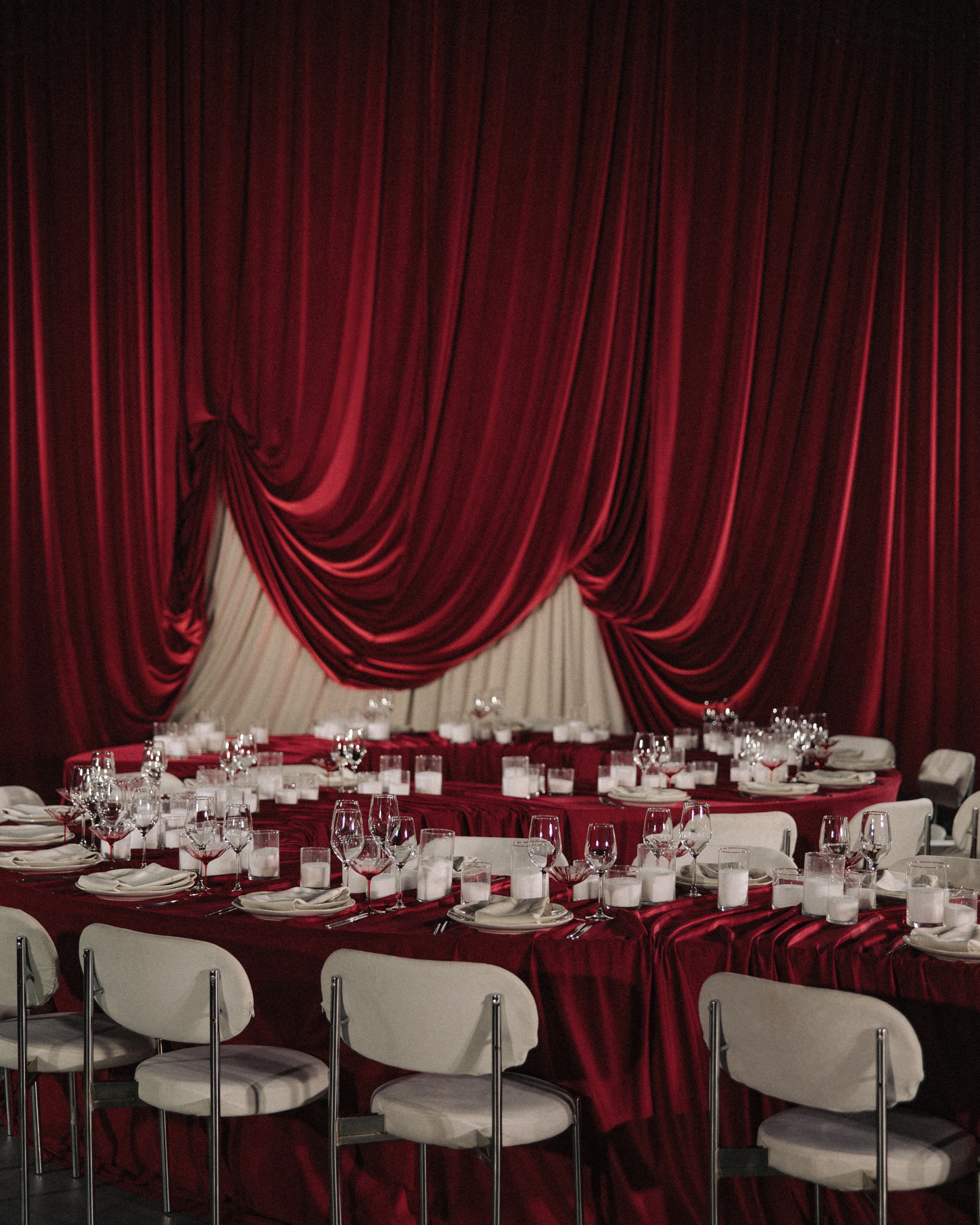 Гостей сидели за двумя прямоугольными столами, а пара вместе с близкими за изогнутым волной столом. Интересно, что в зале все окна были задрапированы красной тканью, а пространство освещали 219 насыпных свечей.