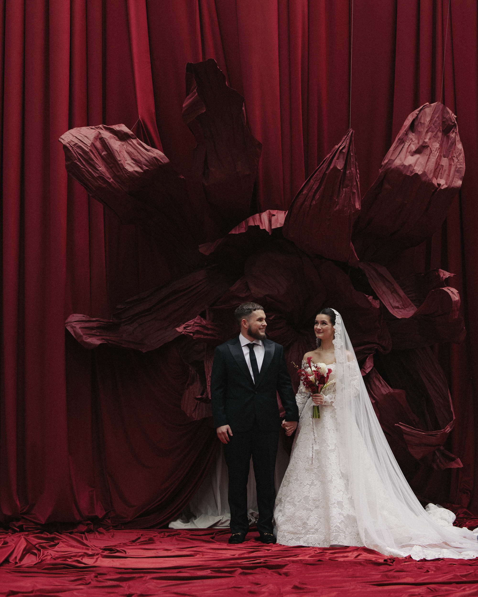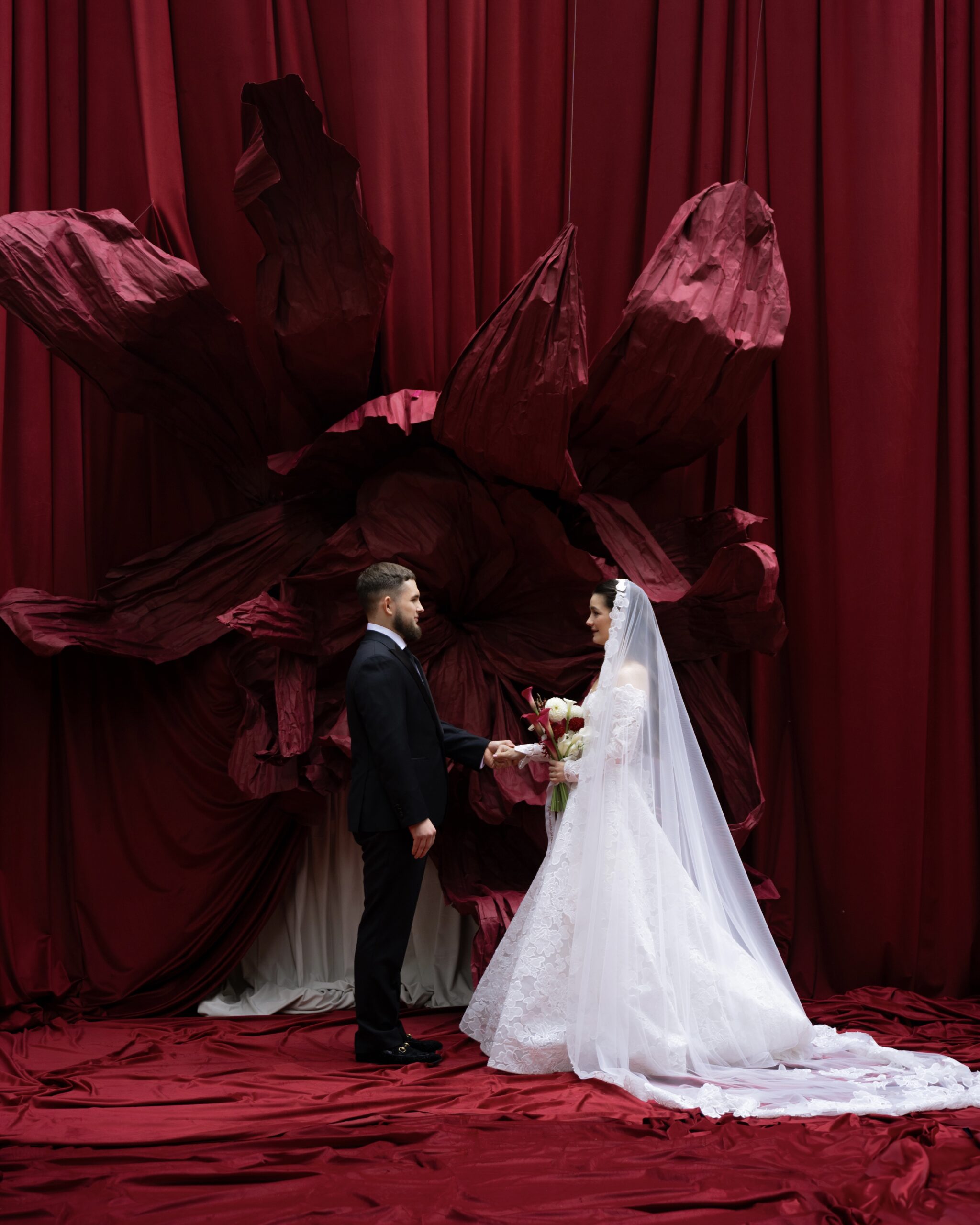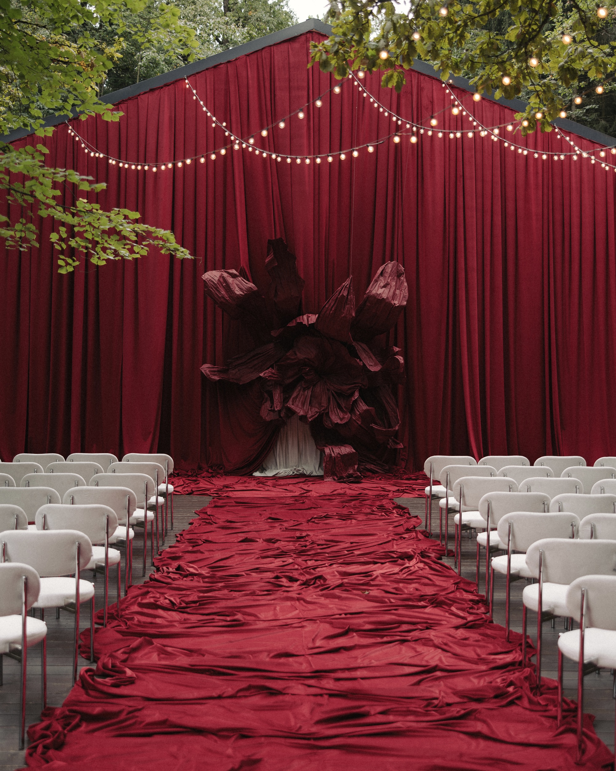 Цветовая гамма свадьбы — красно-бордовая палитра. В зоне церемонии был задрапирован фасад веранды бордовой бархатной тканью, а в центре установили большой бумажный цветок.