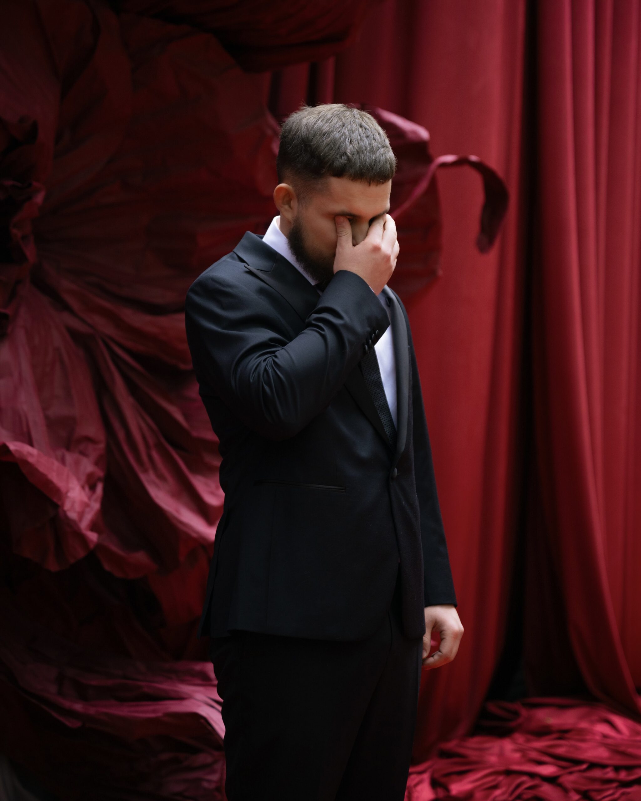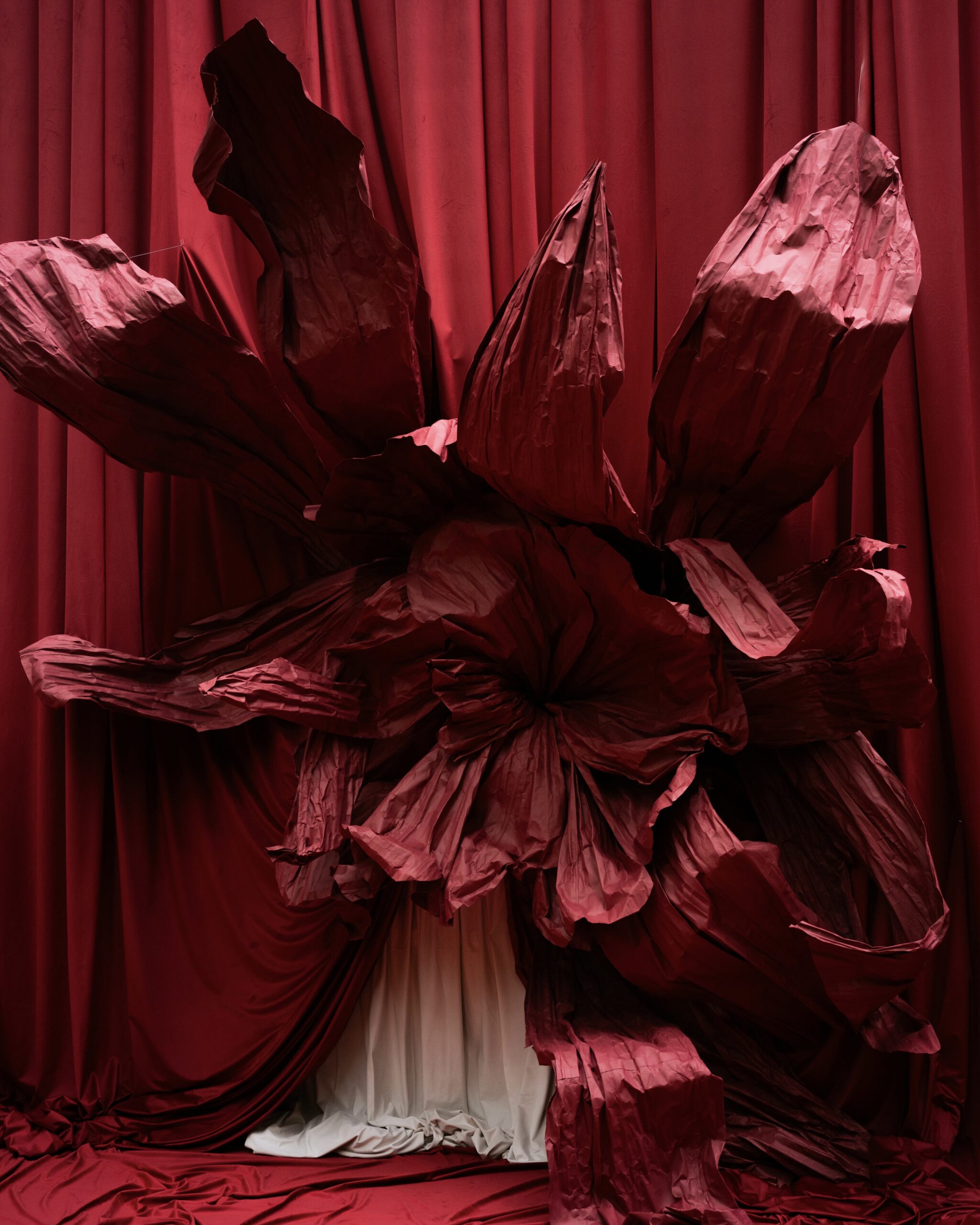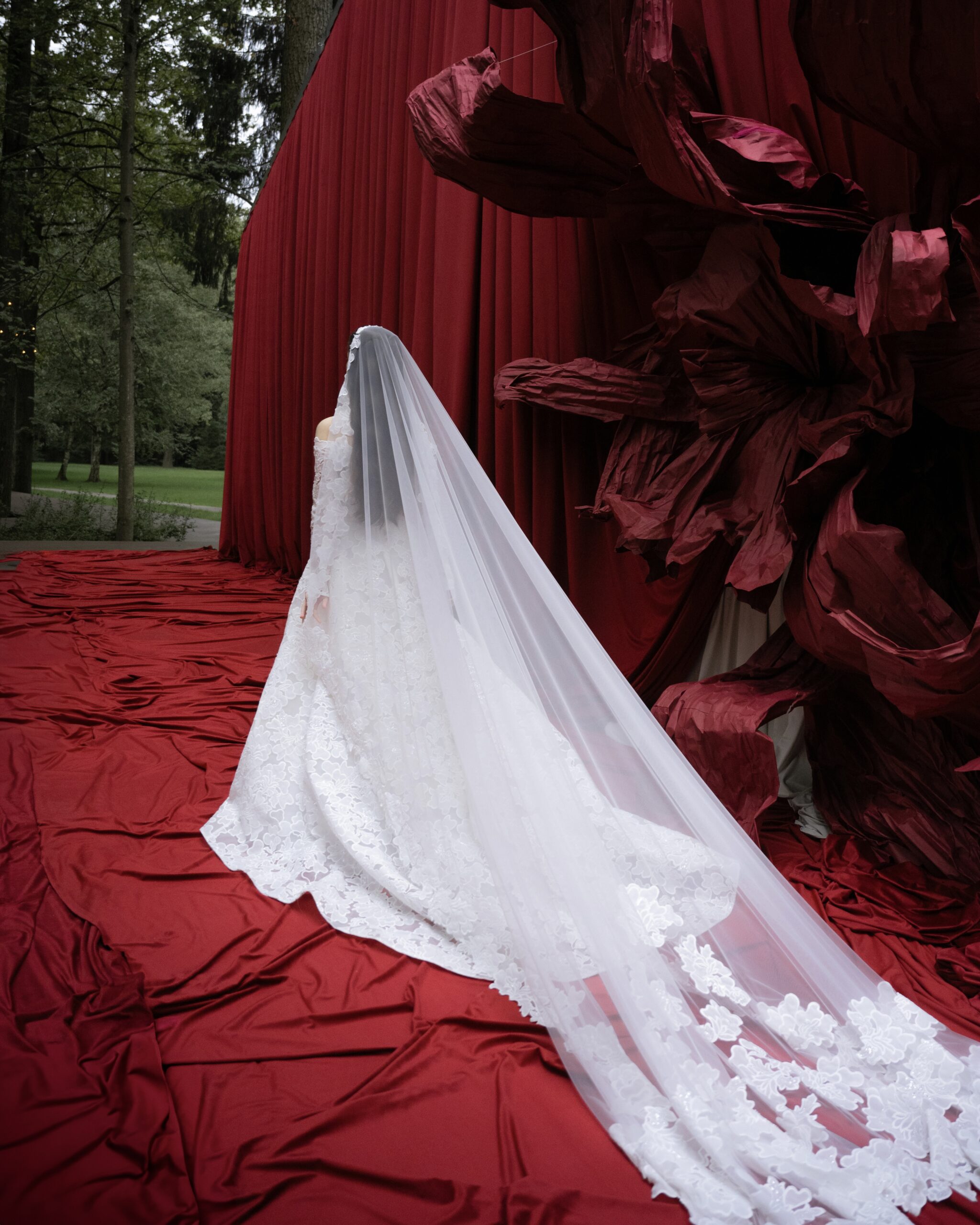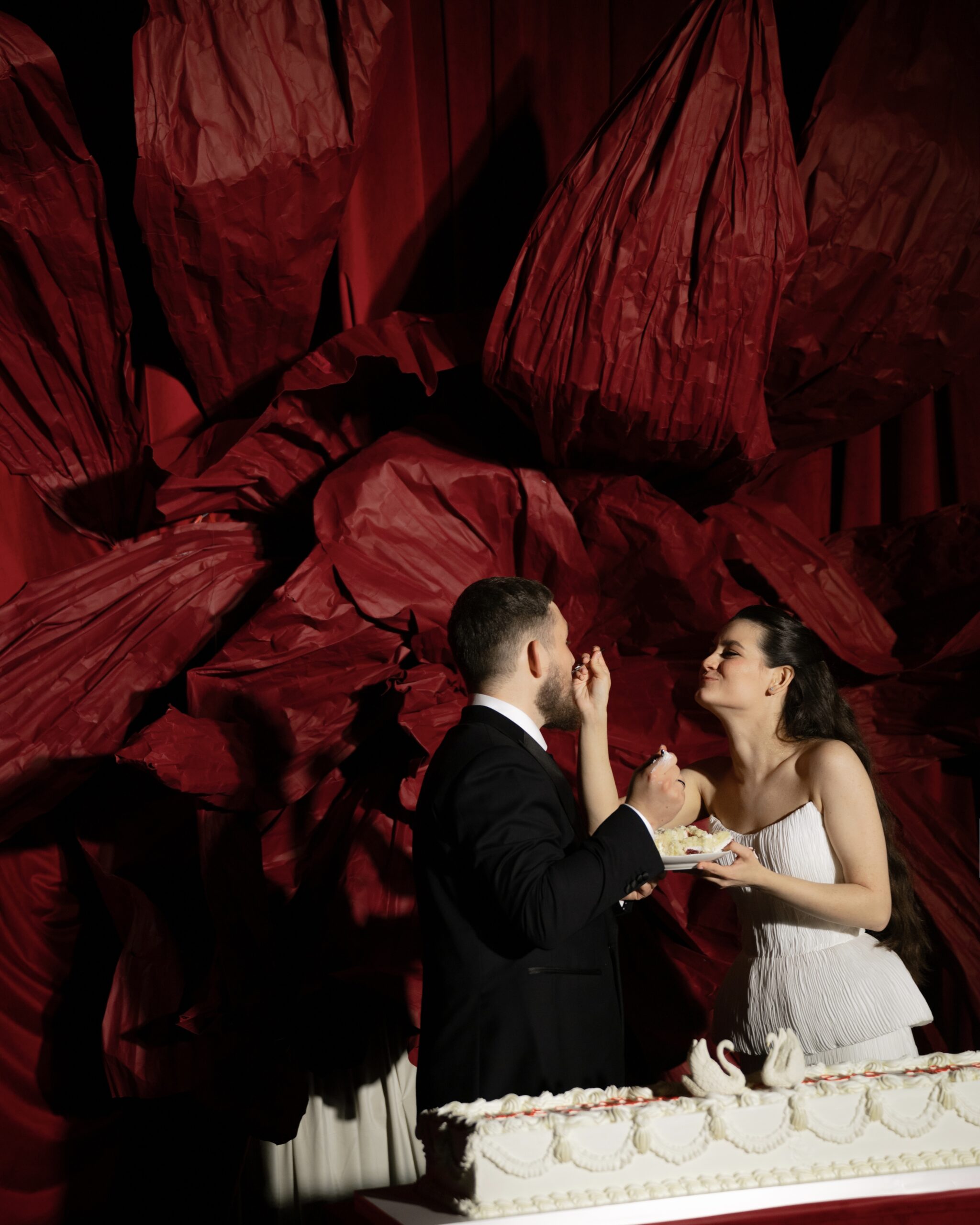 Цветовая гамма свадьбы — красно-бордовая палитра. В зоне церемонии был задрапирован фасад веранды бордовой бархатной тканью, а в центре установили большой бумажный цветок.