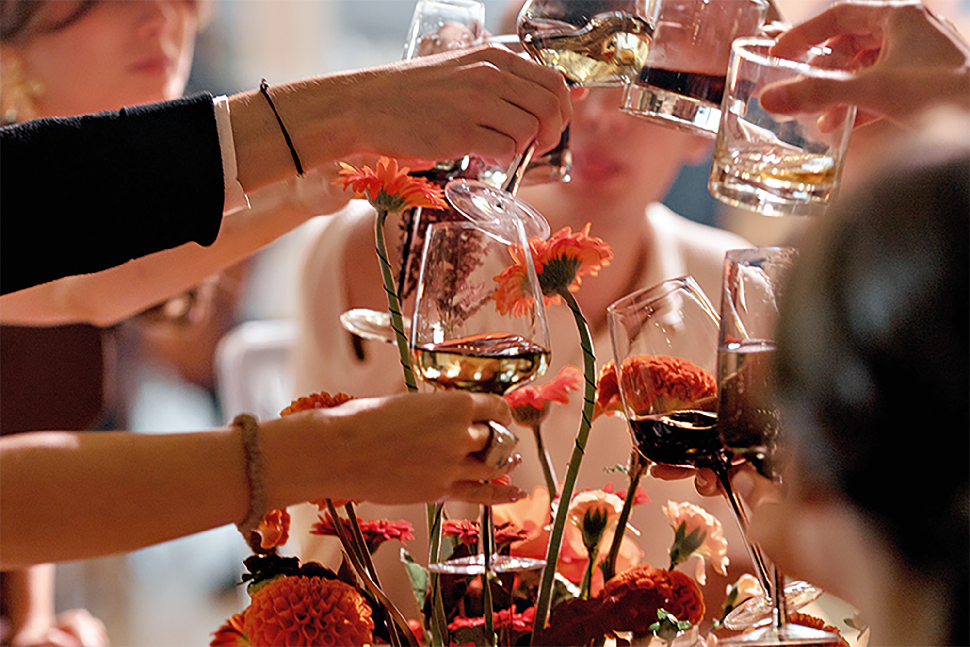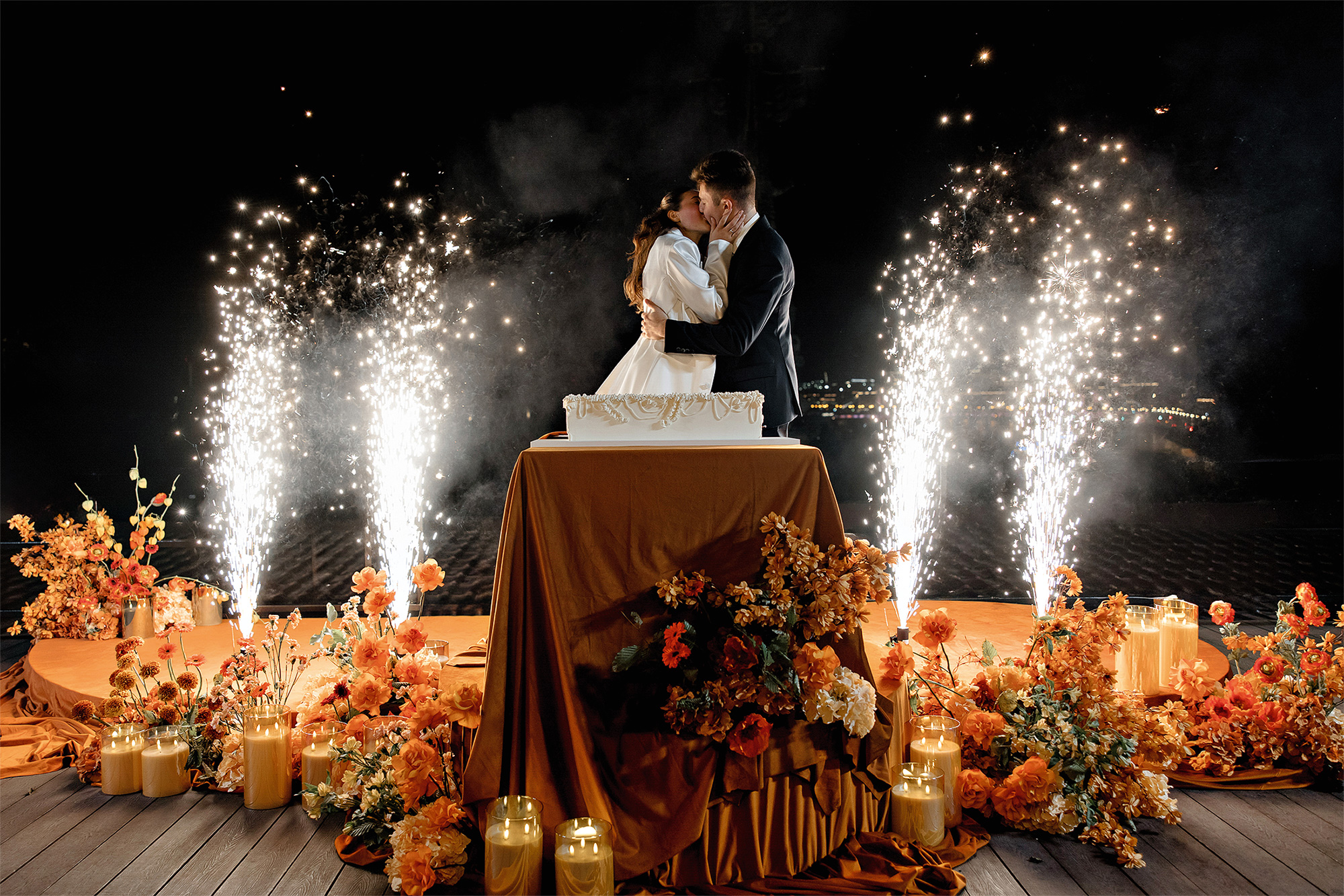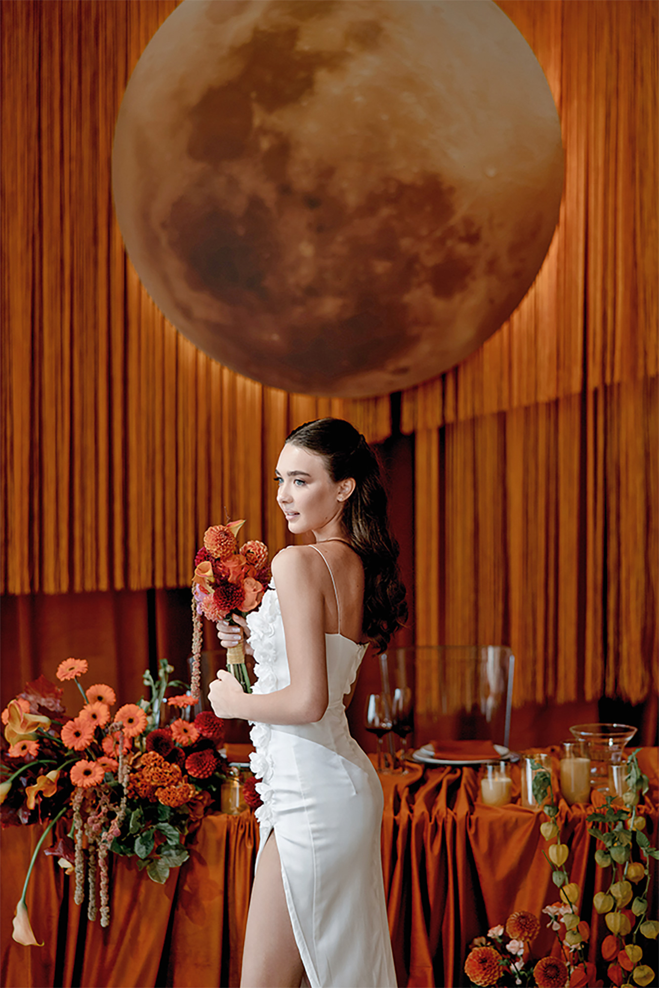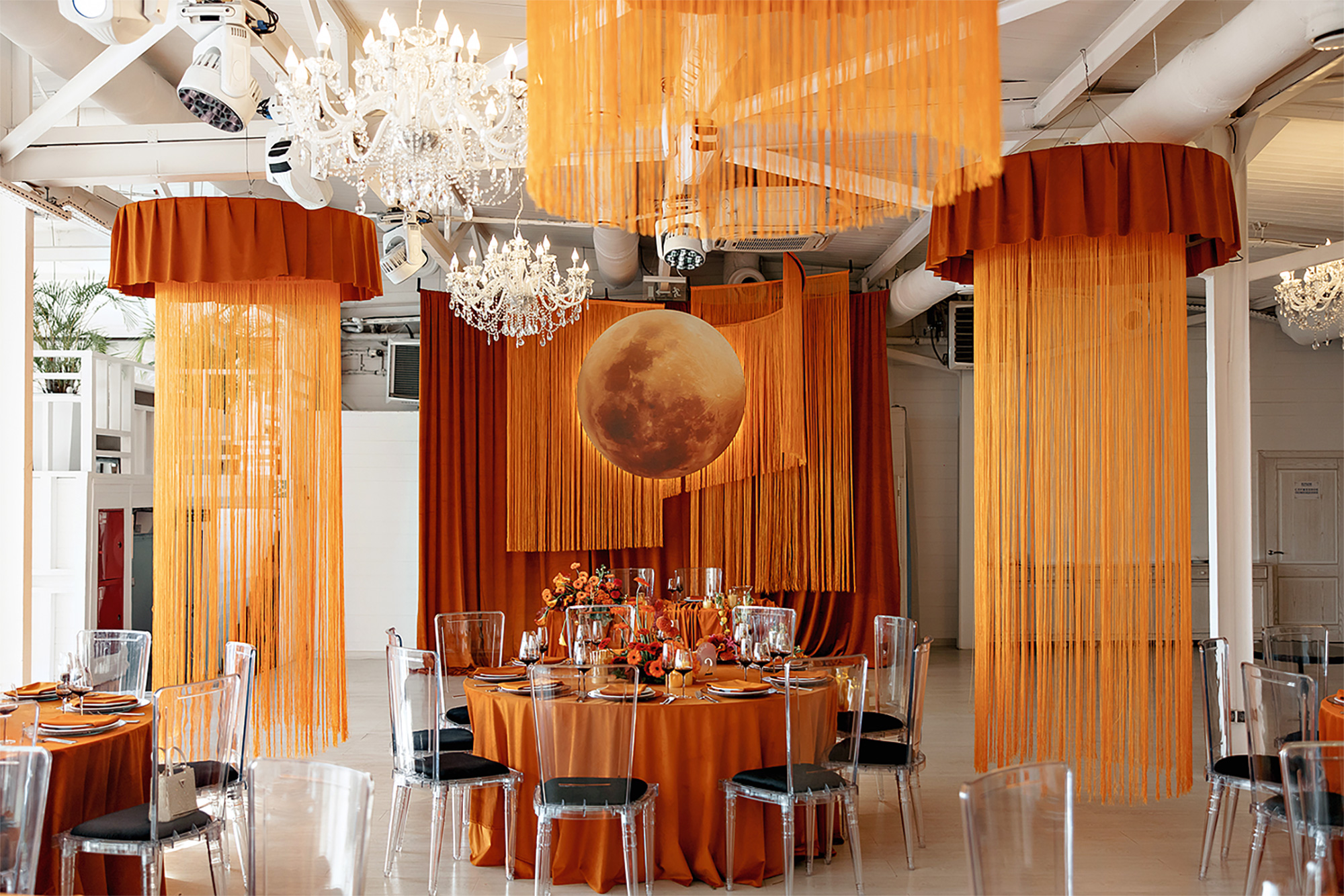 В декоре использовали сочетание трендового оранжевого с глубоким черным. Выбранная локация — веранда с открытой крышей в центре Москвы — буквально просила не заслонять потрясающие виды на город декорациями. Потому использовали низкие осенние композиции, бархатистые текстуры, ткани, подиумы, которые создавали уют без перегруза, не отвлекая от главного.