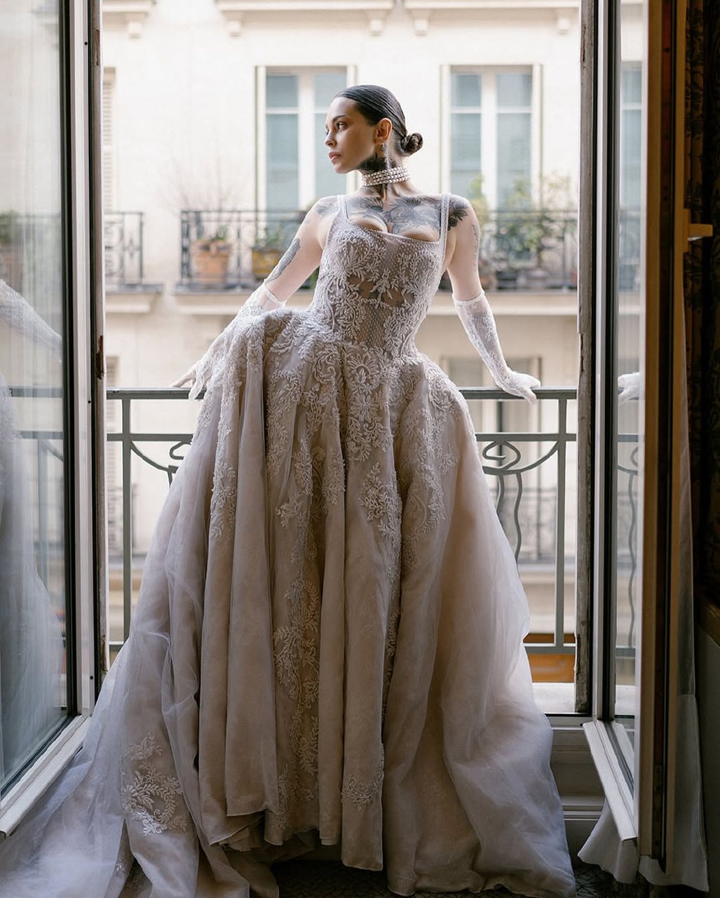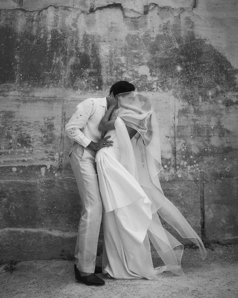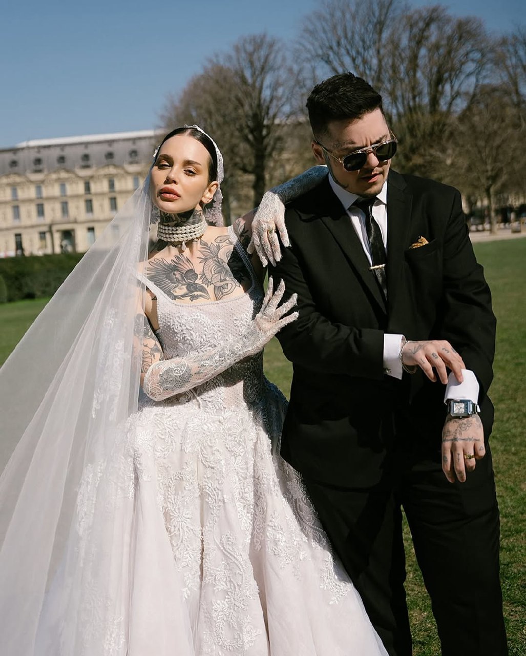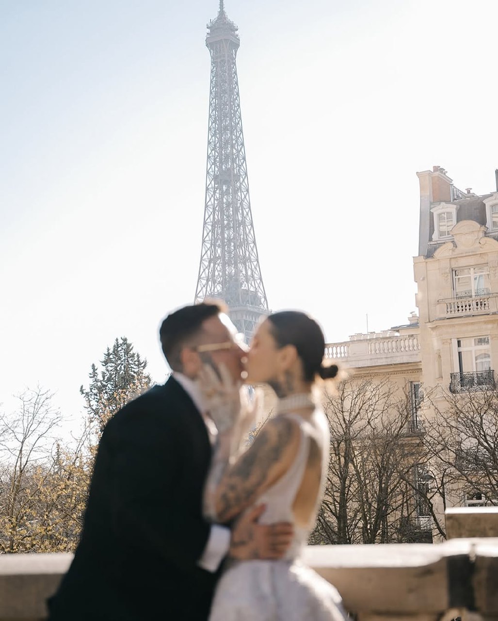 Бразильская пара Мария и Нико устроили камерную церемонию и бунтарскую фотосессию на фоне летнего Парижа. Классическая архитектору французской столицы контрастировала с альтернативным стилем пары, такой жест стал тихим манифестом — приглашением смело мечтать, любить и переосмыслить традиции.