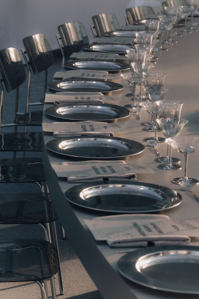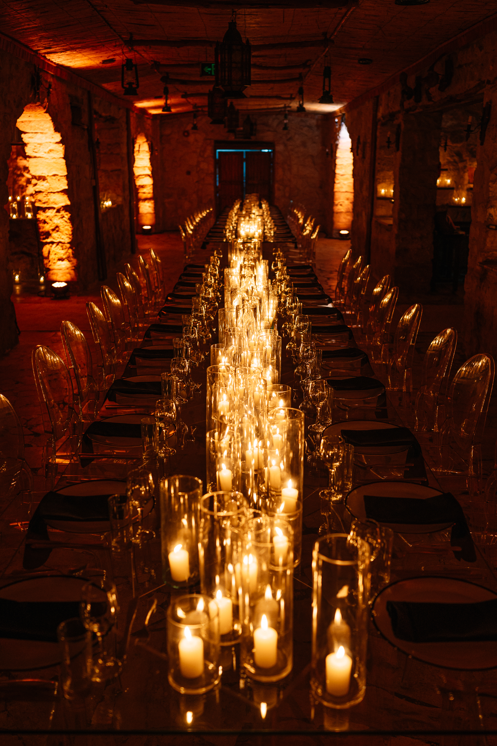 В центре оформления — прозрачные столы и стулья, будто растворённые в пространстве, отражающие мягкий свет и природную среду. Сотни свечей наполнили зал тёплым светом, создавая атмосферу тишины, уюта и торжественности.