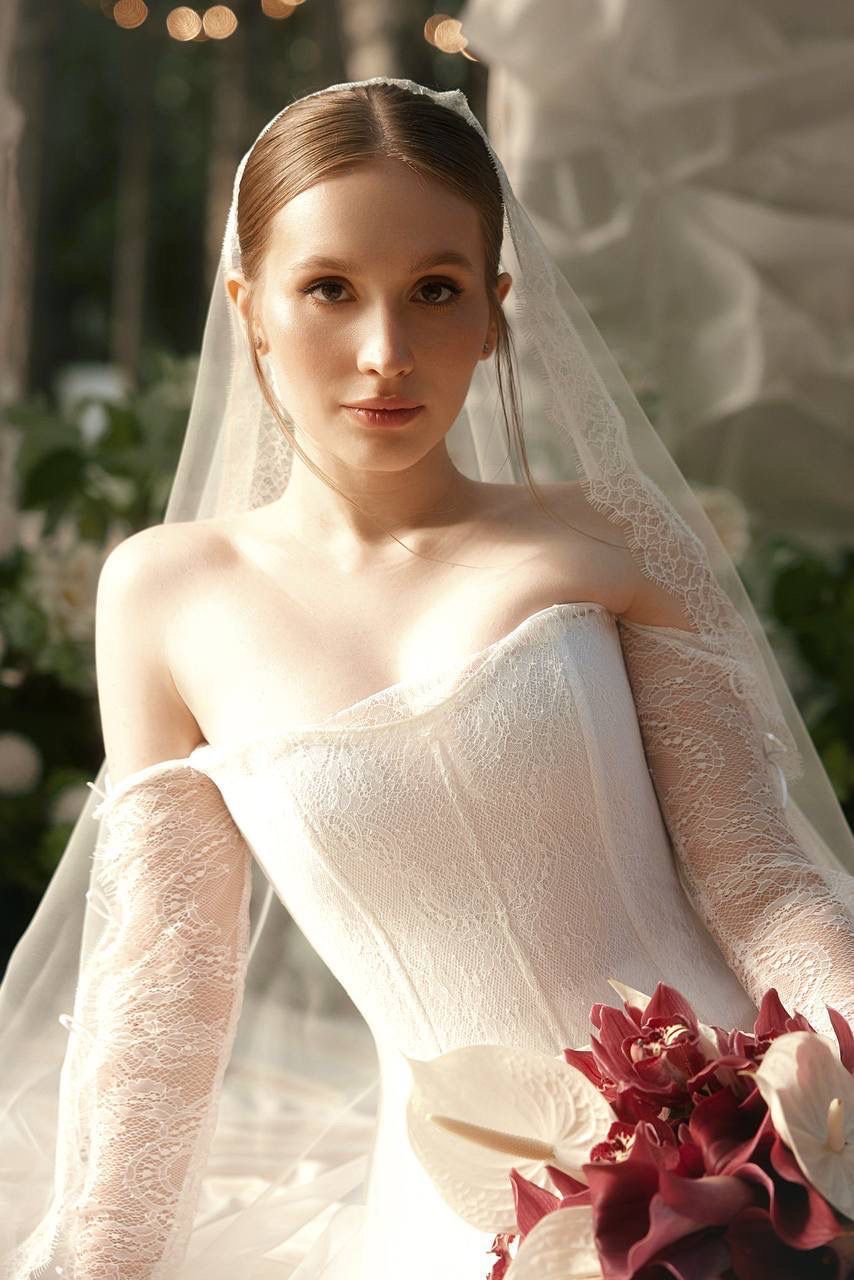 В день свадьбы два образа: первый — сказочное нежное кружевное платье-рыбка с фатой, второй — пышное заниженное платье с акцентом на талии.