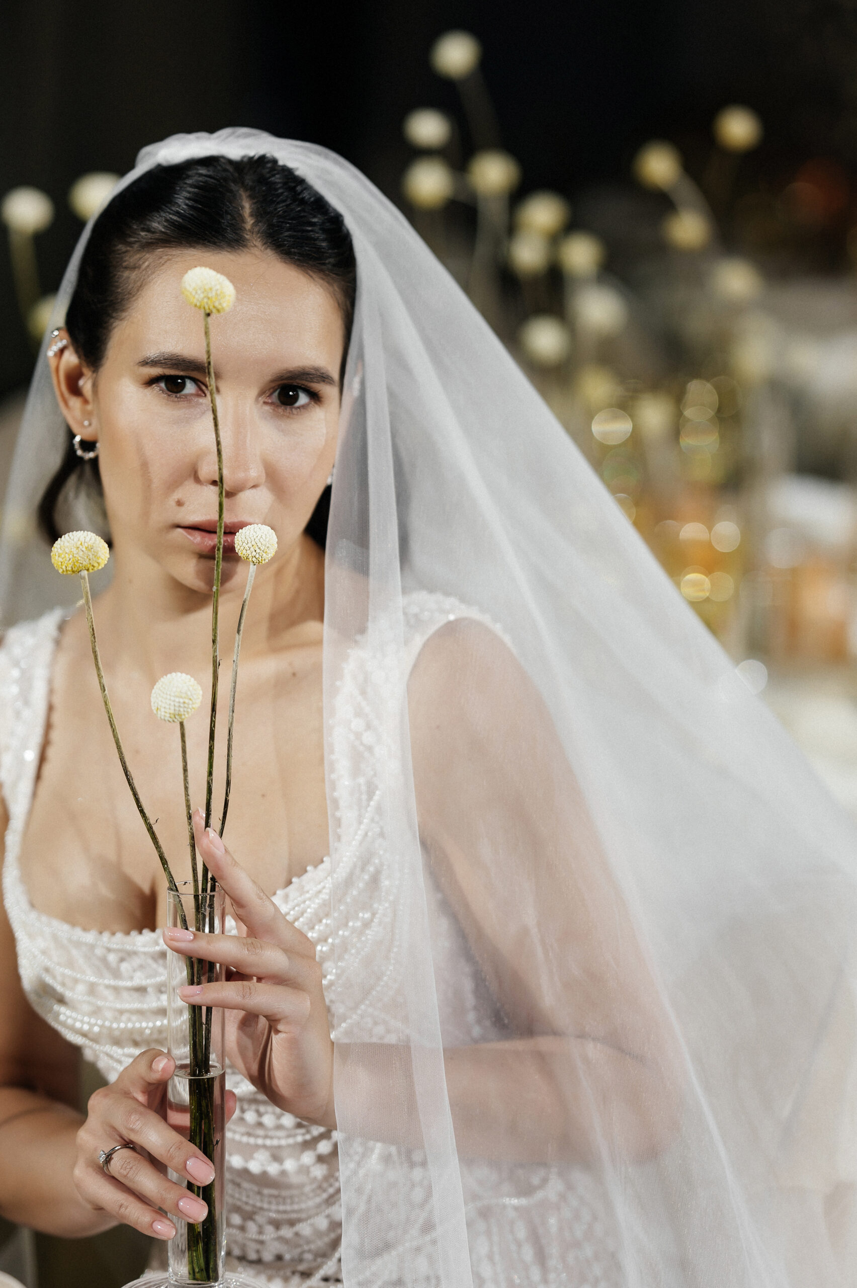 После определения концепции я принялась выбирать платье. Стилист Анастасия Лисицына и свадебный салон «Кураж» облачили меня в изящный образ, подобный тонкому хрупкому бокалу флюте. У меня было несколько образов: утро невесты в легкой расслабленной рубашке цвета сливочного масла, наряд на основную часть праздника и мини-платье для вечера и танцев.