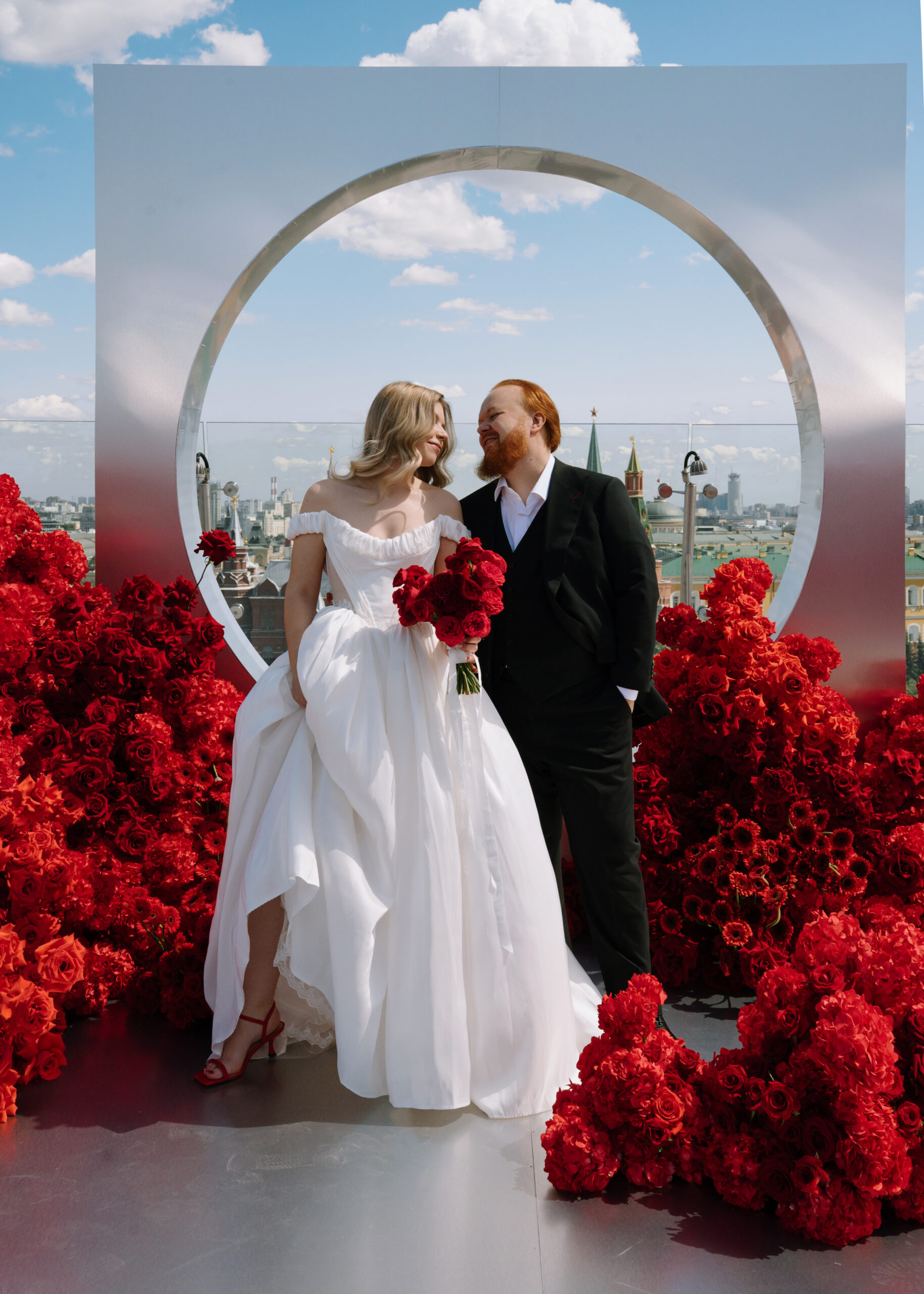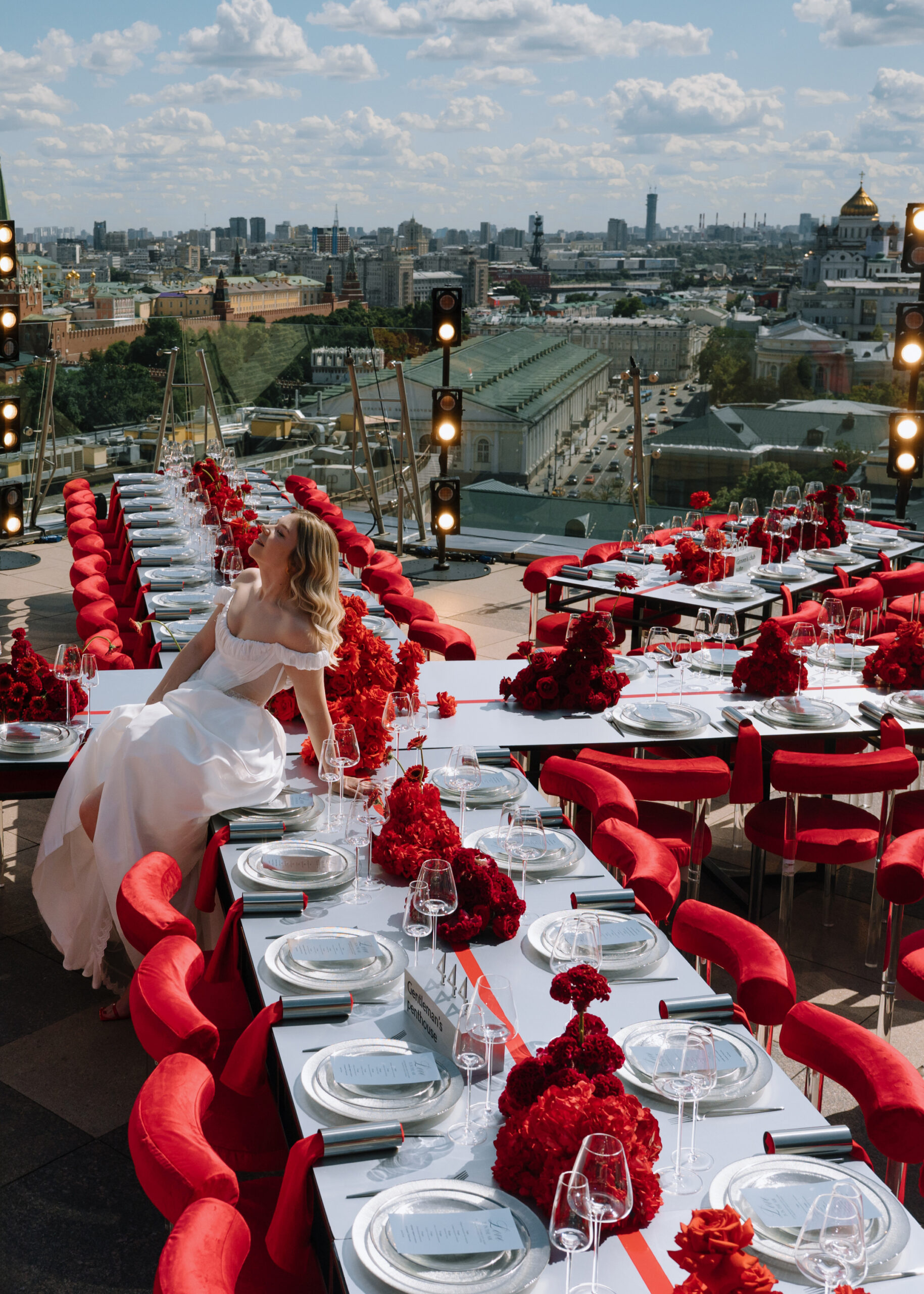 Наша свадьба состоялась летом прошлого года на крыше отеля The Carlton в Москве. Концепция называлась Suite. Love is in the air. Она была вдохновлена романтикой путешествий и атмосферой роскошных отелей. Мы с Сергеем много путешествуем, и нам хотелось передать это ощущение — легкость, высоту, воздух, элегантность.
