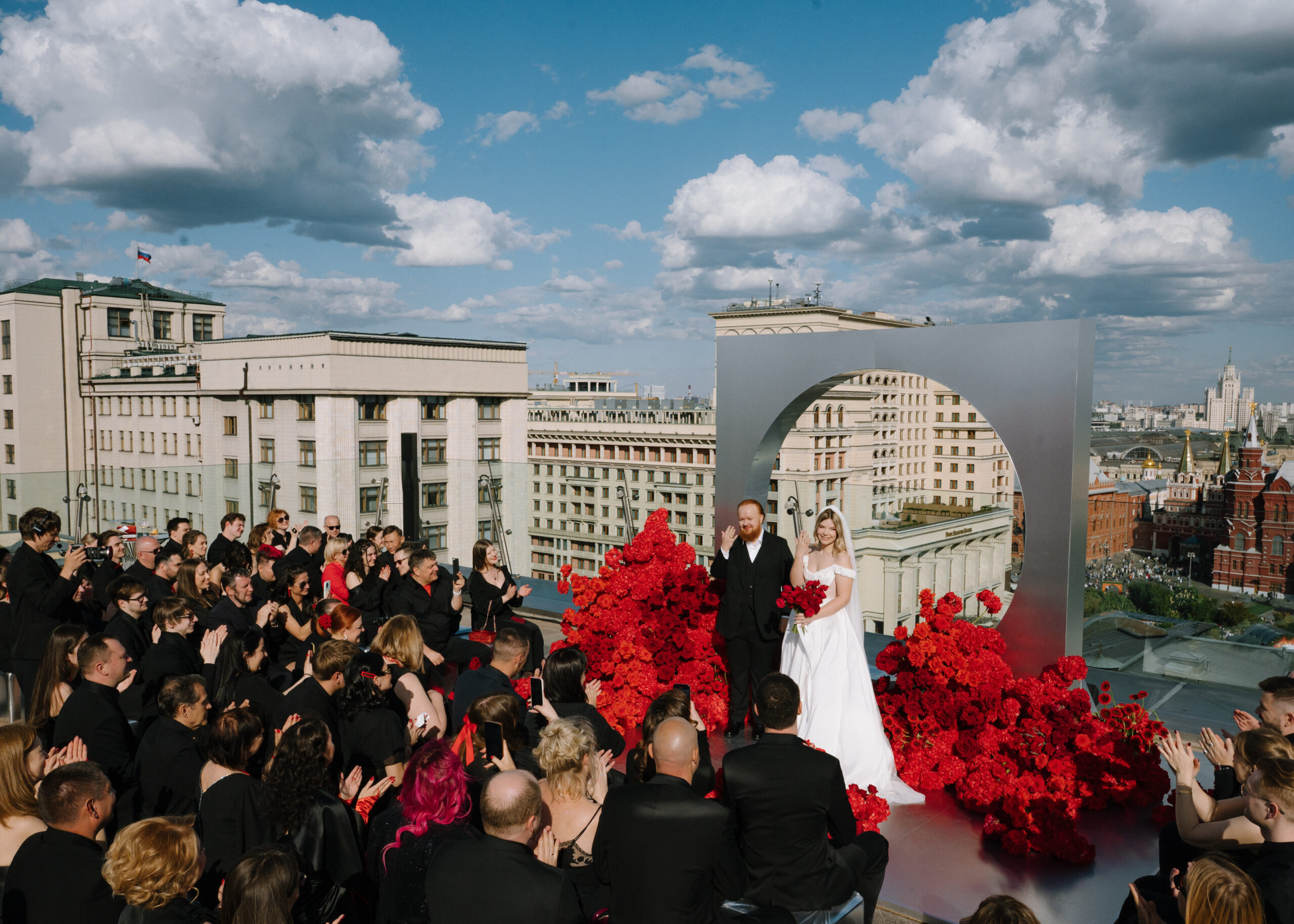 Свадьба проходила на крыше с панорамным видом на город — словно символ бесконечного горизонта нашей совместной жизни. Пространство ощущалось как наш люксовый номер, который собрал всех близких в одном месте.