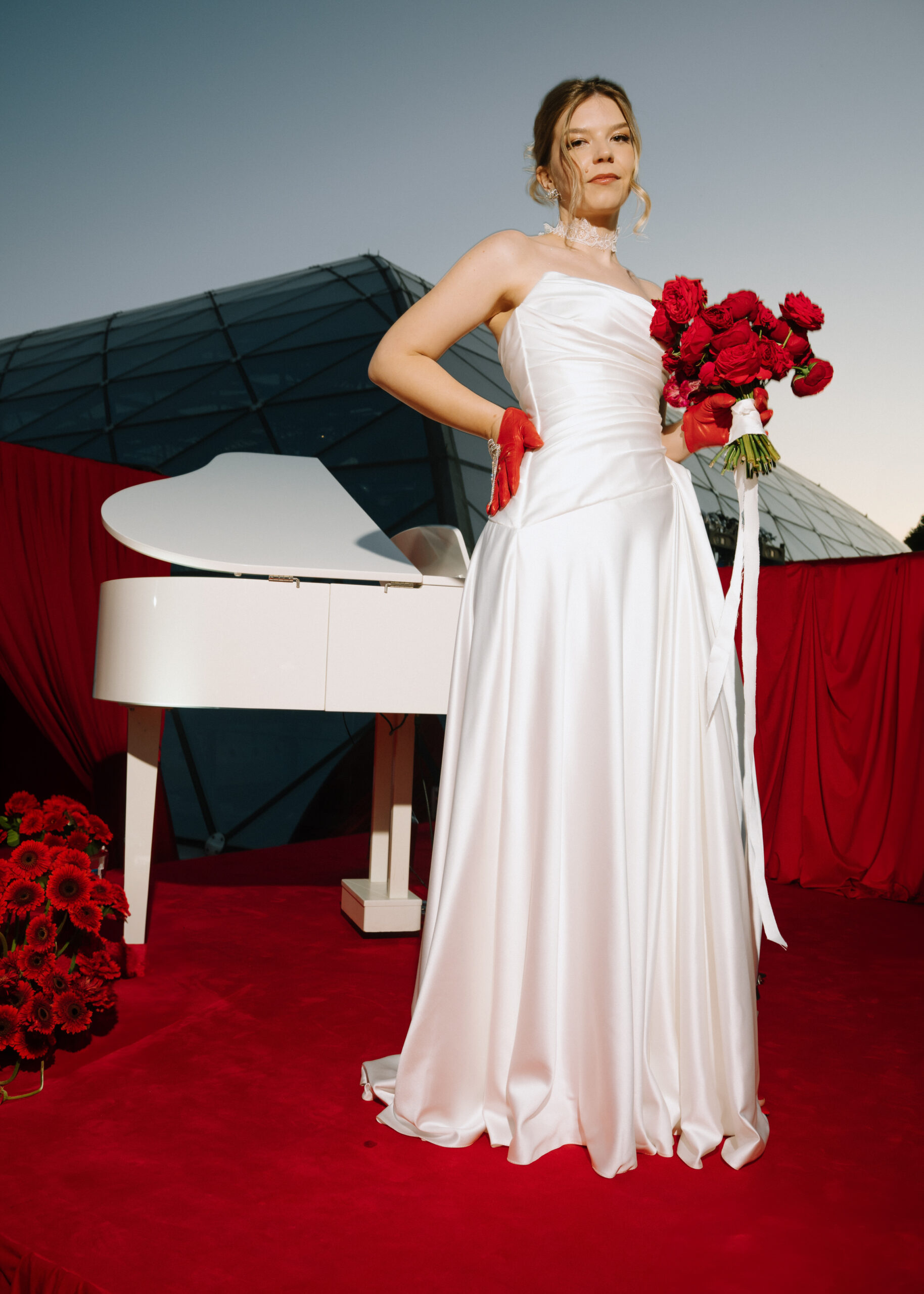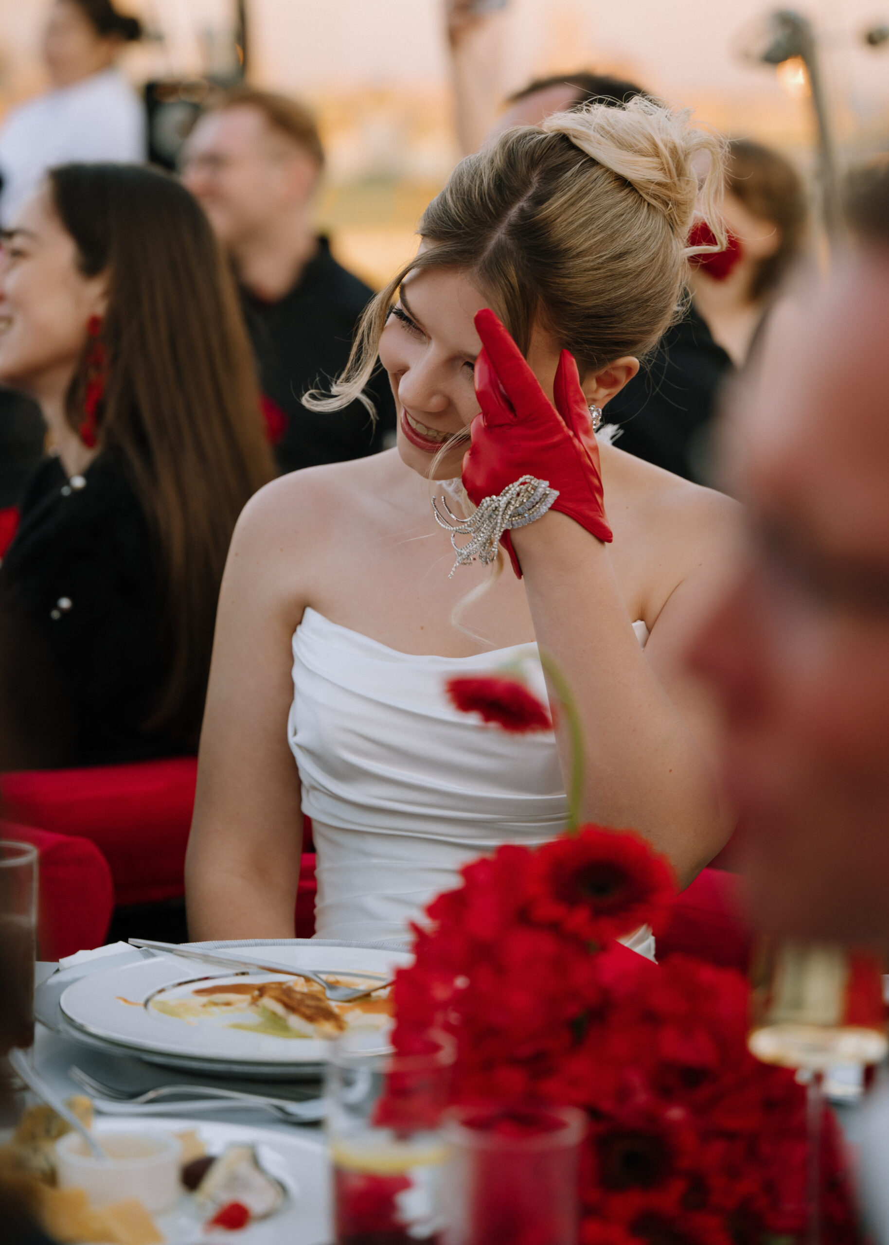 Во втором образе были роскошные перчатки — как красный акцент, так как вся свадьба была в красных тонах. При этом я отказалась от красной помады — для меня это было слишком.