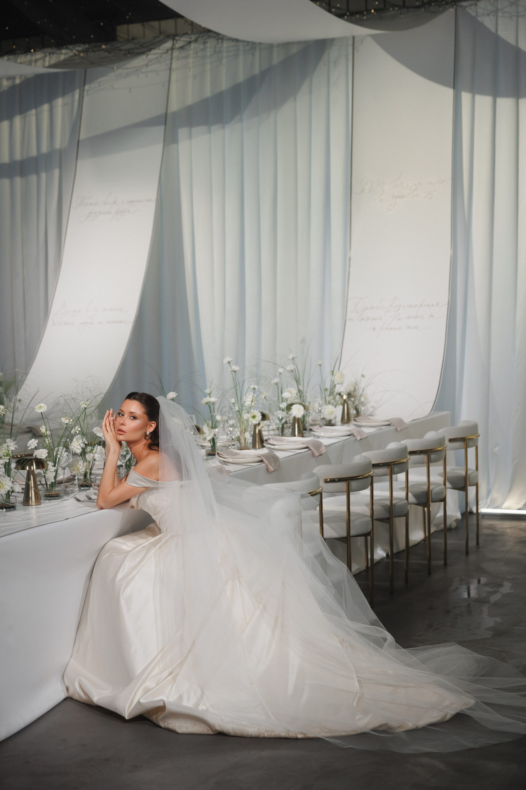 Сначала мы планировали проводить церемонию в ротонде, но потом поняли: мы увидим этот декор только один раз — в самом начале. А хотелось, чтобы атмосфера и визуальная часть жили с нами весь день. Так появилось решение полностью задрапировать площадку — превратить ее в чистый холст, на котором мы расскажем свою историю.