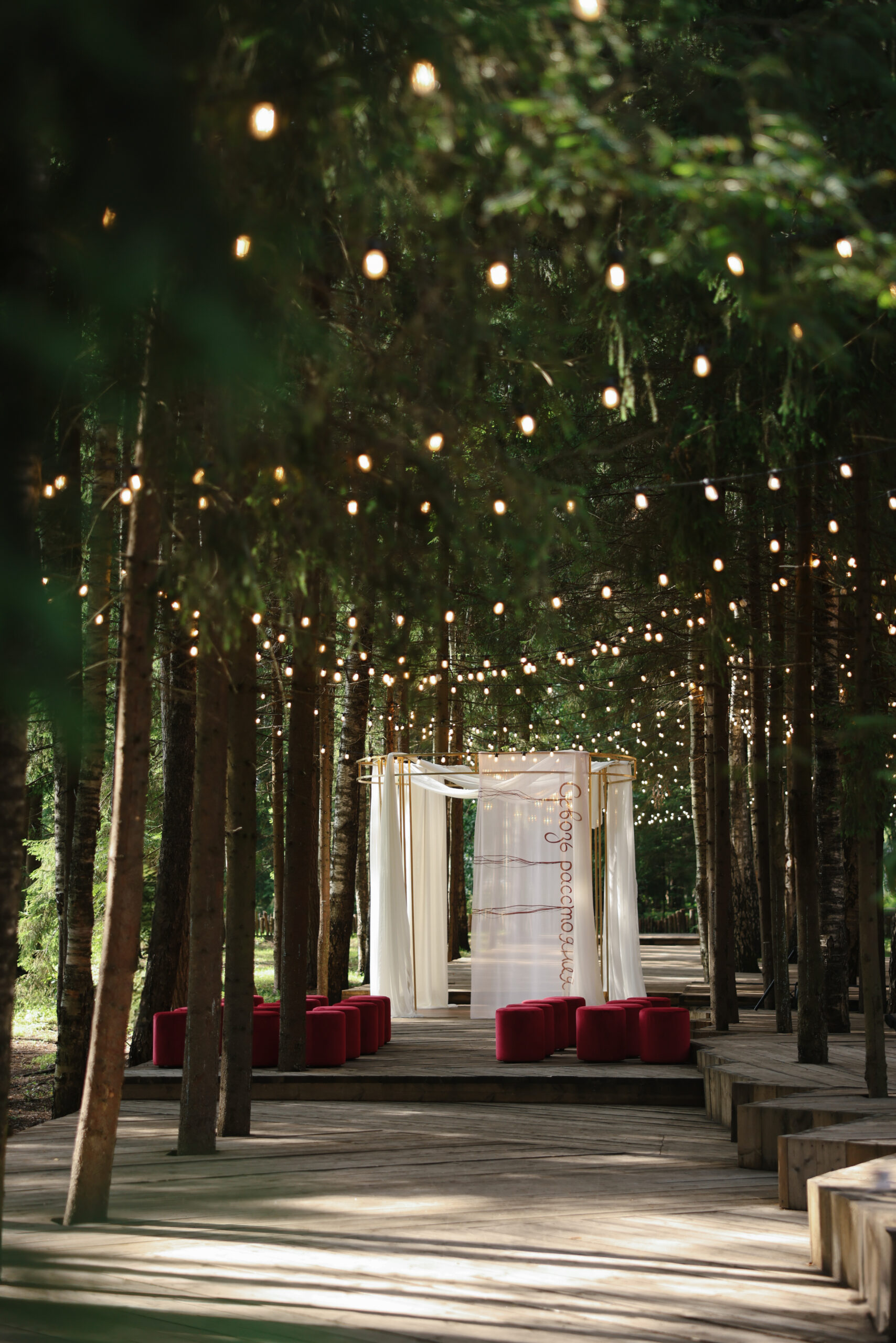 Мне всегда хотелось свадьбу в лесу — с высоким хвойным лесом, ощущением пространства и воздуха. Так родилась наша концепция «Сквозь расстояния». Она отсылала к тому, что наши отношения начинались на расстоянии: когда я впервые написала Никите, что скучаю, он взял билет на день раньше и прилетел ко мне. Мое сердце расстаяло окончательно.