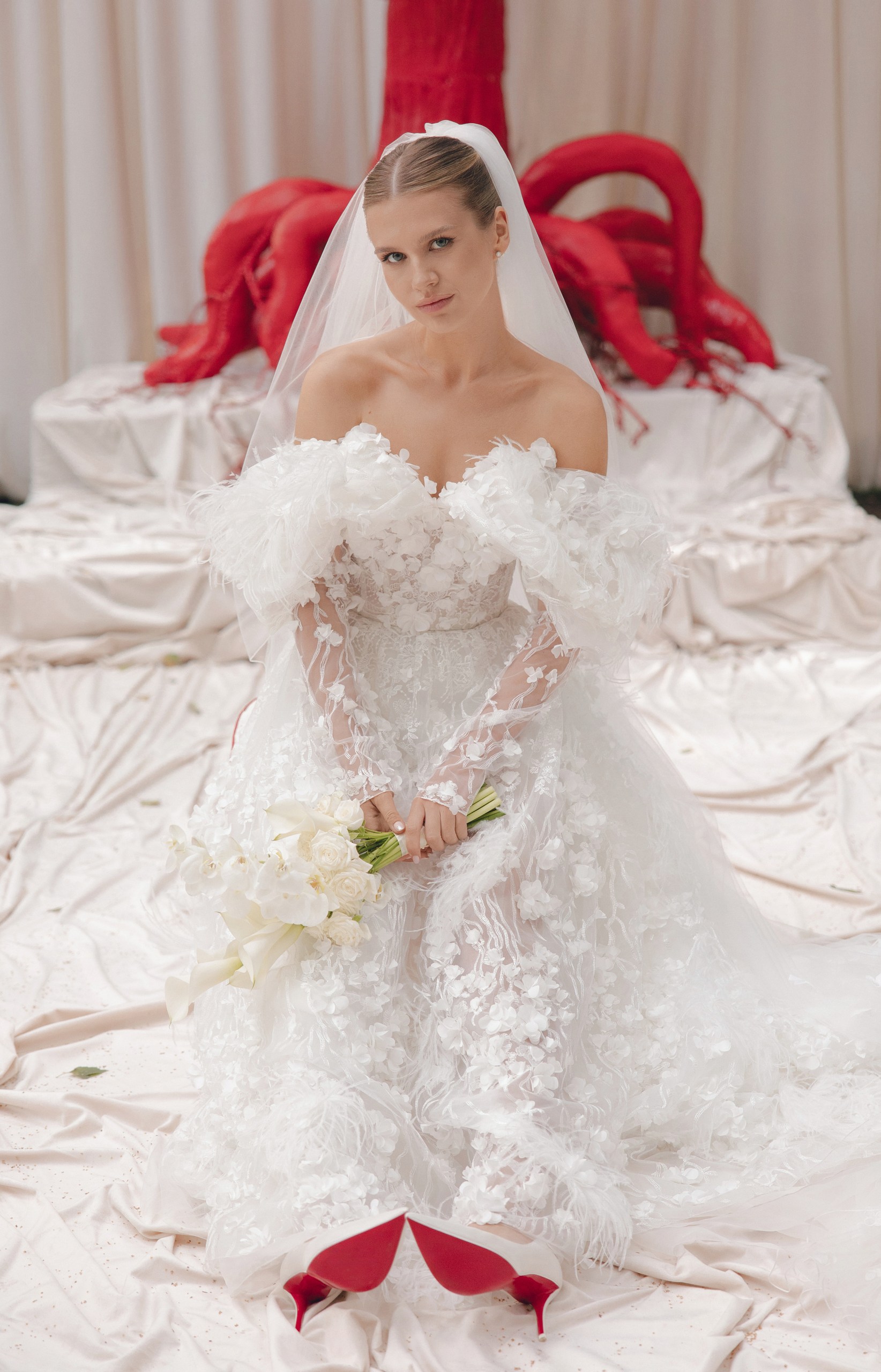 У меня было два основных образа в день торжества и наряд на утро невесты, в котором я вышла на welcome, чтобы поздороваться с гостями и разделить их волнение перед началом церемонии. До начала подготовки я мечтала об элегантном, строгом и лаконичном платье от Вивьен Вествуд или Веры Вонг, как и большинство невест. После длительных попыток найти то самое платье и многочисленных примерок, остановилась на российском дизайнере. Во время первого посещения ателье, после примерки нескольких моделей, менеджер предложил мне попробовать посмотреть платье — я совершенно не так представляла себе свадебное платье, поэтому нехотя согласилась, в глубине души понимая, что, скорее всего, это будет не мой вариант. Но это оказалась любовь с первого взгляда, и действительно, как показывают в фильмах, что-то екнуло внутри, когда я посмотрела на себя в зеркало. Сразу после я примерила другое платье, после чего стало ясно, что с одним образом я не уйду. Макияж и прическу было несложно выбрать, поскольку обилие кружева, перышек и мелких деталей на платье «требовали» спокойного и элегантного образа. Мне очень помогла визажист и стилист по волосам Дарья Алиханова, поскольку у меня не было большого опыта в подборе конкретных вариантов.