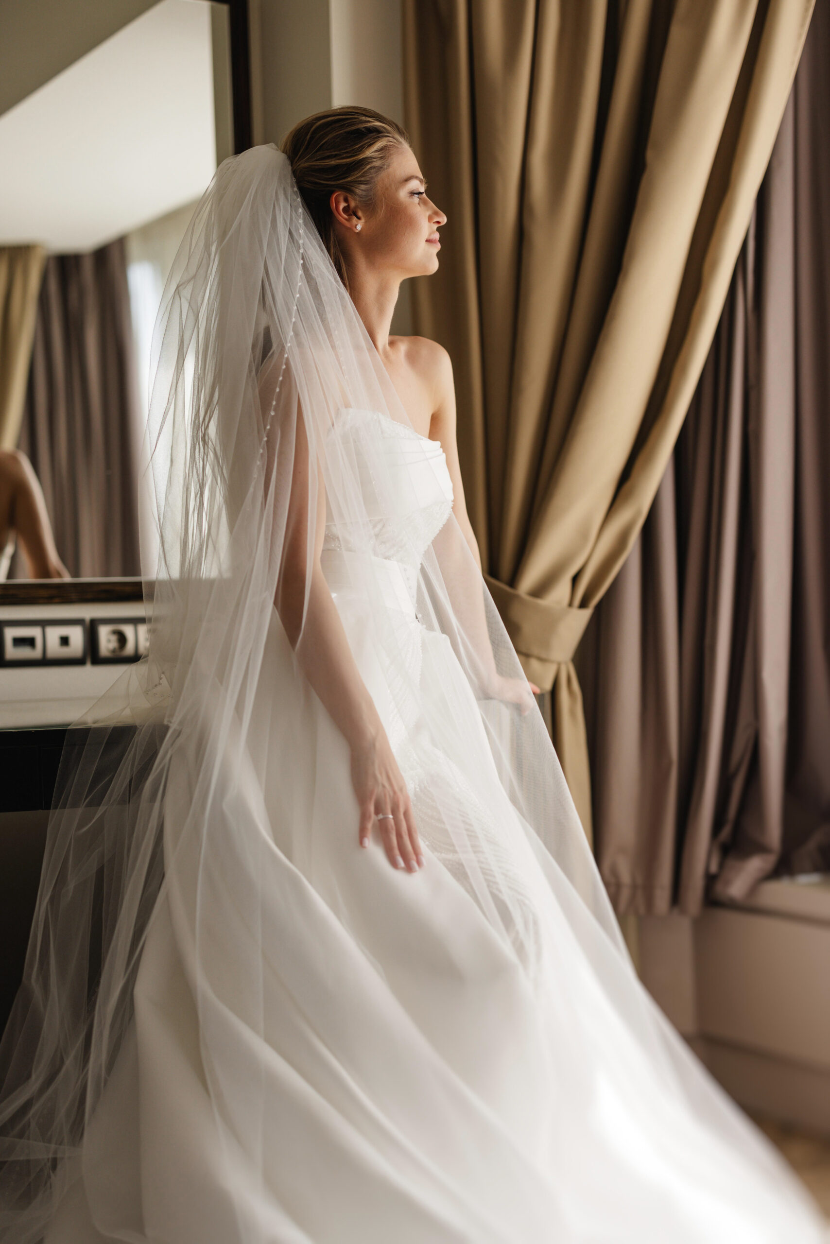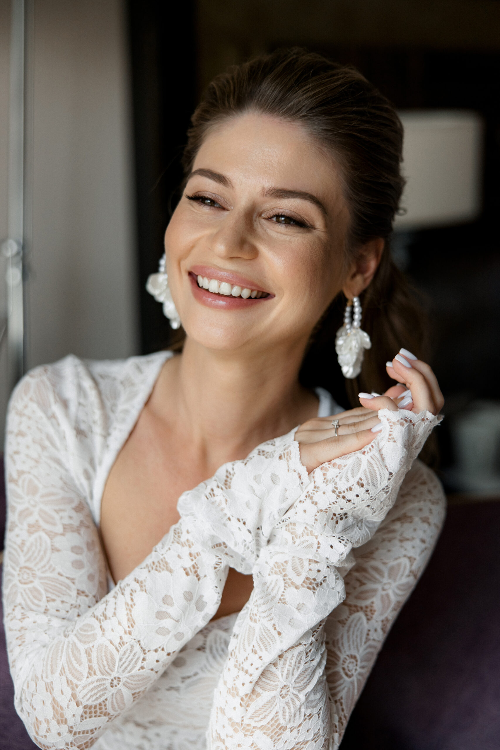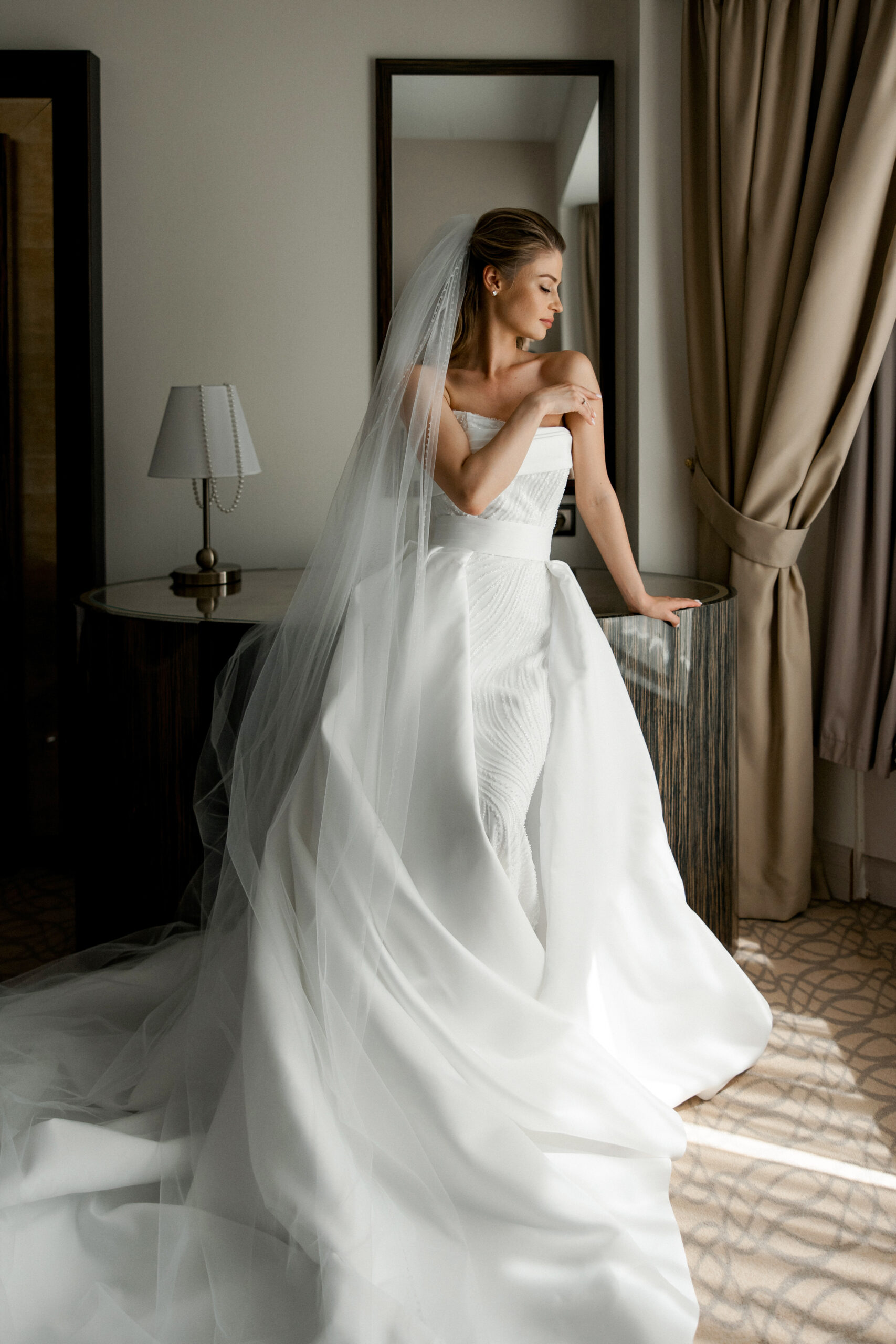 На свадьбу у меня было два платья: одно — для утра невесты, над выбором которого я долго не думала, и второе — основное, силуэтное, с отстегивающимся шлейфом. Изначально я искала другую форму и потратила много времени на примерки, пока не нашла «то самое» платье. Макияж я хотела максимально естественный и натуральный, чтобы подчеркнуть свои черты, сохранив легкость и гармонию образа.