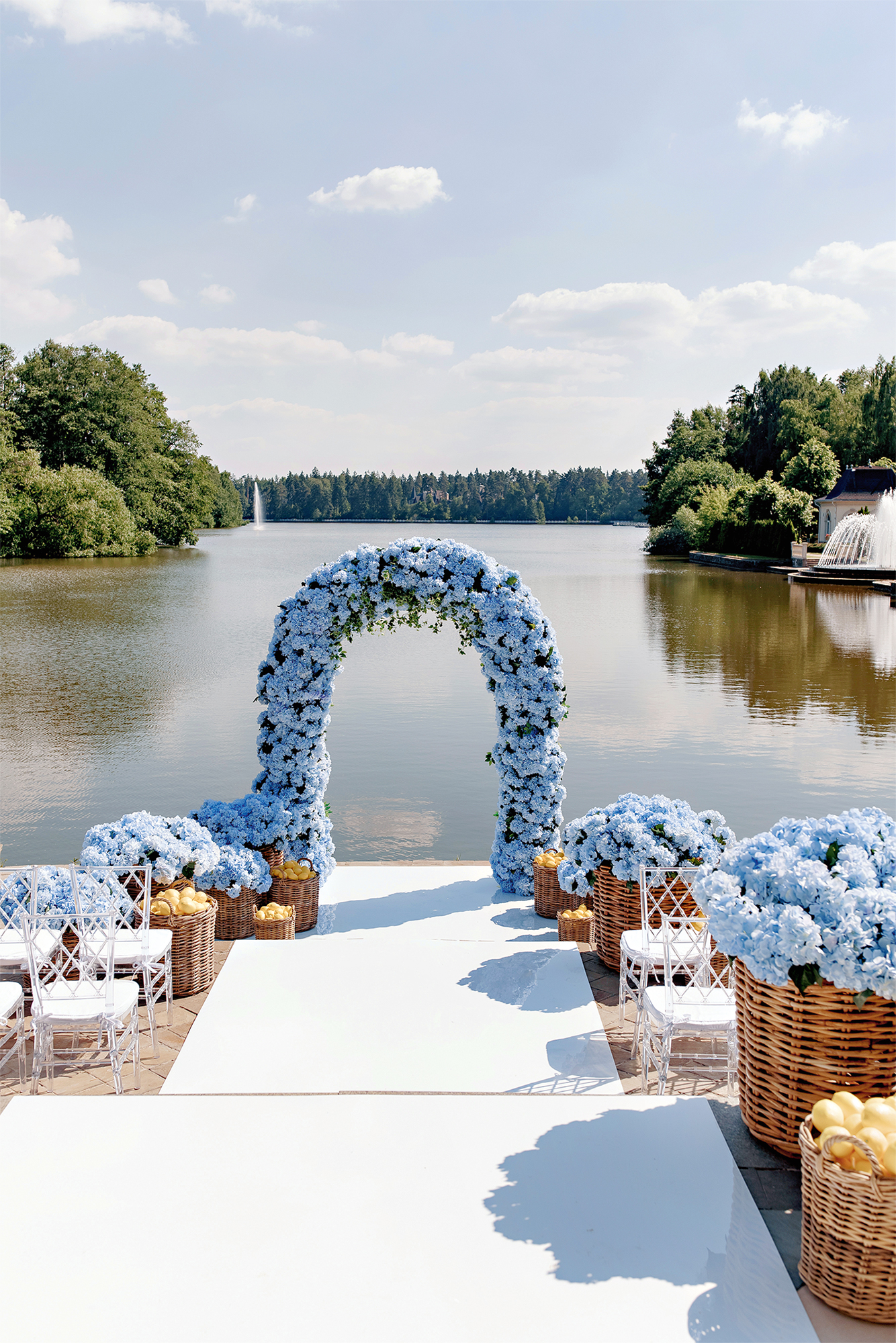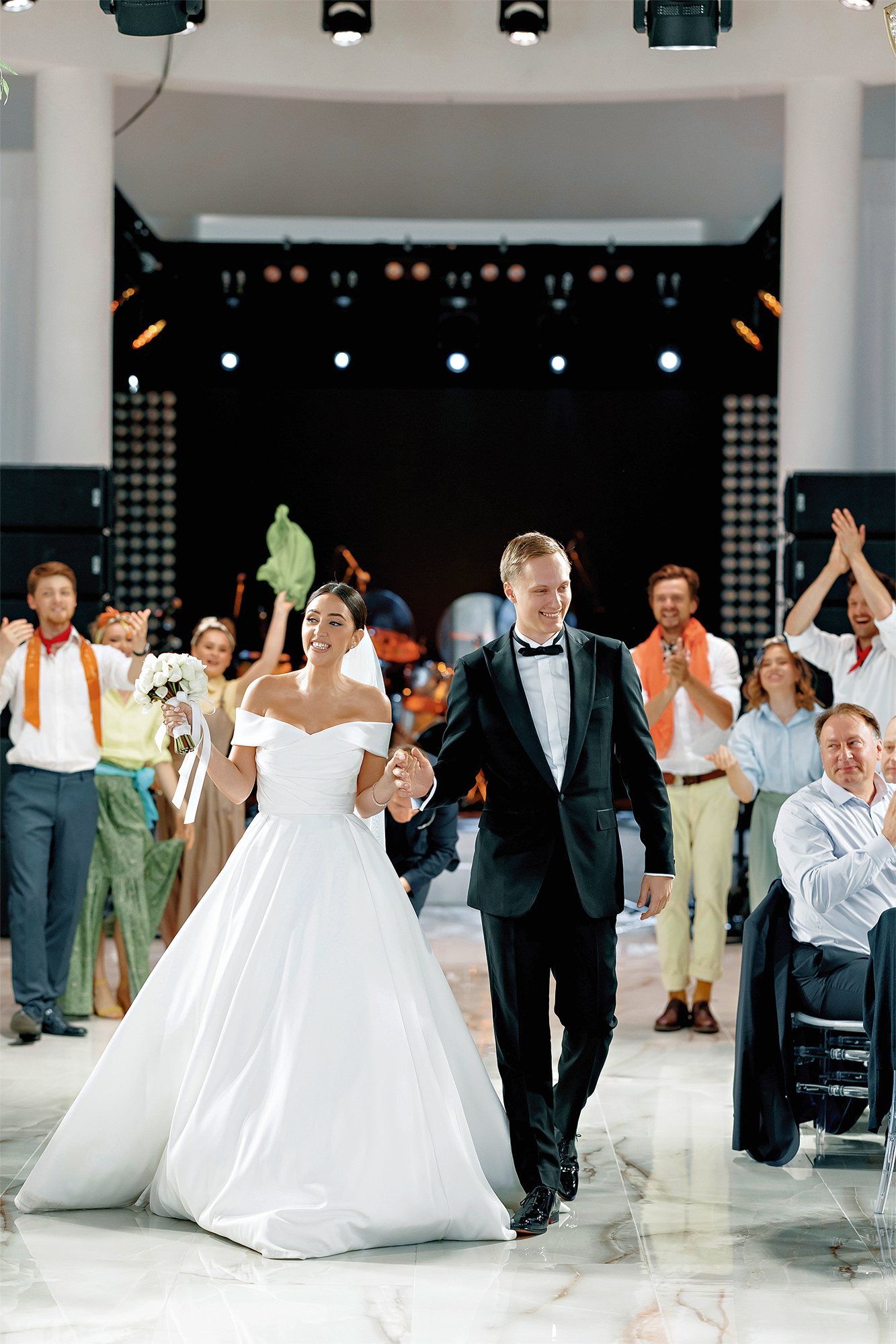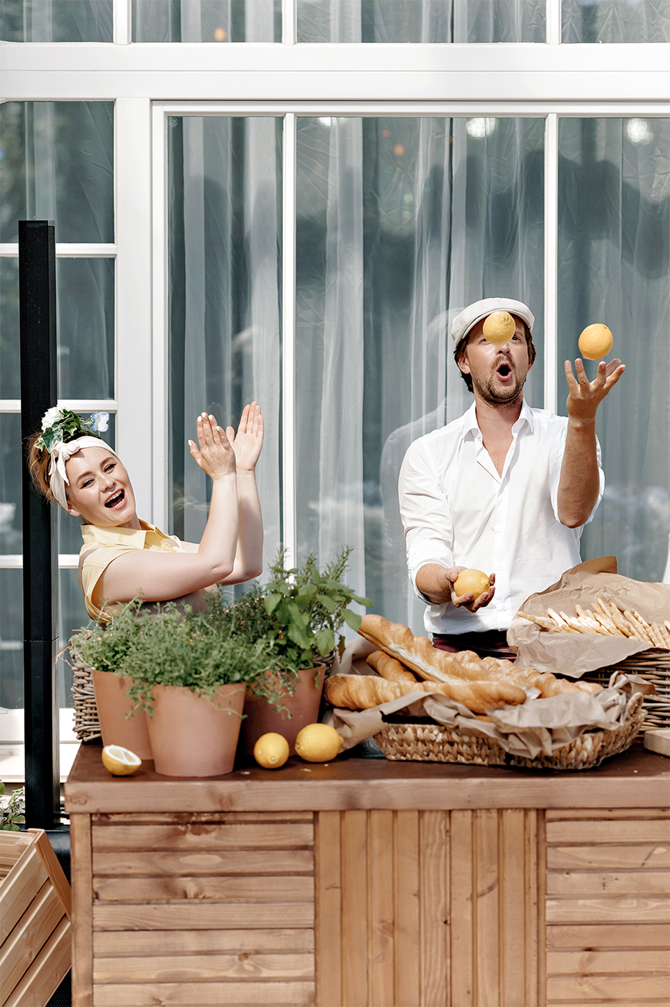 Подмосковная «Вилла Ротонда» на один день превратилась в вымышленный южно-итальянский городок, в котором царит неповторимая атмосфера вечного праздника: на одном углу стоит тележка с мороженым, на другом — прилавок с хамоном и сыром, а рядом выпекают пиццу. И все это сопровождается живой музыкой на характерных для региона инструментах — мандолине, губной гармошке, свирели. Ну, а веселые жители этого городка увлекают гостей свадьбы в свой мир с помощью иммерсивных элементов шоу и ненавязчивых диалогов. Погружение с головой гарантировано — в городе даже выходит местная газета, в которой красочно описана история любви нашей пары.
