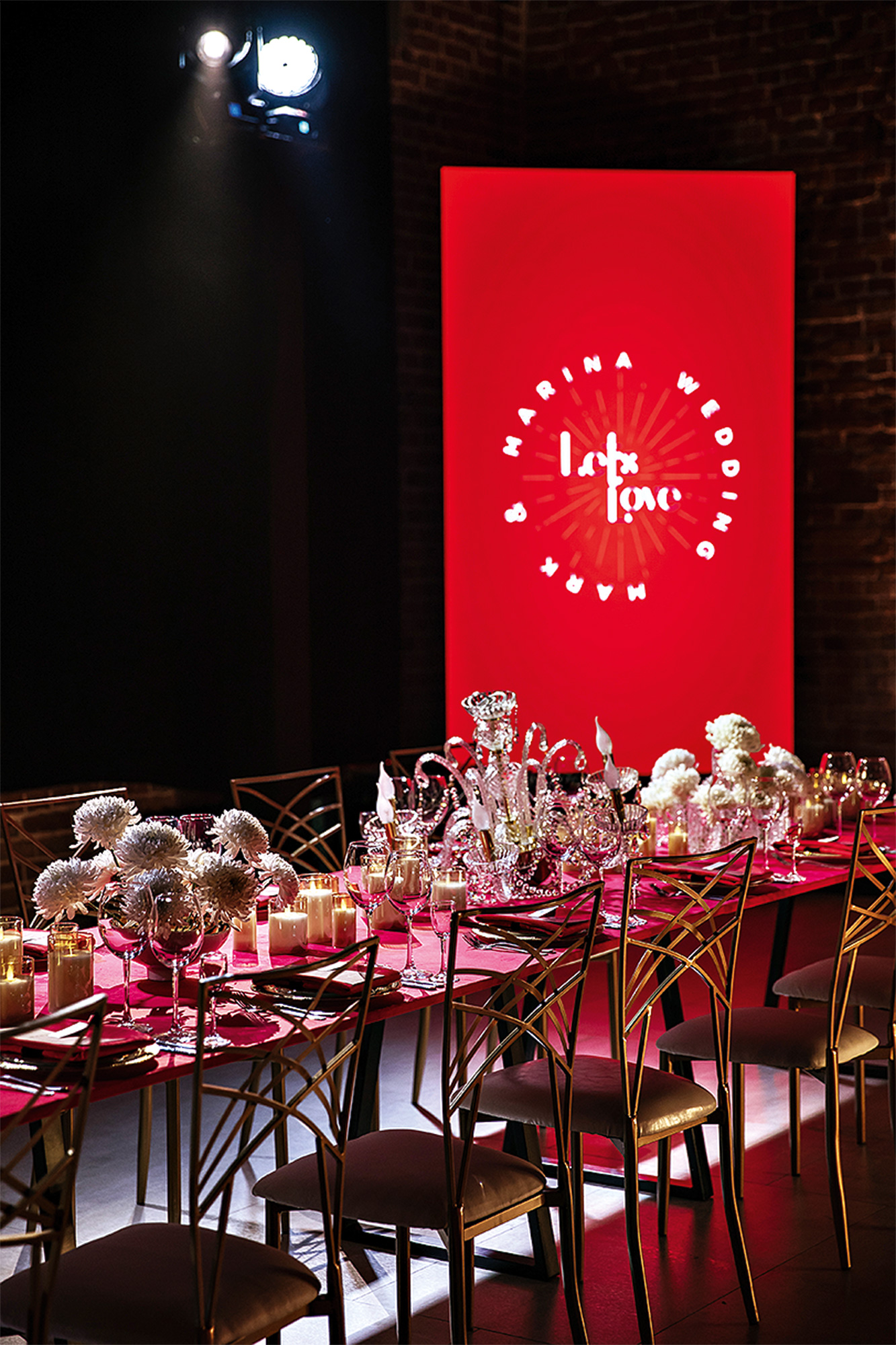 Страстные, чувственные и свободные Марк и Марина хотели разделить свой самый счастливый день только с близкими. Поэтому White Pepper Wedding предложили им идею закрытого клуба под названием Let’s Love, где таинство любви сочетается с легкостью. Так родилось секретное комьюнити, в котором эмоции пары могли раскрыться полностью. Стандартный лофт превратили в аристократическое пространство художественной галереи, где гости погрузились в атмосферу приватности и эксклюзивности. За основу оформления взяли сложный красный цвет, который элегантно воплотили в декоре. И дополнили его изысканными деталями — свечами, хрустальными элементами и нежными белыми цветами.