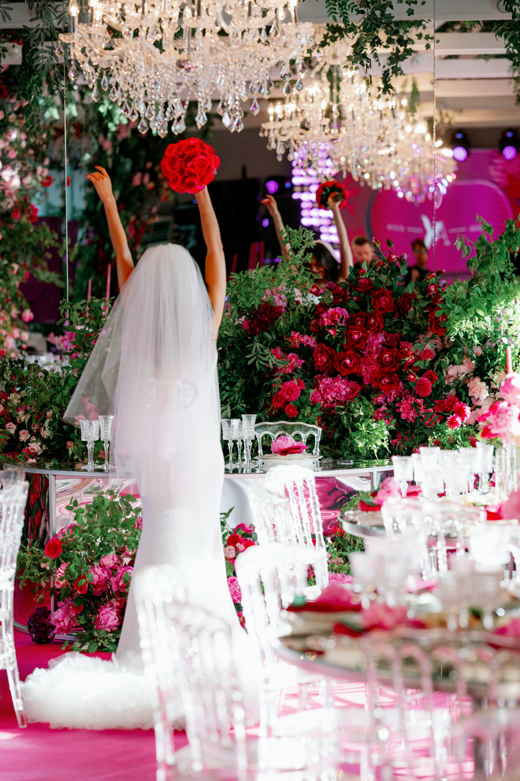 Катя одна из самых нежных невест, с которыми нам доводилось работать, — милая, тонкая и очень женственная. При этом она мечтала о максимально яркой и необычной свадьбе. Посоветовавшись с декораторами, мы выбрали концепцию, в которой объединили множество оттенков, буйство красок, огромное количество живой зелени и цветов.