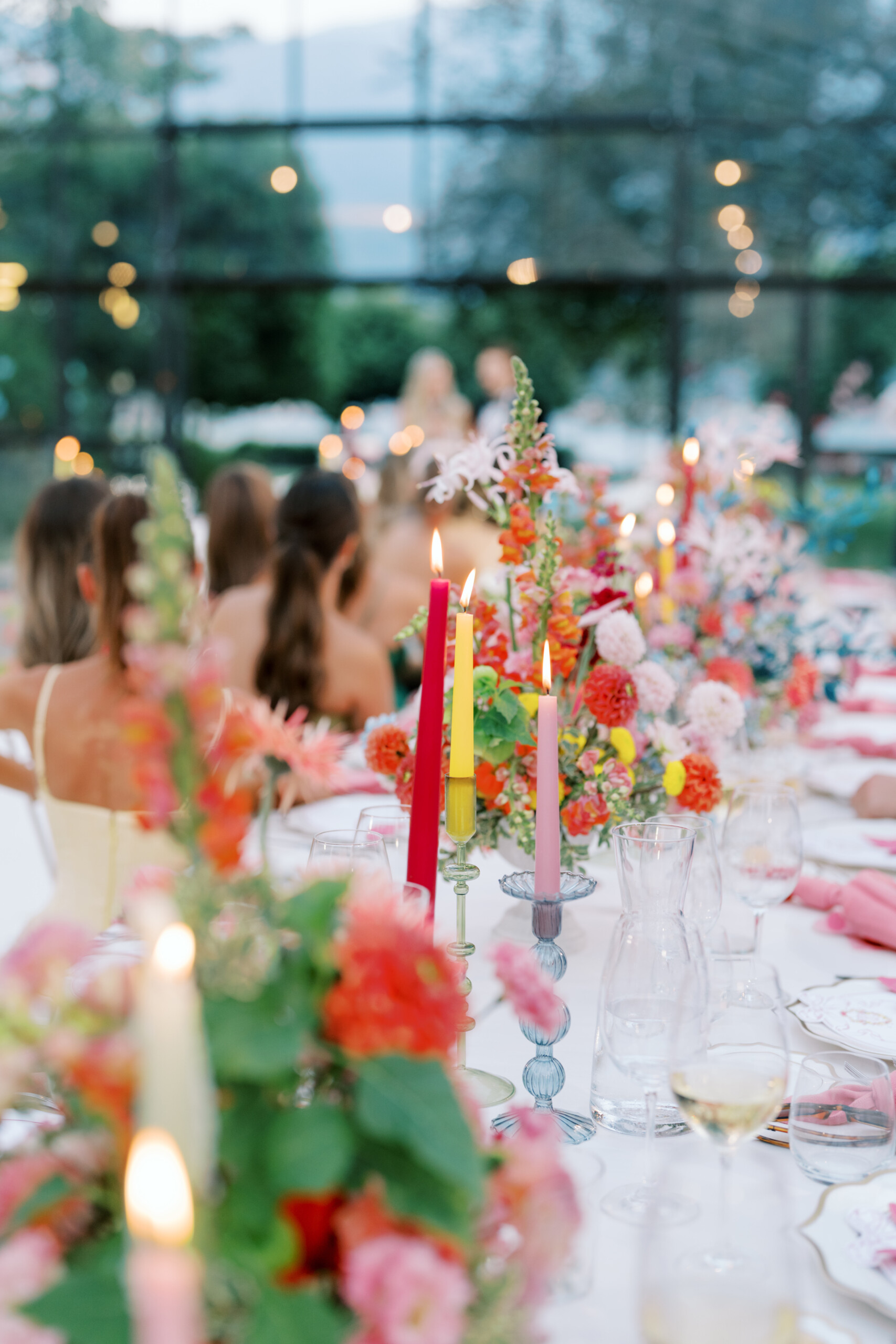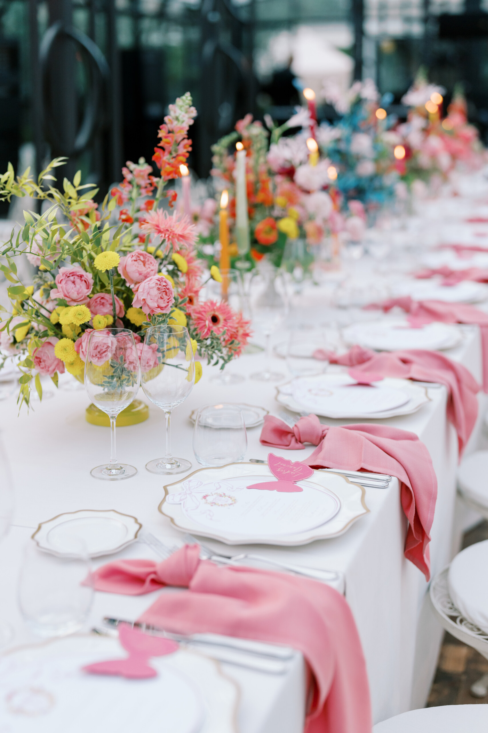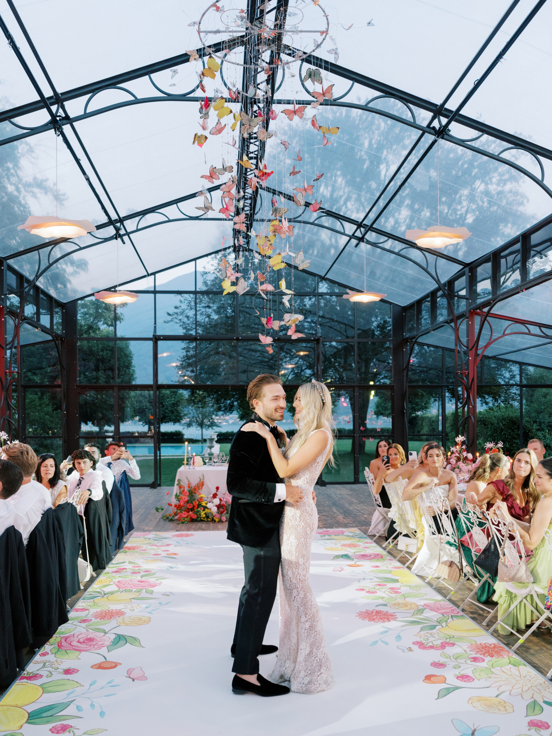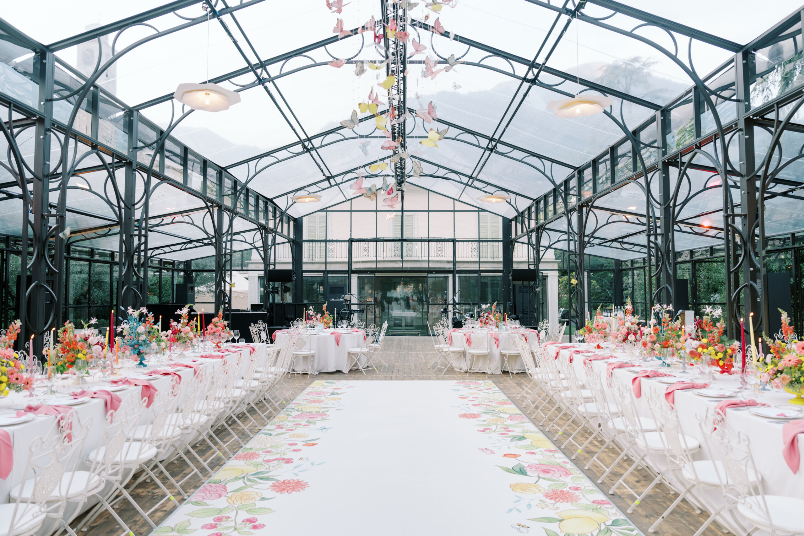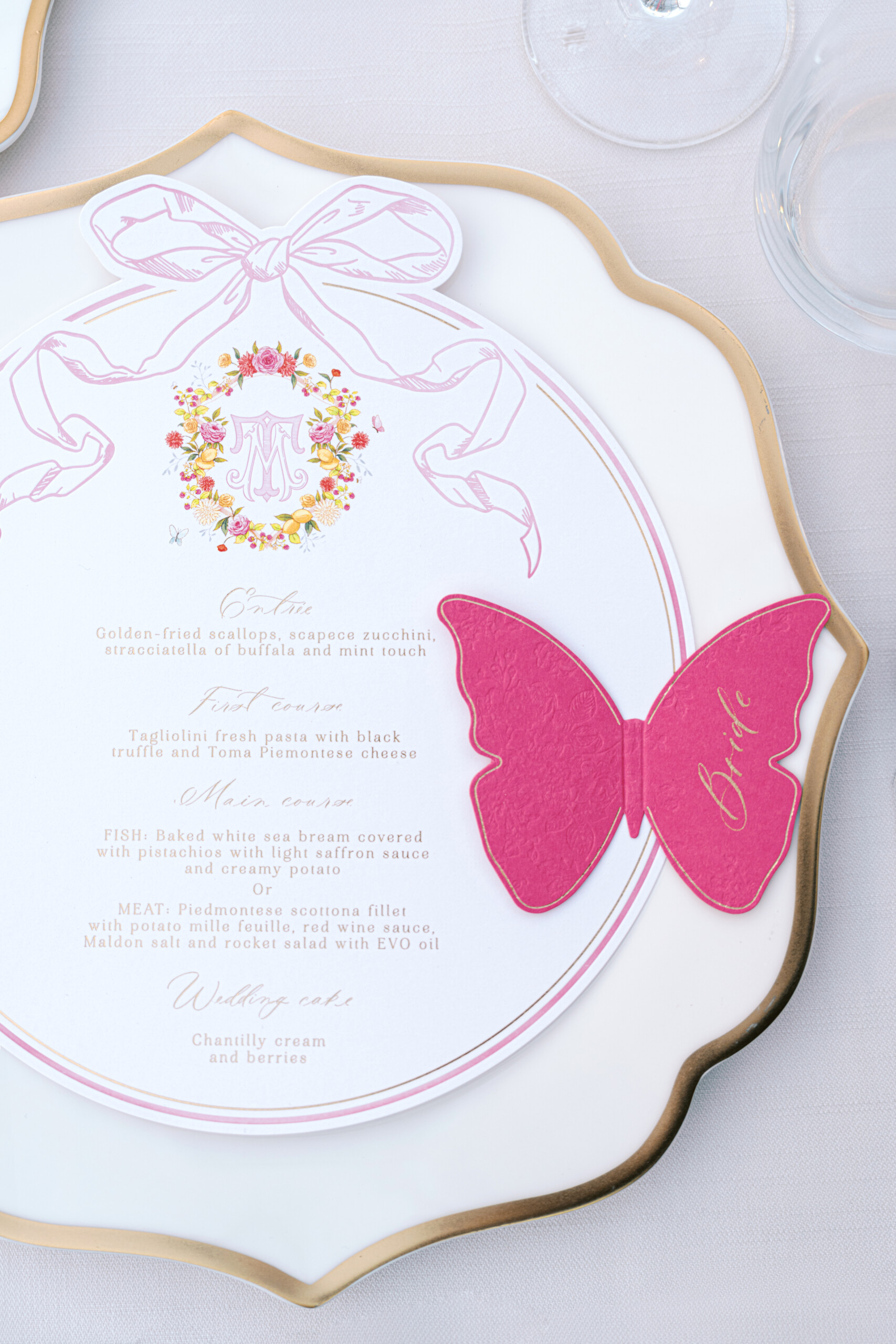 Бабочки парили над цветочной аркой на церемонии и под сводчатым потолком шатра в зоне ужина, оживали на танцполе и присаживались на тарелки гостей. Рассадка была выполнена на карточках-бабочках разных цветов, каждый цвет соответствовал одному из столов гостей. Интересной особенностью декора ужина стало то, что каждая цветочная композиция на столах гостей была создана с уникальным набором оттенков и цветов, который не повторялся. Любимый питомец пары — сибирский хаски по имени Аполлон не приехал с ними в Италию, но его красивый портрет приветствовал гостей свадьбы с монограммы на салфетках.