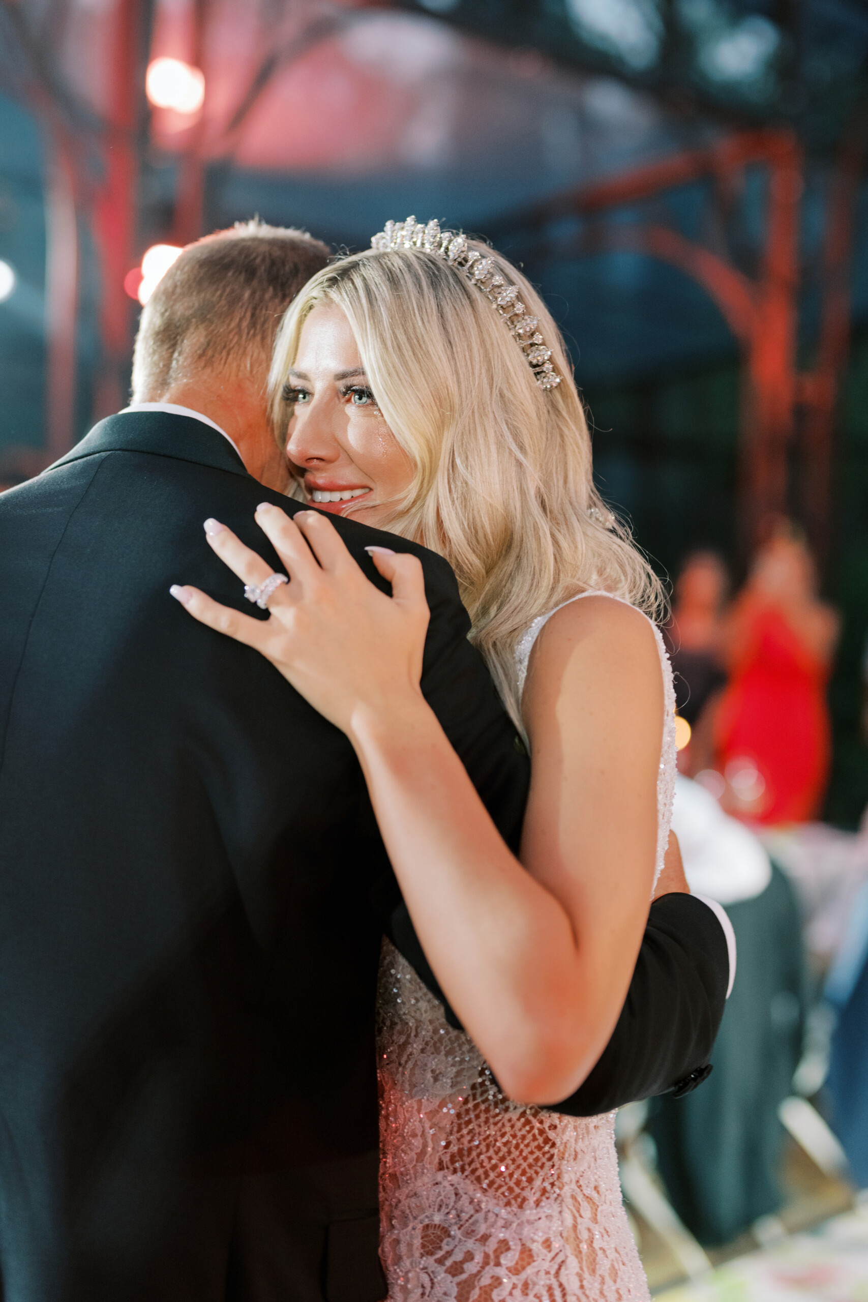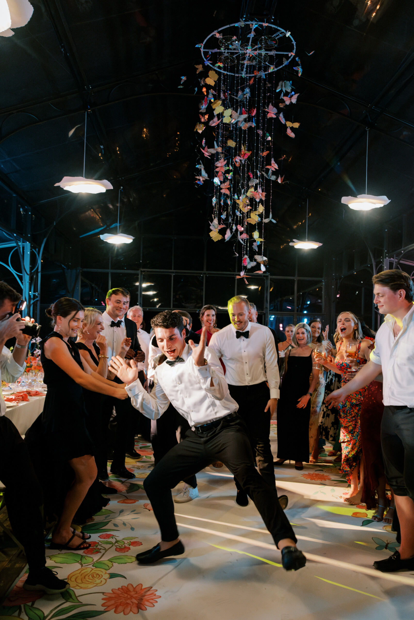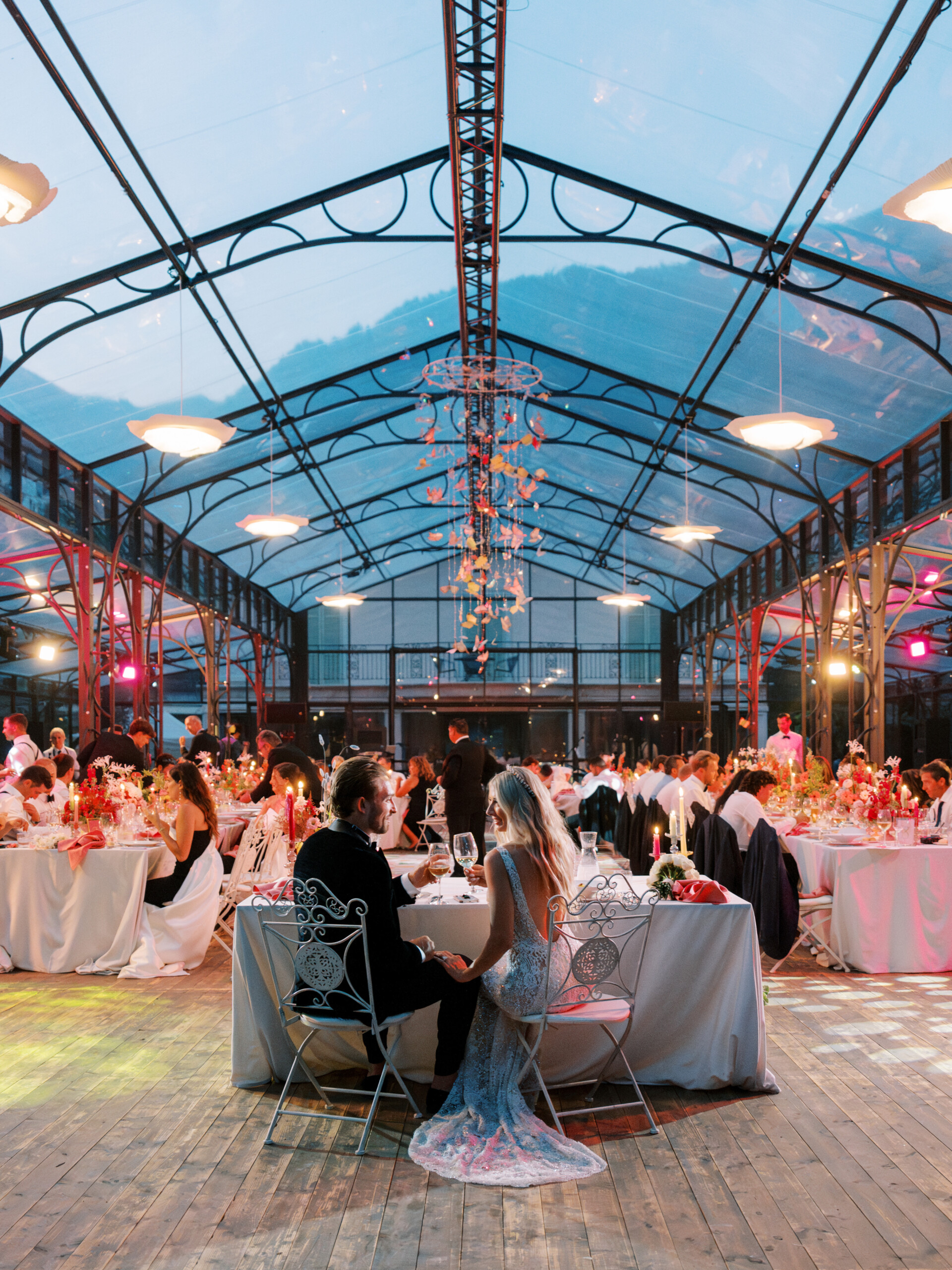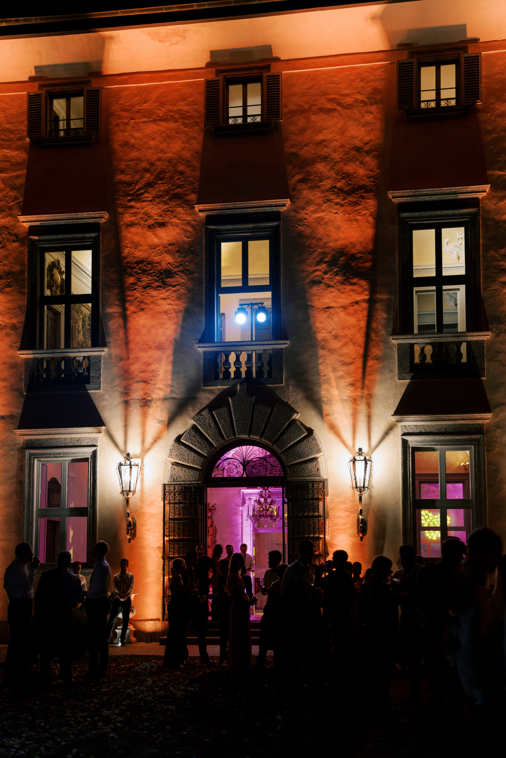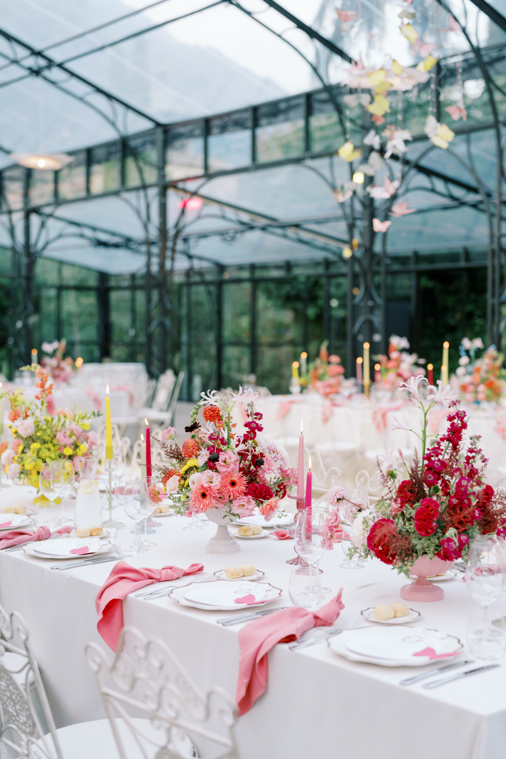 Бабочки парили над цветочной аркой на церемонии и под сводчатым потолком шатра в зоне ужина, оживали на танцполе и присаживались на тарелки гостей. Рассадка была выполнена на карточках-бабочках разных цветов, каждый цвет соответствовал одному из столов гостей. Интересной особенностью декора ужина стало то, что каждая цветочная композиция на столах гостей была создана с уникальным набором оттенков и цветов, который не повторялся. Любимый питомец пары — сибирский хаски по имени Аполлон не приехал с ними в Италию, но его красивый портрет приветствовал гостей свадьбы с монограммы на салфетках.