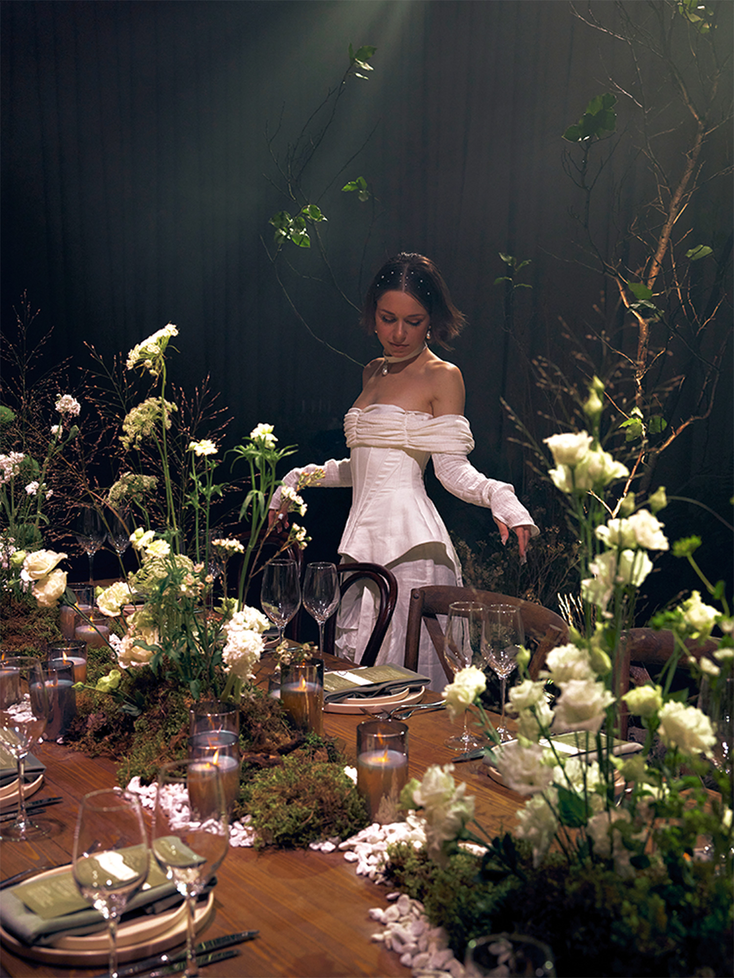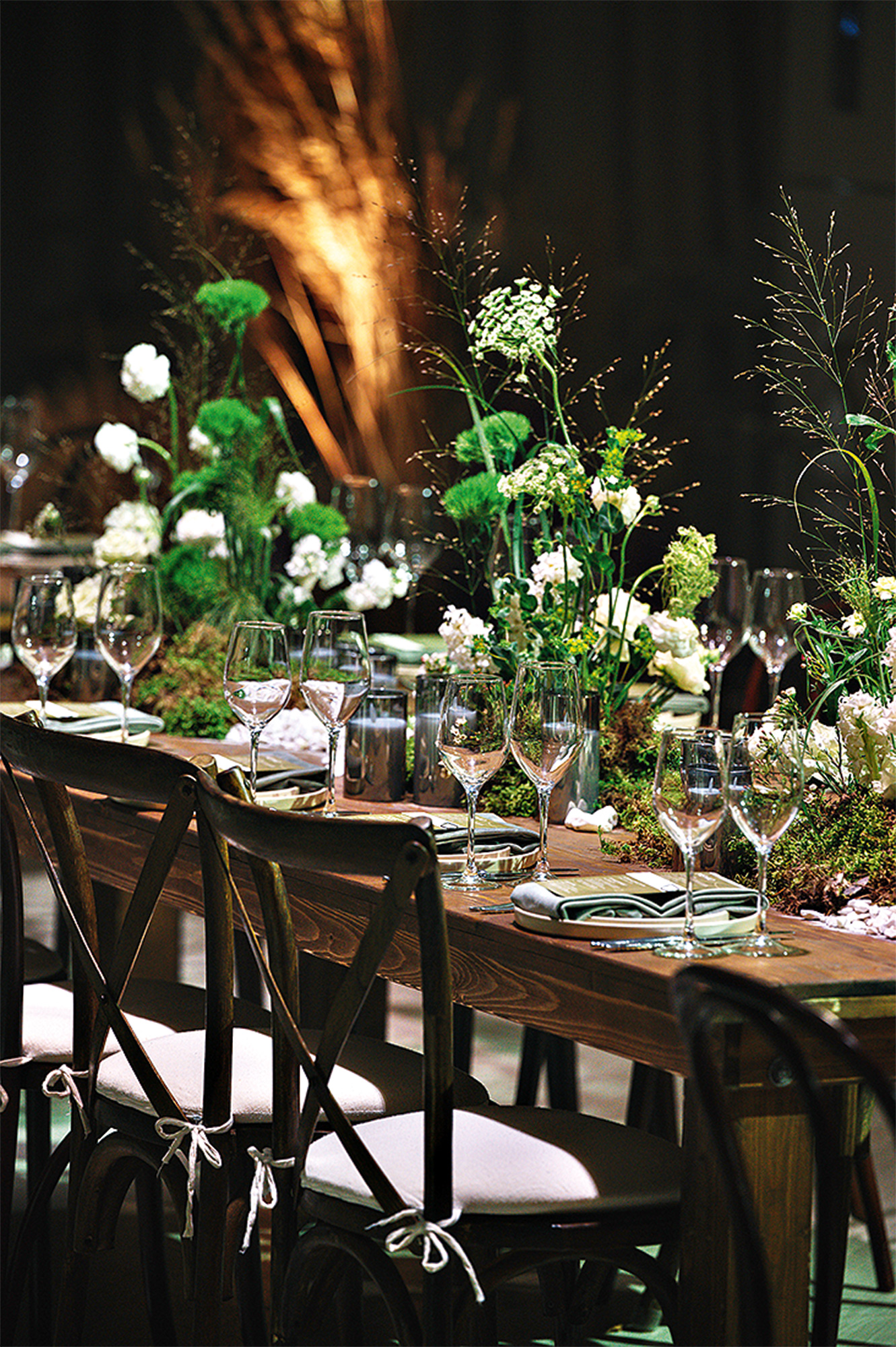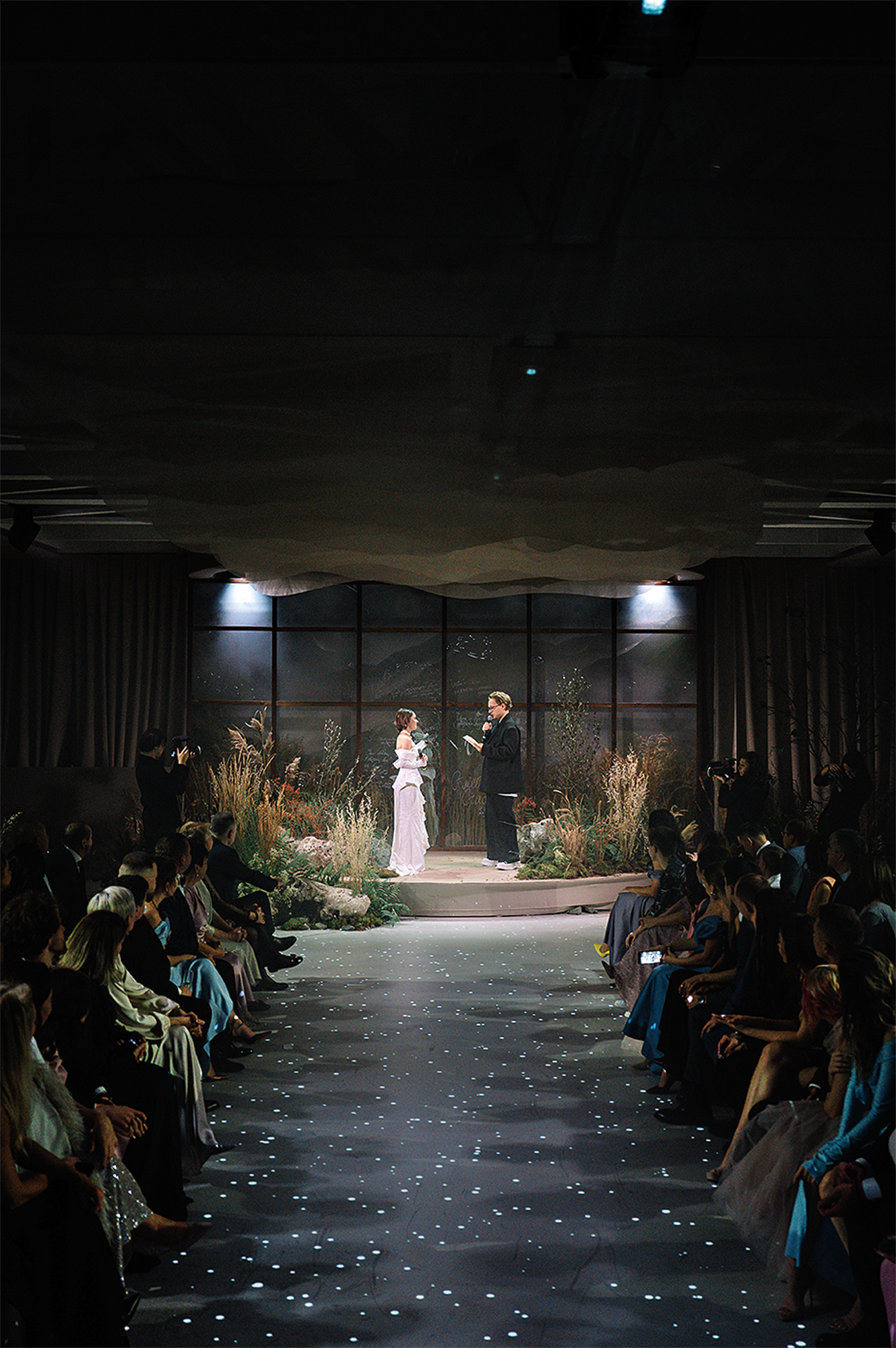 Мы постоянно раскачивали гостей на эмоциональных качелях. Погружение в темноту в начале церемонии позволило сосредоточиться на мире влюбленных и их чувствах. Было слышно, как гости затаили дыхание во время свадебных клятв и как всхлипывали от эмоций».