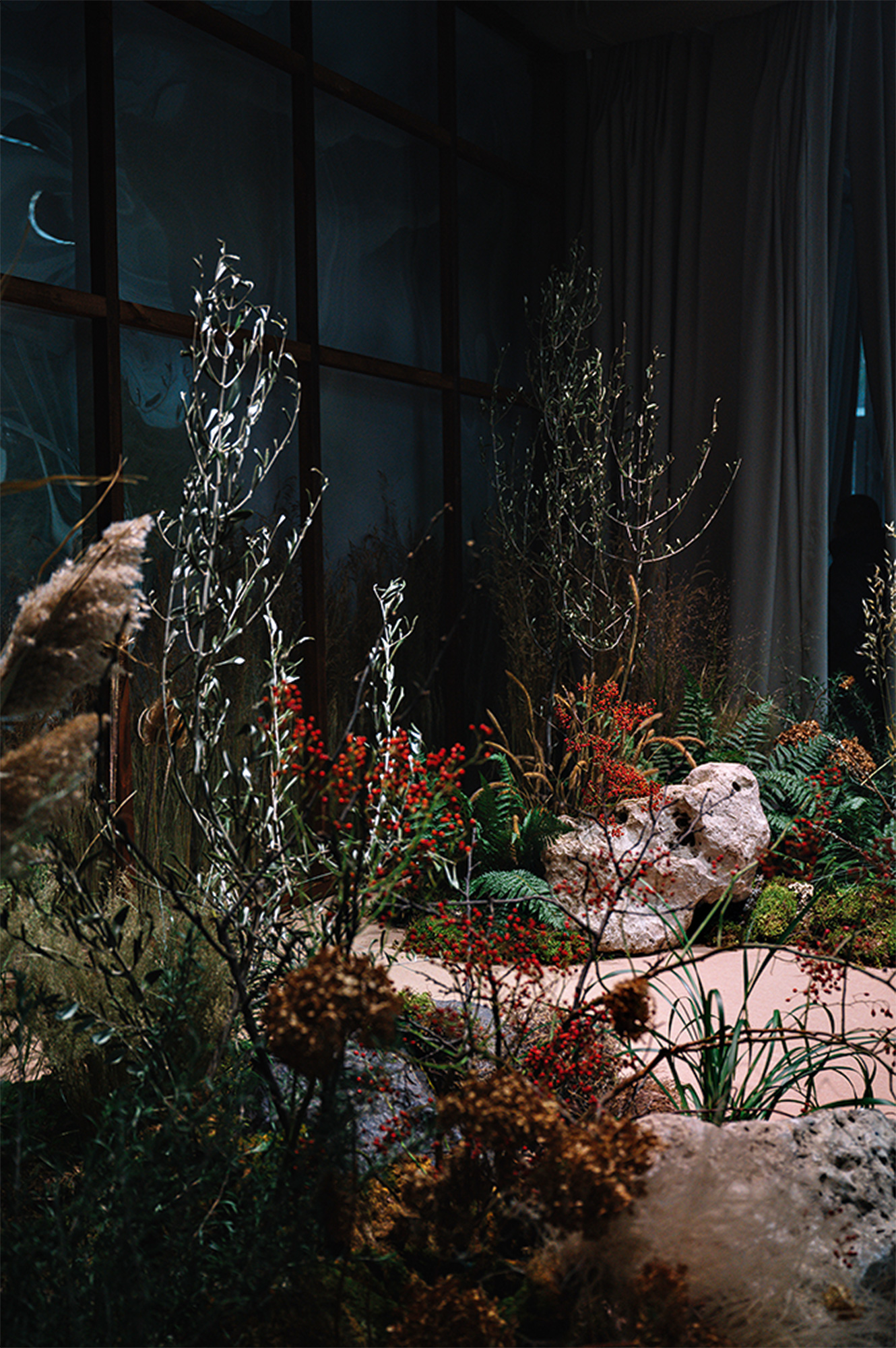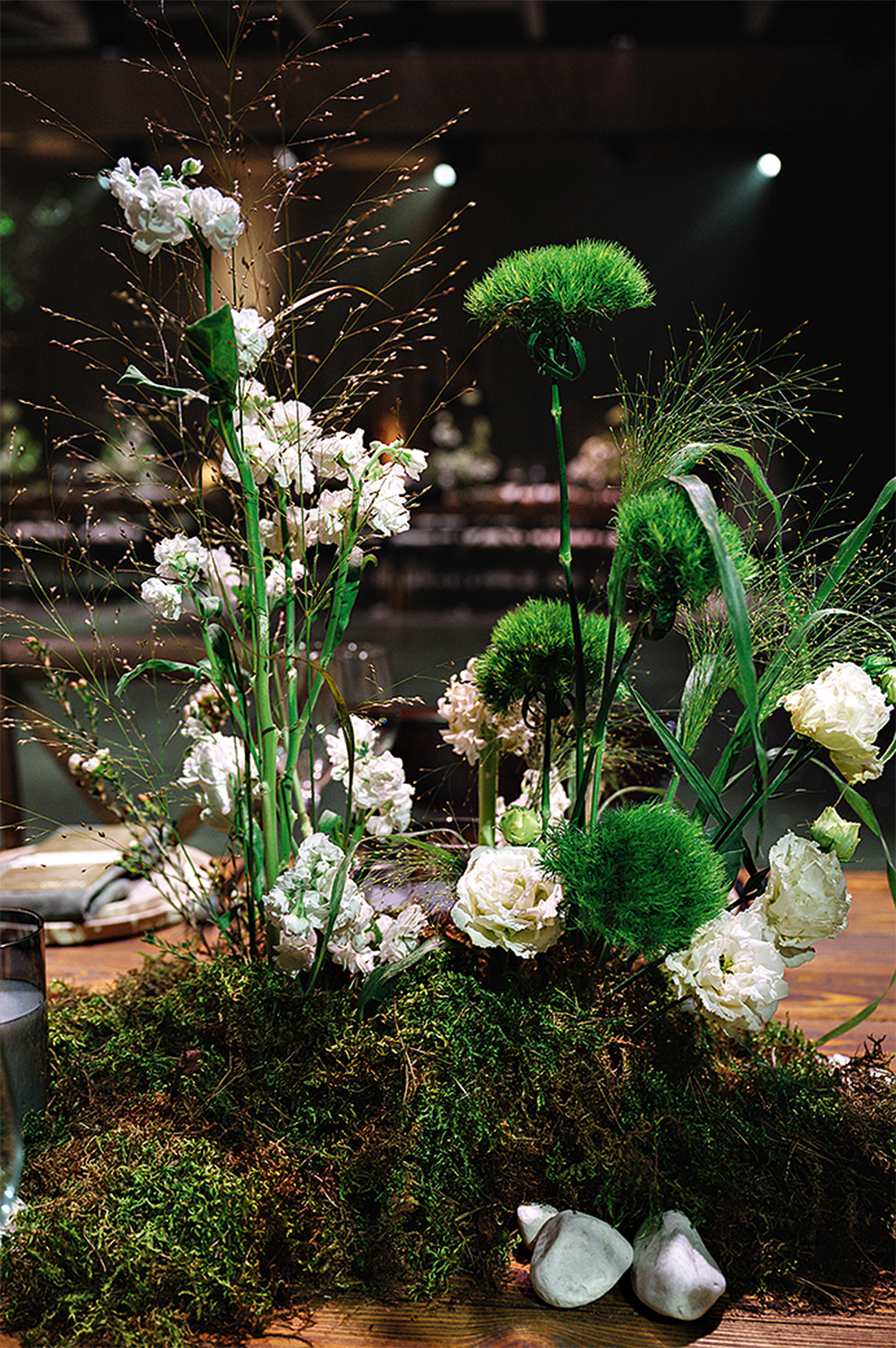 «Нам хотелось воссоздать в декоре скандинавские ландшафты, которые нравятся паре. Деревянные столы мы подчеркнули аутентичной керамической посудой, льняными салфетками и авторской полиграфией. Мы также „вырастили“ вдоль стен зала природные холмы с деревьями, кустарниками, камнями и красивой подсветкой для создания мистической атмосферы, поддержав клумбами на столах с необычным сочетанием цветов, мха и мелкой гальки. Декоративный фон президиума представлял собой окно из дома молодых с видом на скандинавские горы на фоне степных колосьев».