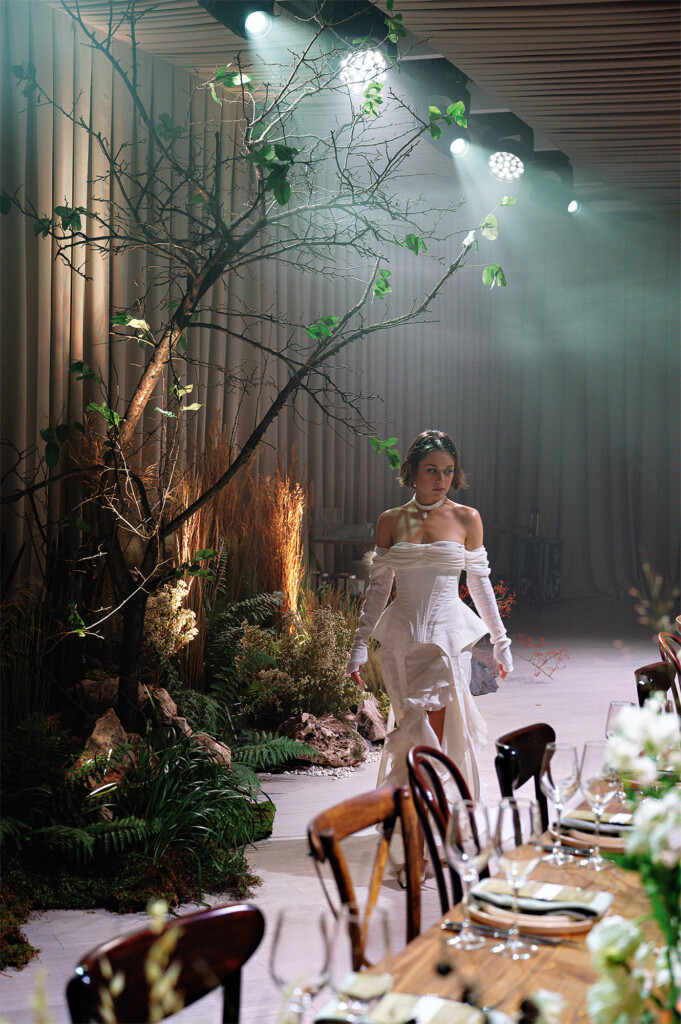 «Усадьба „Тайны Рублева“ была выбрана неслучайно — Ян и Ира хотели свадьбу в лесу с церемонией на закрытой площадке. Палитра стала продолжением северной истории: зеленый и серый цвета дополняли живые декорации и фактурные элементы. После первого дня пара сменила романтичные образы в пудрово-розовых оттенках на стильный современный костюм с кроссовками у жениха и белоснежное платье с корсетом и открытыми плечами у невесты».