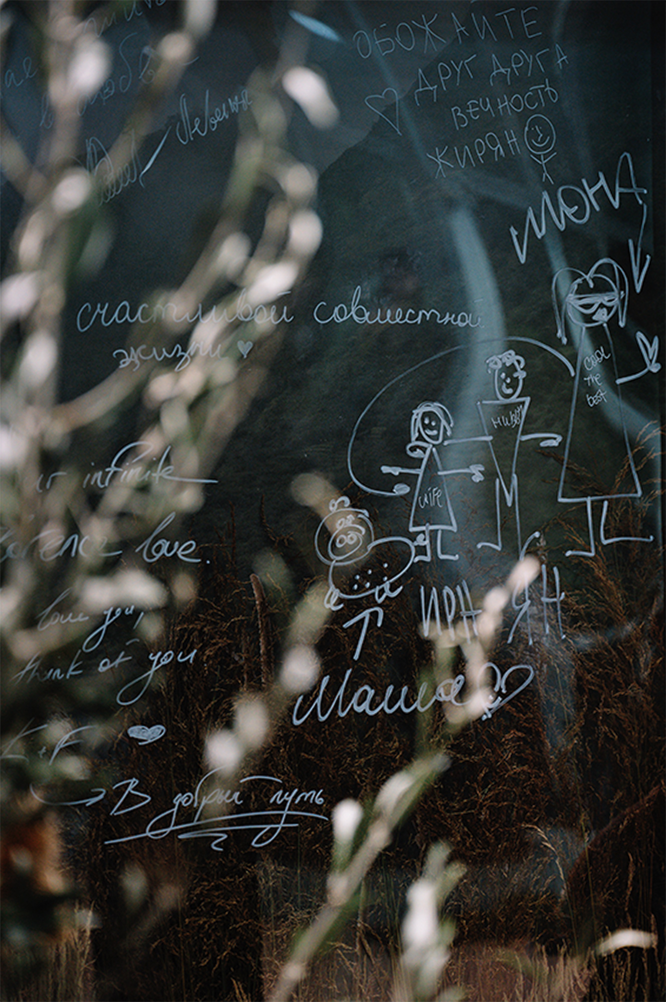 «В первый день свадьбы после загса нам хотелось создать ощущение домашней атмосферы, ужина в кругу друзей в теплом свете свечей и абажуров. Ребята сами нарисовали логотип семьи, чем вдохновили нас на художественную тематику всей свадьбы. Мы изготовили декоративную ширму, превратив ее в холст для росписи гостями. Стол дополняла изысканная флористика с гроздьями сочной хурмы. Номер для утра невесты мы превратили в лесную поляну, которая „выросла“ прямо вокруг кровати. Такой зеленый оазис был отсылкой к основному дню свадьбы».
