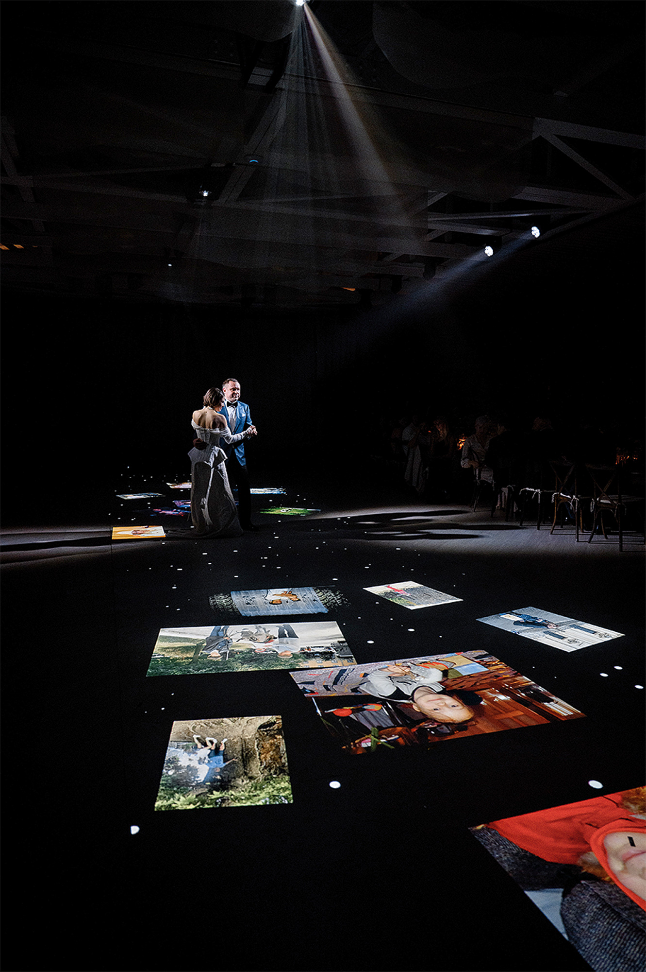 «Было решено сделать дорожку для мэппинга на полу, использовать проекцию во время церемонии и не только. Экран-танцпол позволил нам добавить ламповости, найти необычные решения. Очень трогательным получился танец папы с дочкой, когда вокруг них на полу появлялись фотографии и они кружились среди своих оживших воспоминаний. Вместе с Яном команда создала уникальный таймлайн любви пары и помогла ему рассказать о том, что вся его жизнь была дорогой к Ире, а потом подарить невесте авторскую фотокнигу».