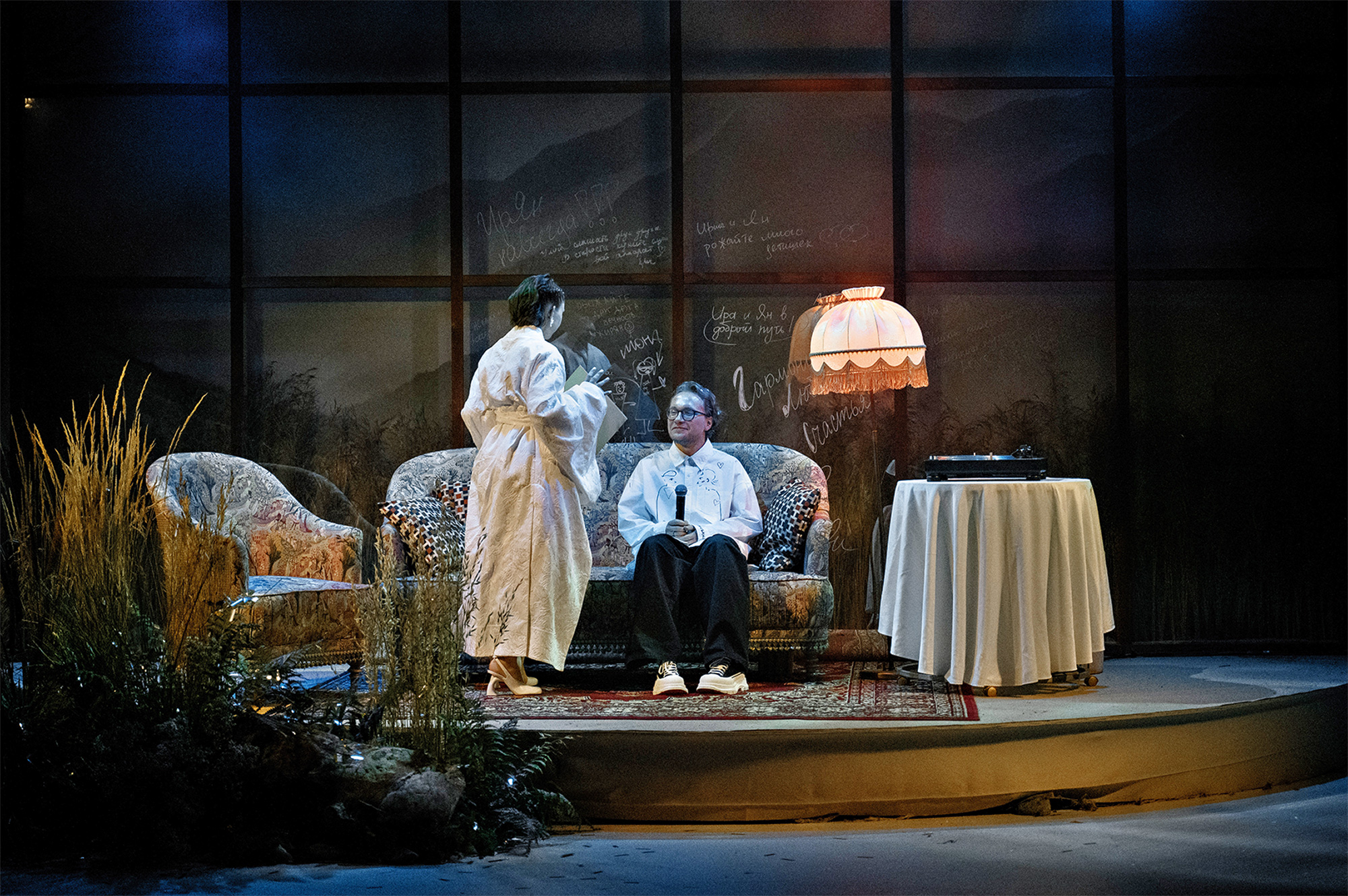 «Мы отказались от отдельных номеров с артистами, не связанных с ребятами. Все, что происходило, было сделано для них и о них. Торжество началось с welcome у бара и фотозоны, где гости могли оставить пожелания и скетчи маркером на огромном окне со скандинавским декором. Сначала вращающаяся фотозона становилась зоной церемонии, затем трансформировалась в президиум в виде барной стойки, а потом в уютную комнату с диваном, ковром и стареньким проигрывателем. В этой комнате, освещенной только теплым светом абажура, невеста дарила жениху пластинку с его любимыми песнями. Свернувшись клубочком на диване, они слушали ее, стараясь запомнить каждую секунду важного для них дня.