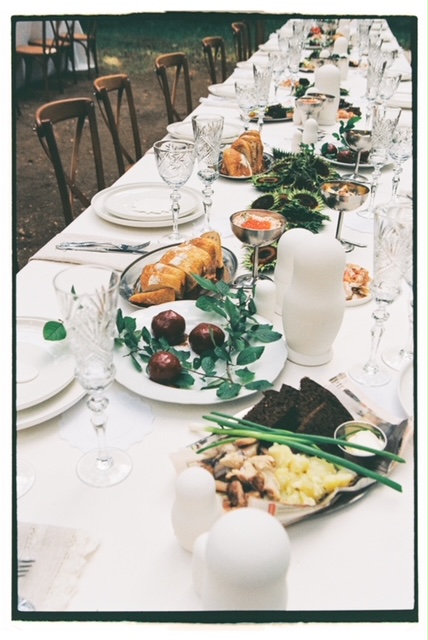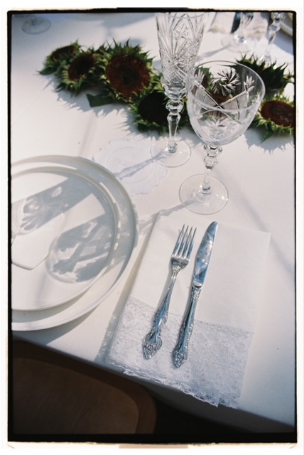 Стол был украшен салфетками с елецким кружевом, бокалами из Гусь-Хрустального и именными скатертями с хлопковым шитьем. В центре стола — белоснежные матрешки, которые невеста красила с подругами на девичнике в бане, внутри матрешек были спрятаны послания от невесты и подружек — в финале ужина каждый гость выбирал вслепую матрешку с посланием. Еще один специальный подарок для гостей — фарфоровые белые матрешки и подсолнухи ручной работы со стихами Высоцкого.