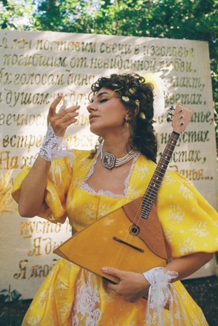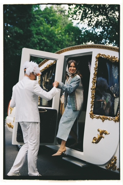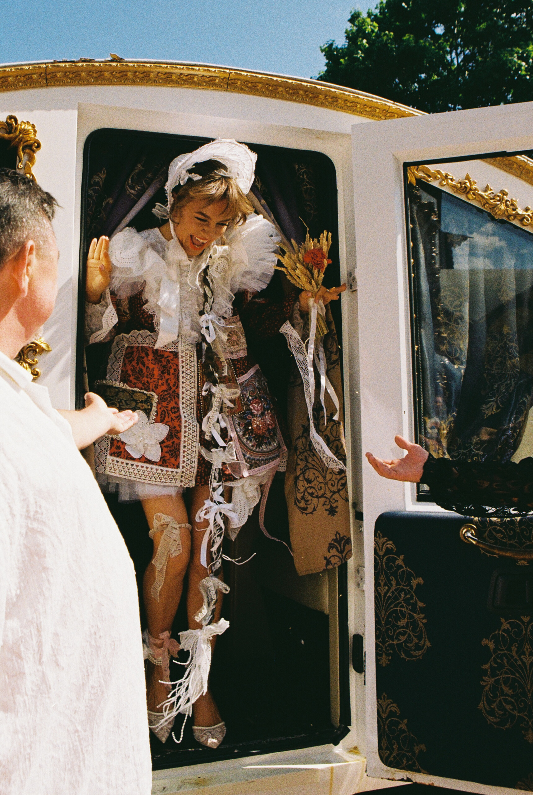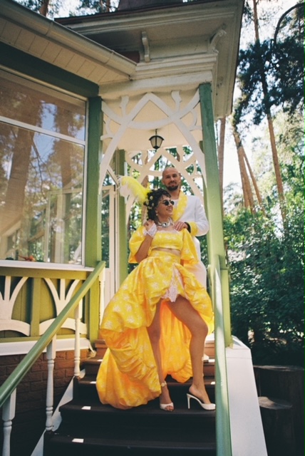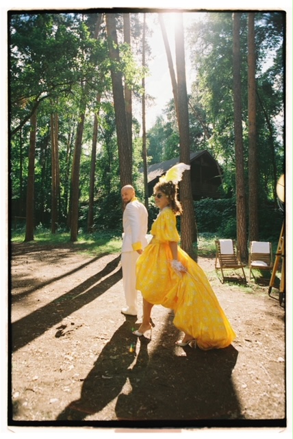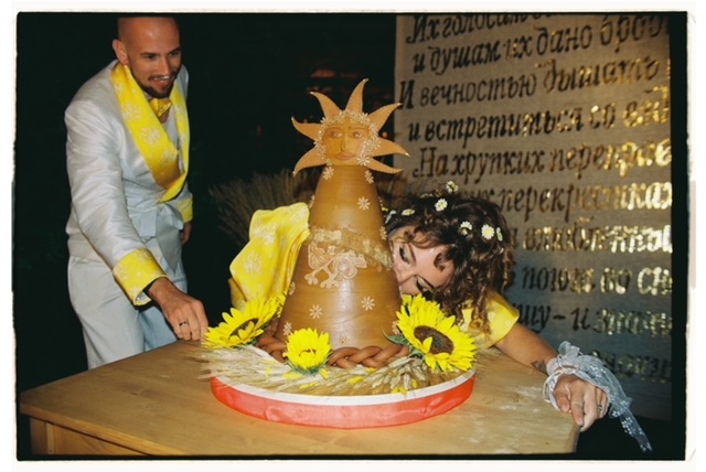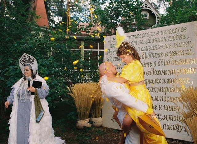 Официальная церемония бракосочетания состоялась накануне во Дворце царя Алексея Михайловича с боярами и цыганами. Платье невесты было сшито из лоскутов со всей России — шуйский ситец с рисунками барановских мануфактур, вологодские кружева, элементы павлопосадского платка, винтажные кружева русского производства, белое хлопковое шитье. Костюм жениха украсили три бутоньерки из красных гвоздик — оммаж Виктору Цою в фильме «Асса». На голове невесты — свадебный капор и коса до пола с вологодским кружевом. Кольца хранились в красной матрешке на подушке из красной смородины.