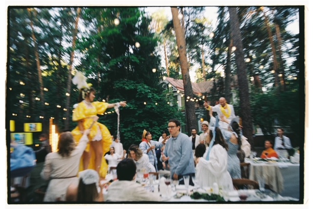 Вместо обычных столов были использованы сценические станки, чтобы гости могли танцевать прямо на столах.