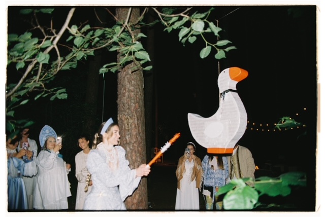 Вместо ловли букета незамужние подруги разбивали гуся-пеньяту, потому что на Руси на свадьбах в толпу выпускали гуся. Кого ущипнет, та и следующая жена.