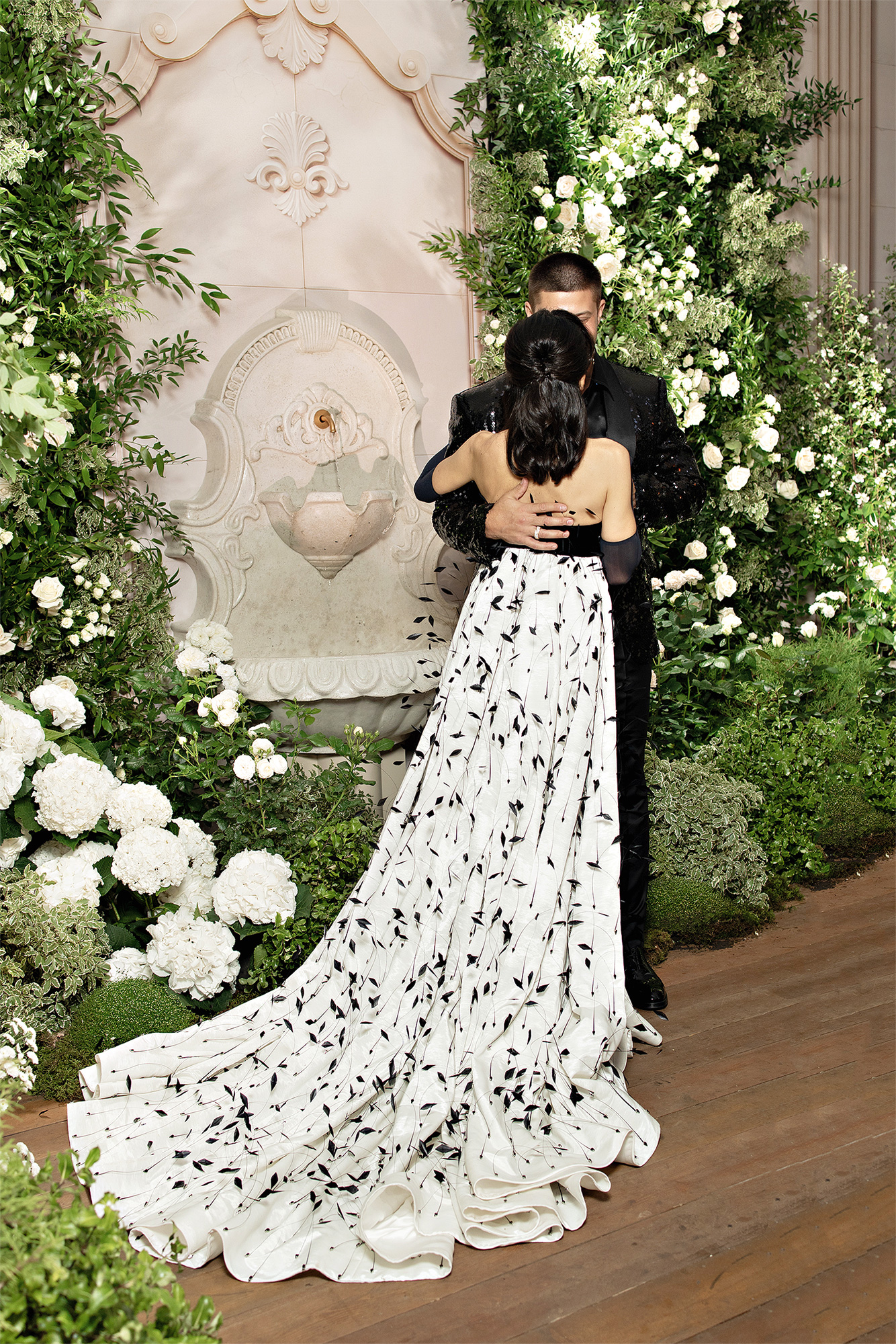 В этих торжественных декорациях для шестнадцати гостей был подготовлен камерный ужин, которому предшествовала съемка пары в усадьбе Кусково. На ней невеста предстала в великолепном и очень нежном платье от Carolina Herrera. Особое волшебство вечеру добавило выступление Полины Гагариной, чей голос наполнил пространство теплотой.