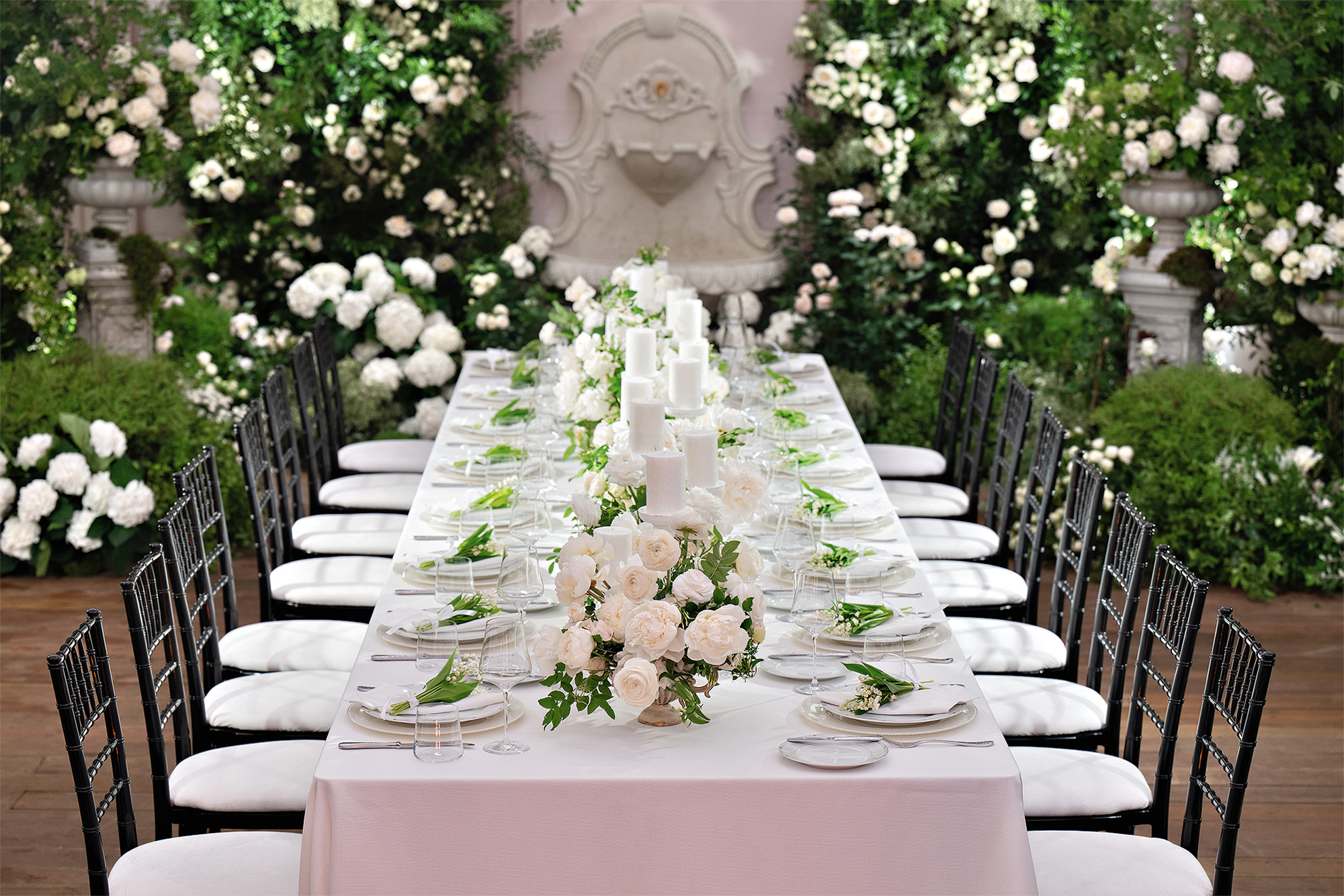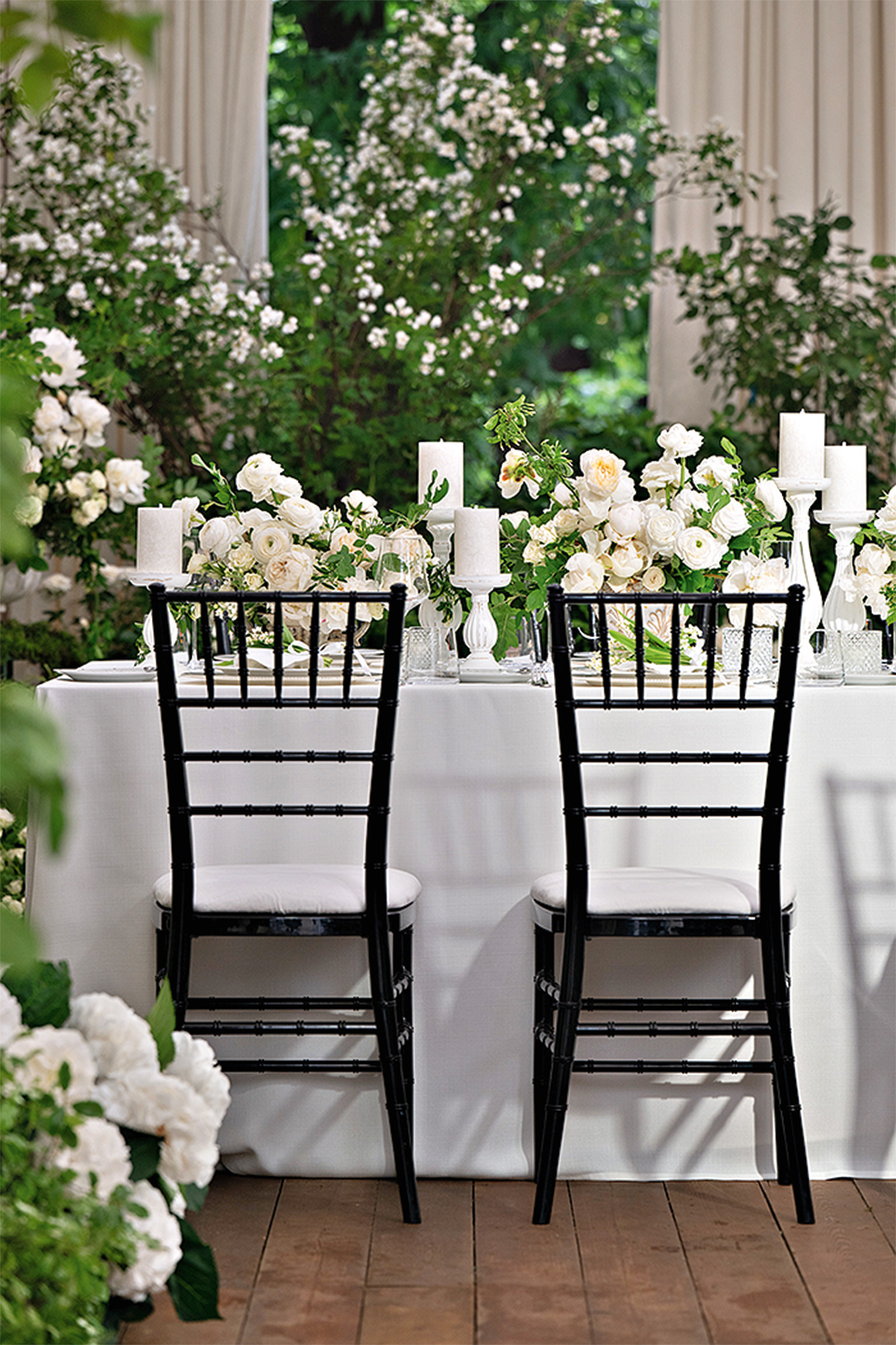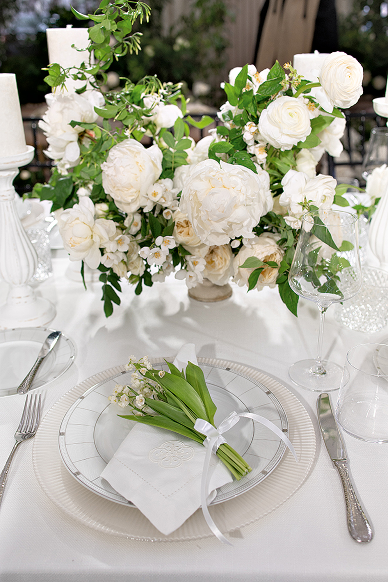 Основу оформления составили белые кустовые розы, роскошные гортензии и насыщенная зелень. Деревянные винтажные подсвечники с восковыми свечами придавали уют, а каменные вазы с цветочными композициями завершали общий образ. На тарелках гостей лежали веточки ландыша — нежный символ счастья, а льняные салфетки с вышивкой подчеркивали естественную элегантность. Платье невесты от Tamara Ralph в черно-белой гамме идеально вписалось в концепцию.