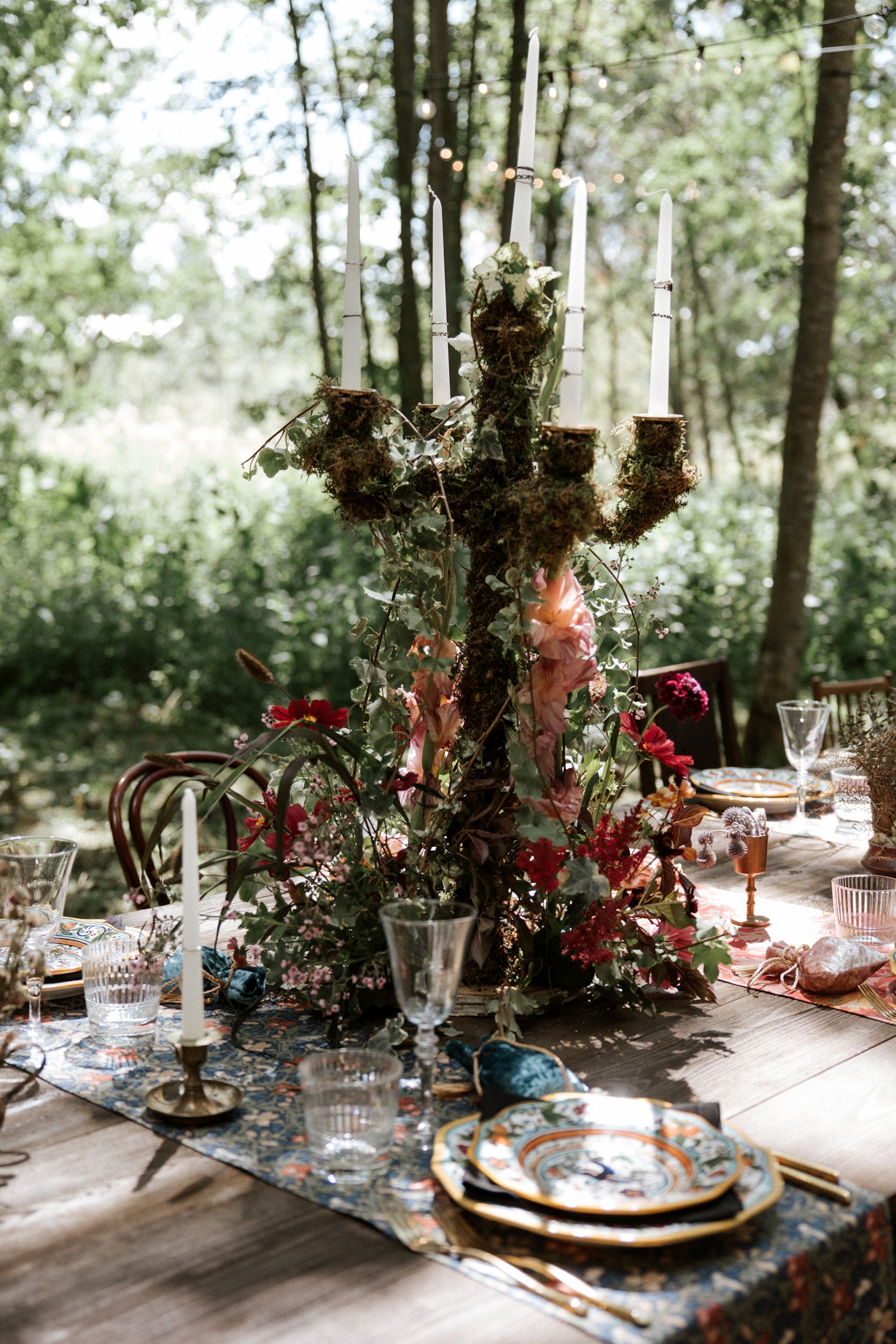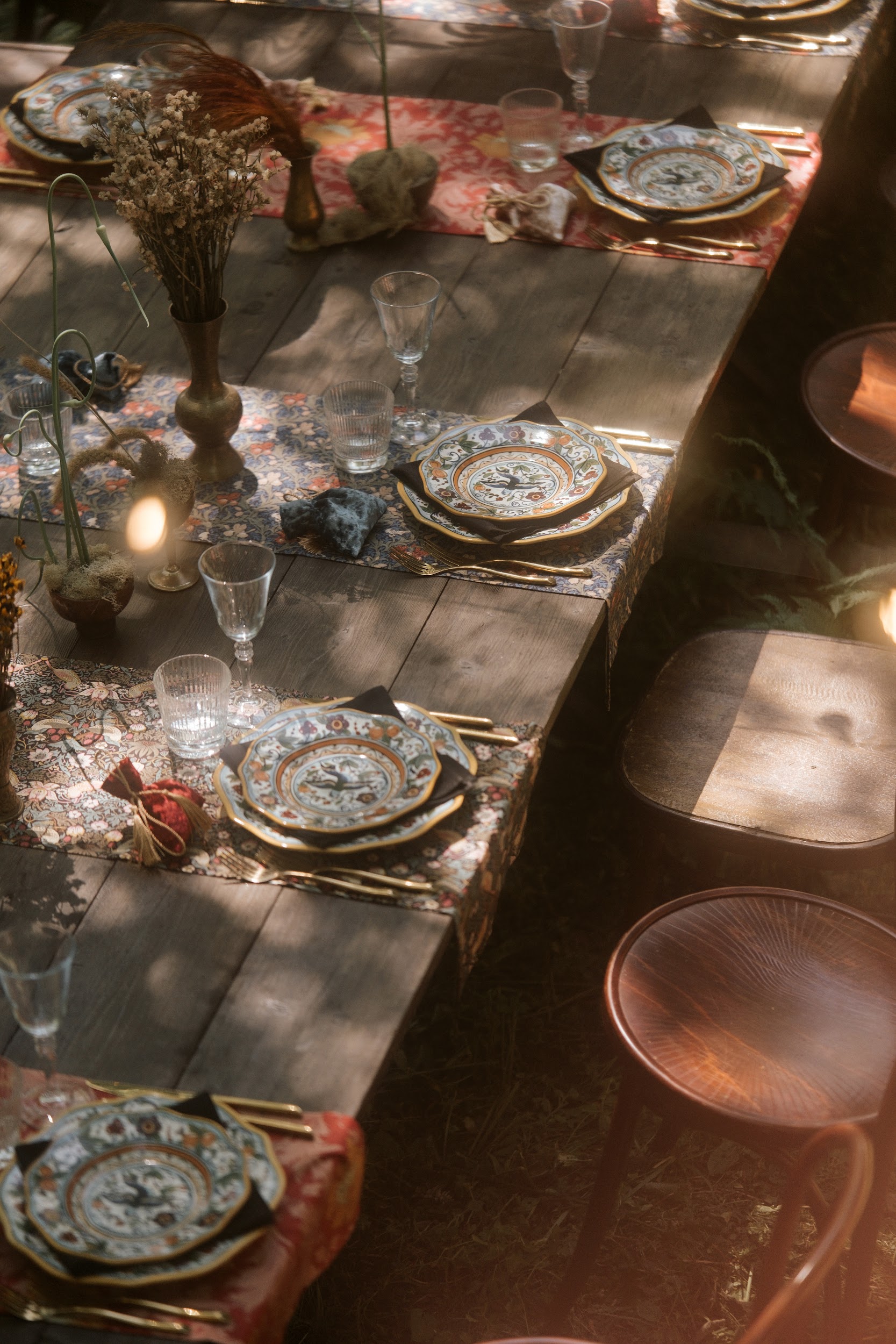 Столы украсили тканями с природными принтами, старинными латунными вазами с лесными и полевыми цветами, моховыми подсвечниками. Завершающий штрих — сервировка тарелками с птицами и бархатные мешочки с иван-чаем для каждого гостя.