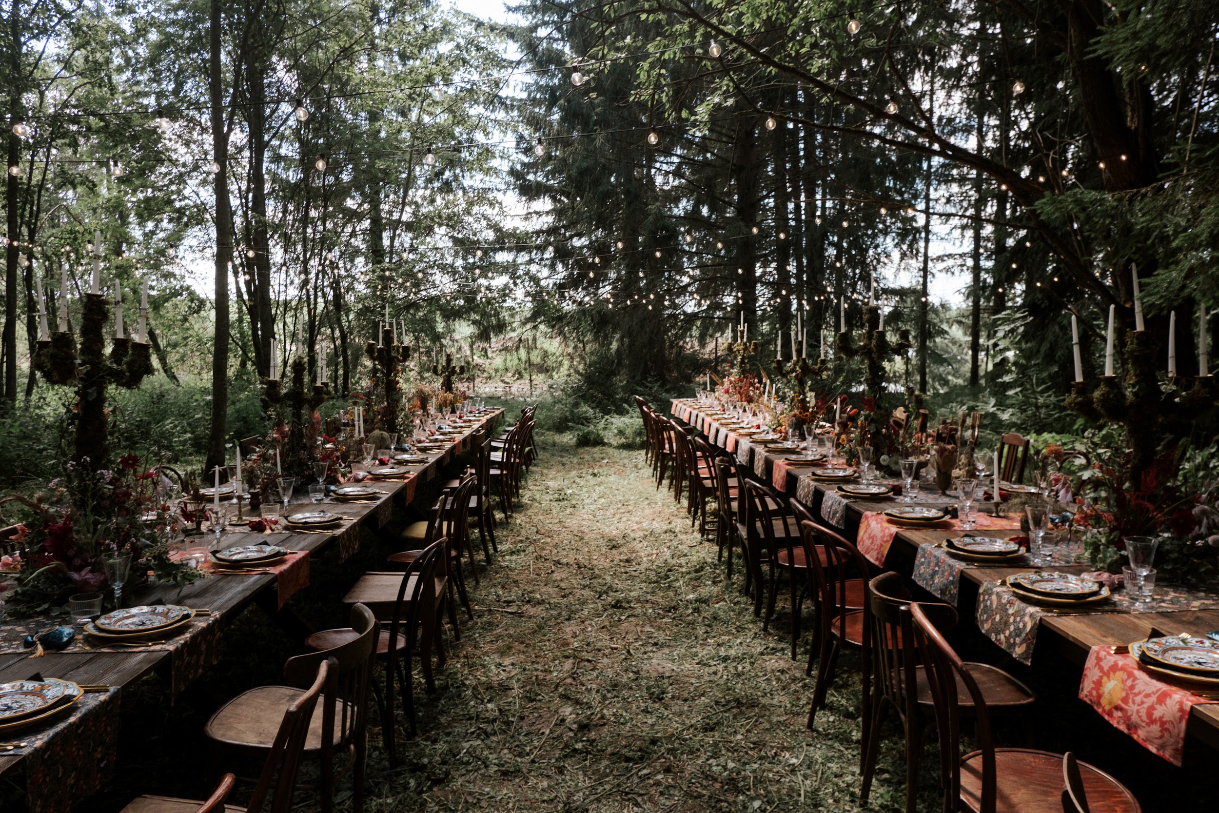 Территорию глэмпинга разделили на зоны. Ужин для гостей прошел на лесной поляне, куда свадебное агентство привезло абсолютно все — подсветку, мебель, сервировку, текстиль, декор и флористику.