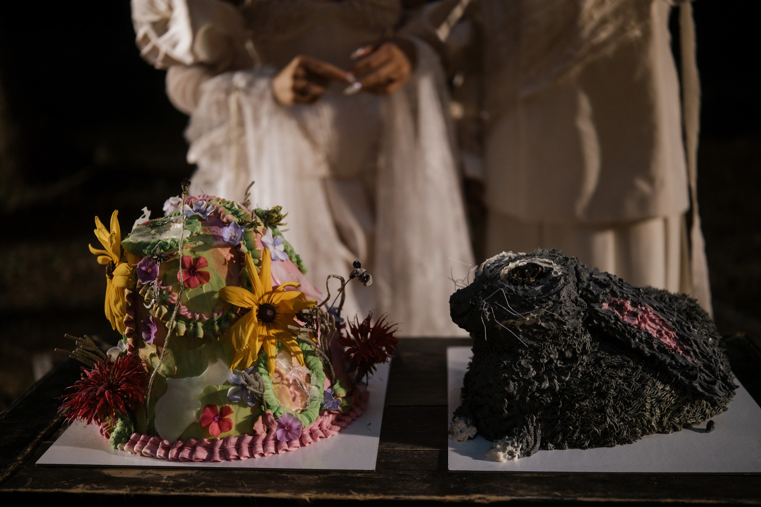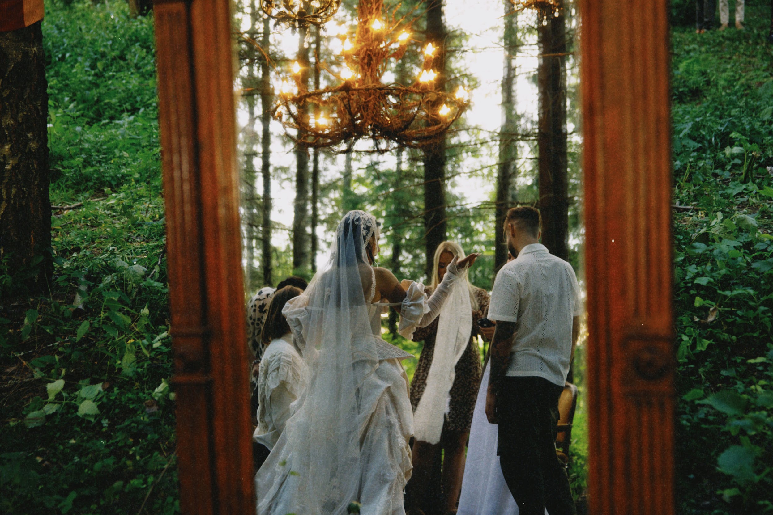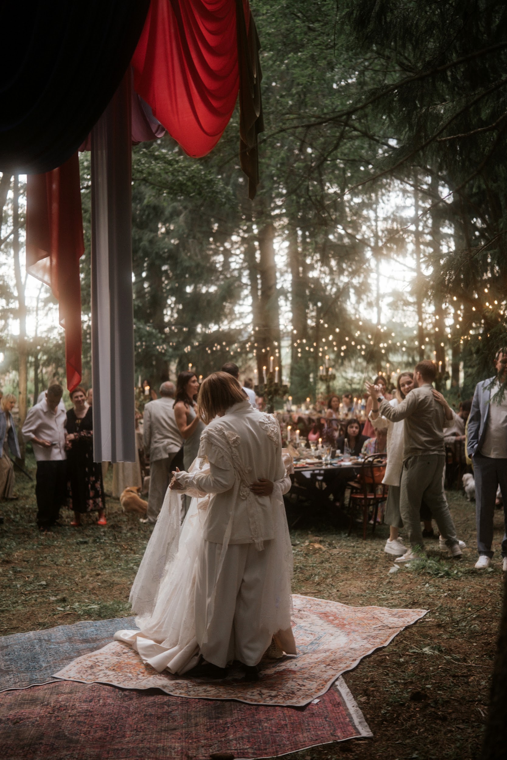 Церемония прошла у озера. Для арки искали элементы в заброшенной деревне — четырехметровые столбы с налетом времени стали ее основой. Невеста прибыла к гостям верхом на вороной лошади, как и мечтала, а кольца ребятам принесла их любимая собака.