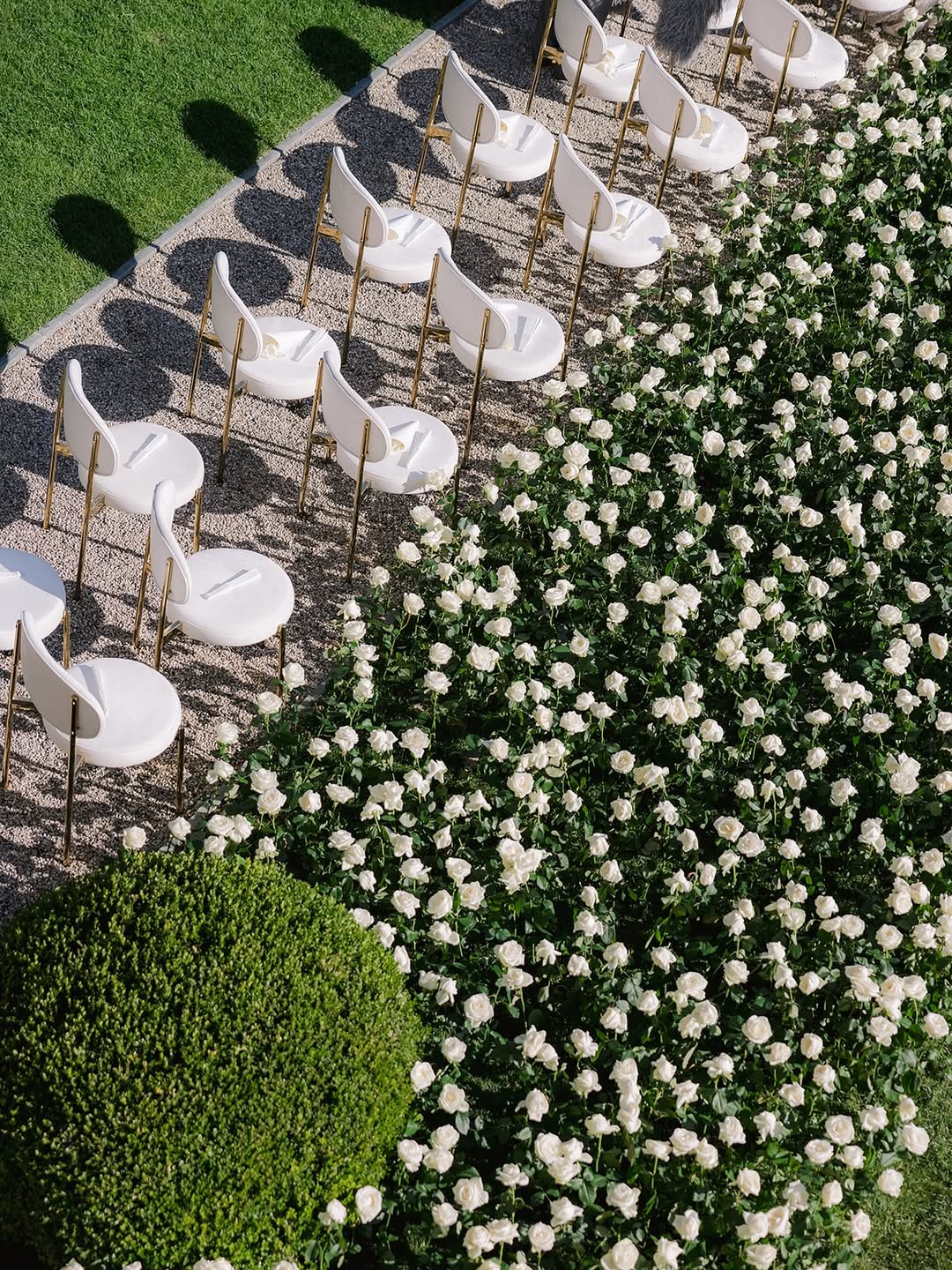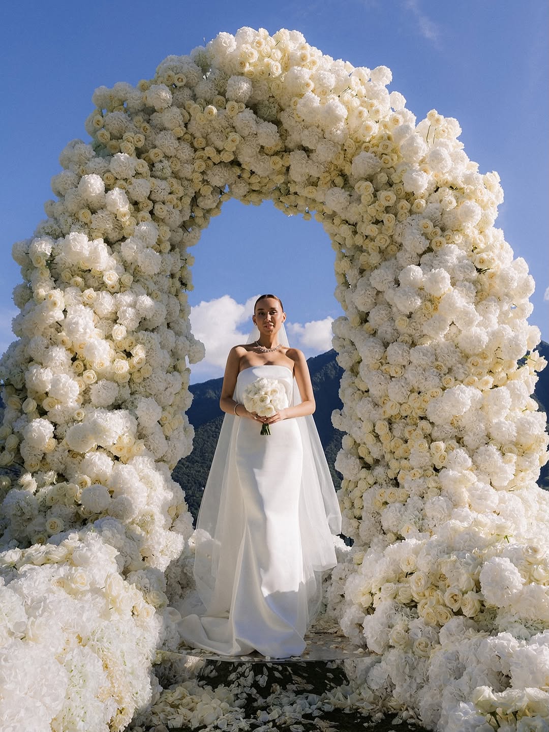 Церемония прошла на аллее из белых роз, под фантастической аркой из живых цветов на фоне воды, гор и зацепившихся за них облаков.