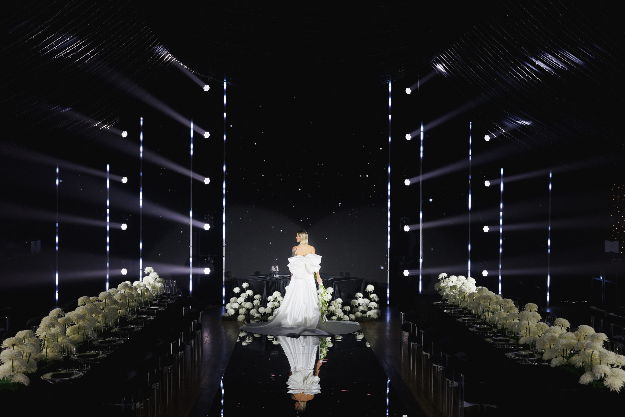 Загородная площадка преобразилась до неузнаваемости: зал был полностью зашит черным бархатом, а потолок осветили четырьмя километрами огней (мечта невесты), также было установлено множество экранов с закольцованным видеоконтентом. Гости танцевали «на льду» и «на звездном небе», погружаясь в атмосферу волшебства, созданного благодаря нанотехнологиям.