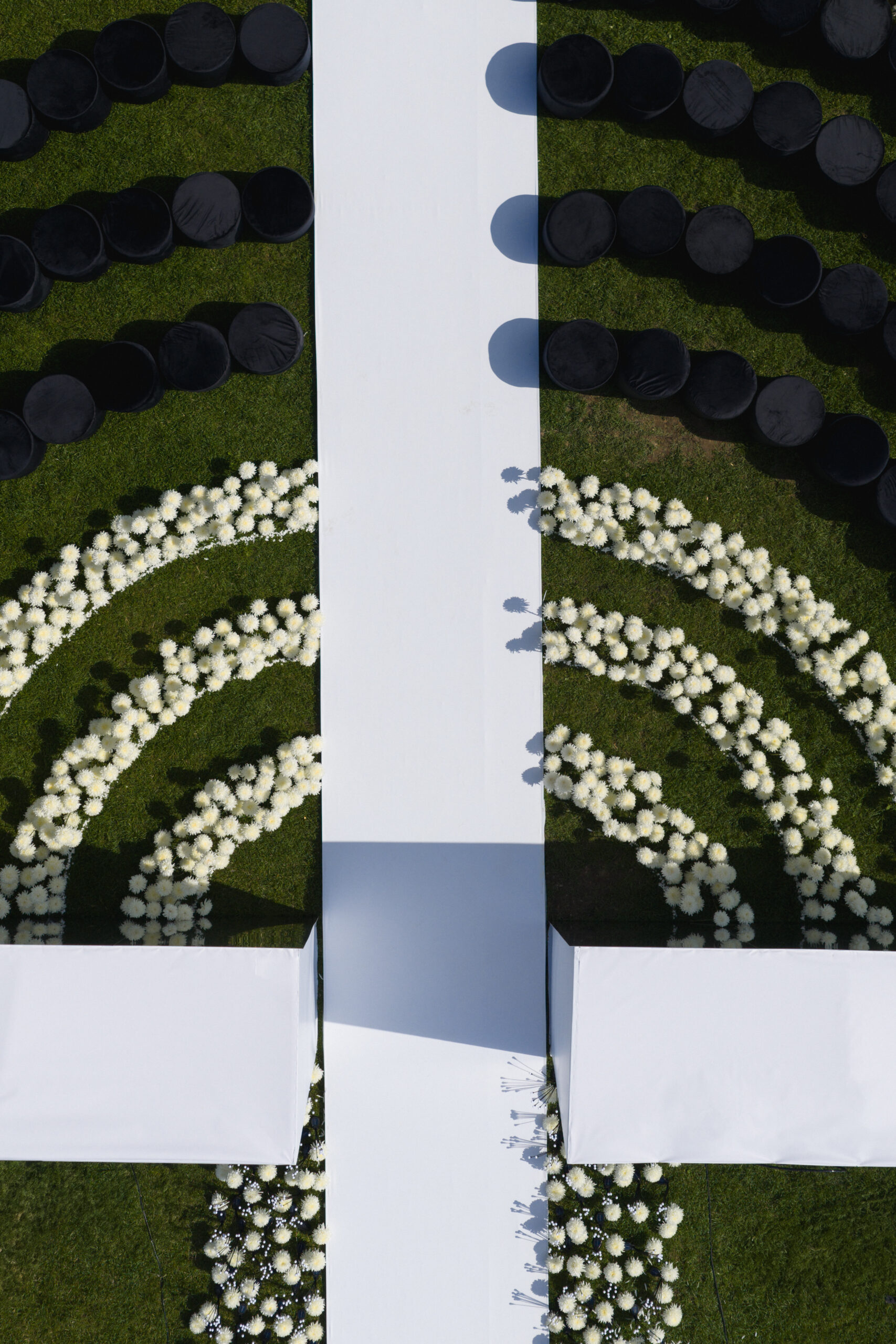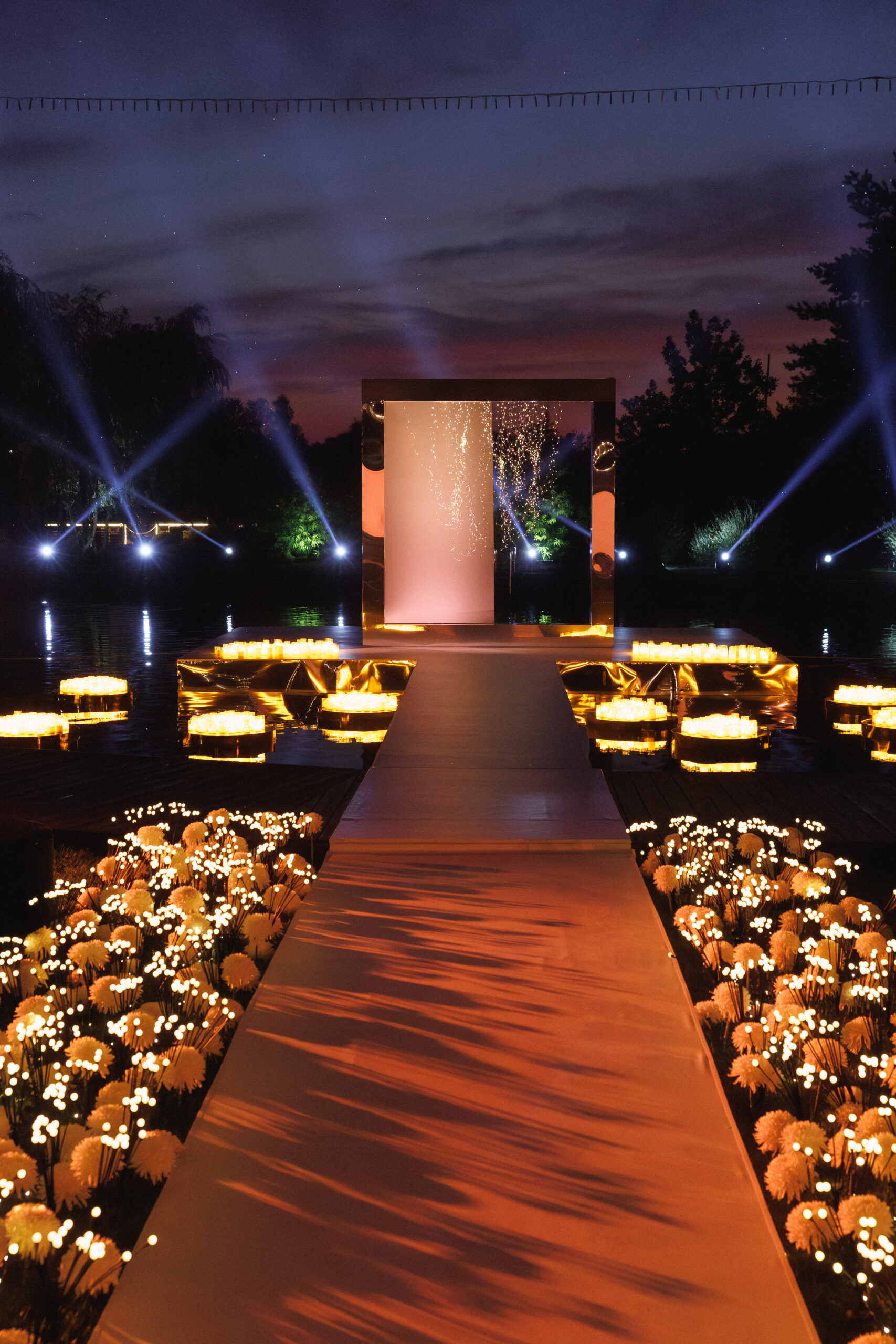 В центре озера был построен понтон, ставший сердцем самого главного действия, а сюрпризом вечера стал 40-метровый огнепад через озеро, который вспыхивал в момент поцелуя.