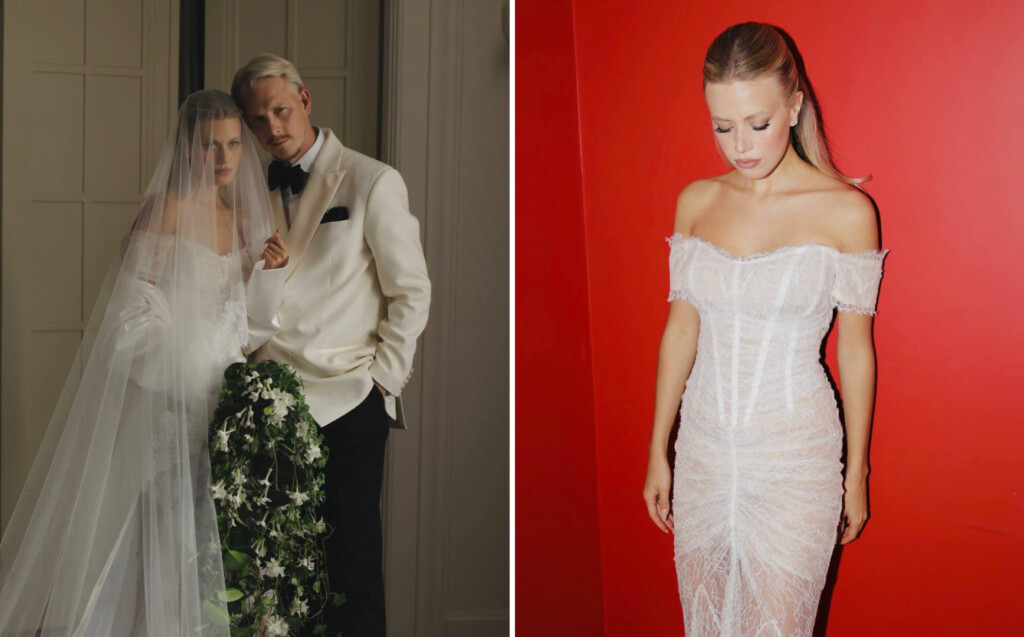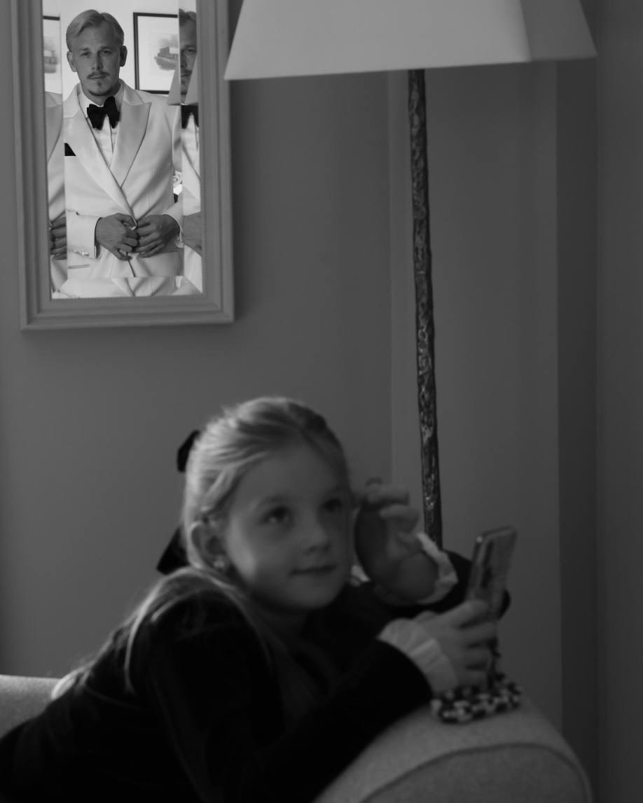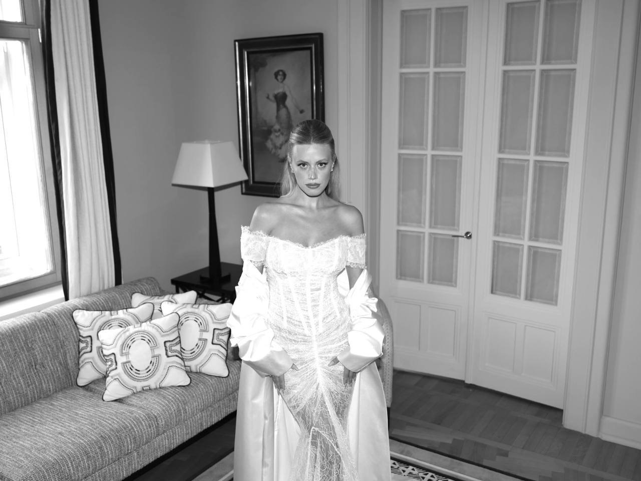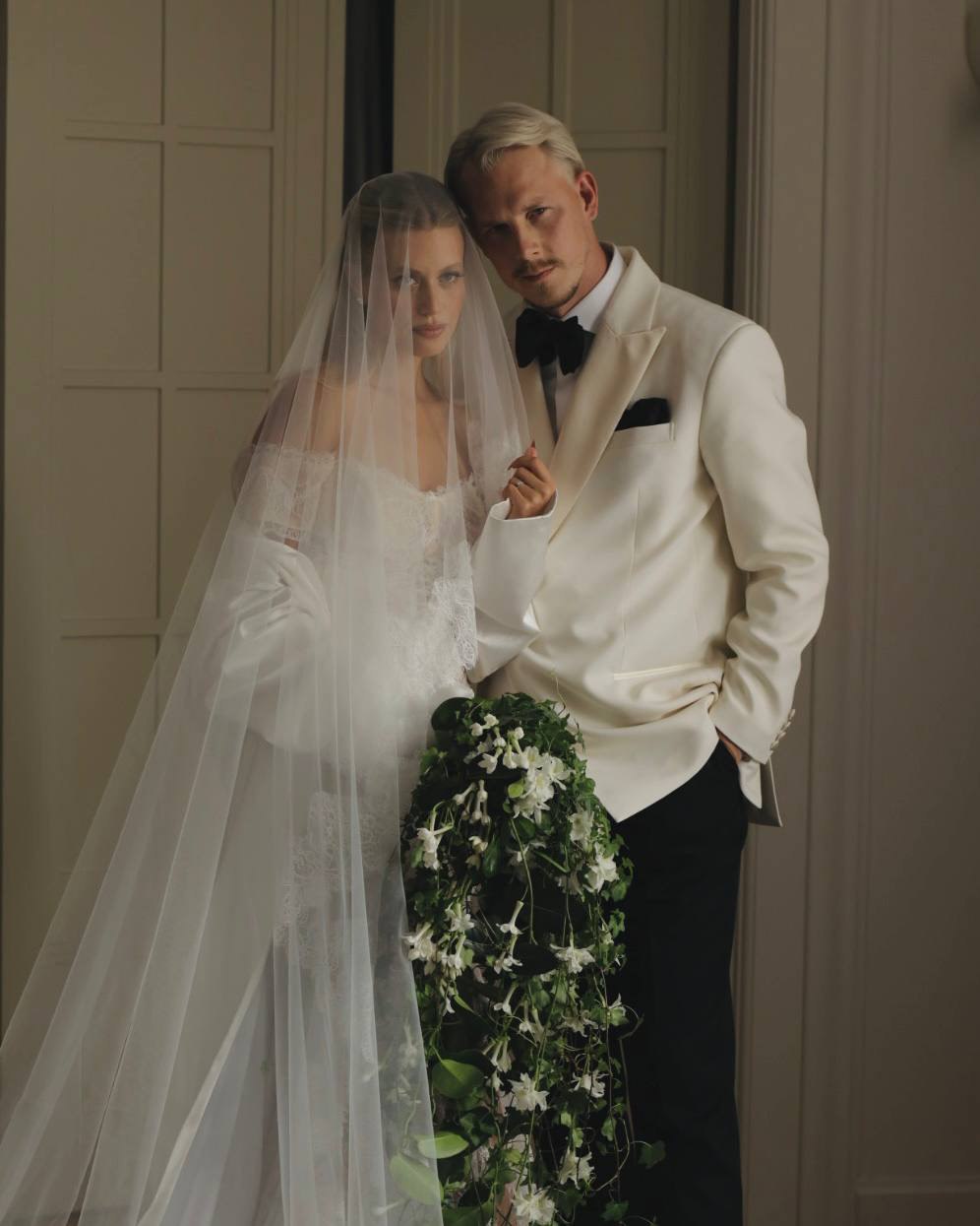 Миша все шил на заказ. Изначально мы оба склонялись в сторону классического стиля, поэтому он выбрал белый смокинговый пиджак. У меня два образа: специально для свадьбы Rasario создали платье из кружева, фату-испанку и накидку из шелка. Для вечернего образа я выбрала платье Loewe и босоножки Giuseppe Zanotti.