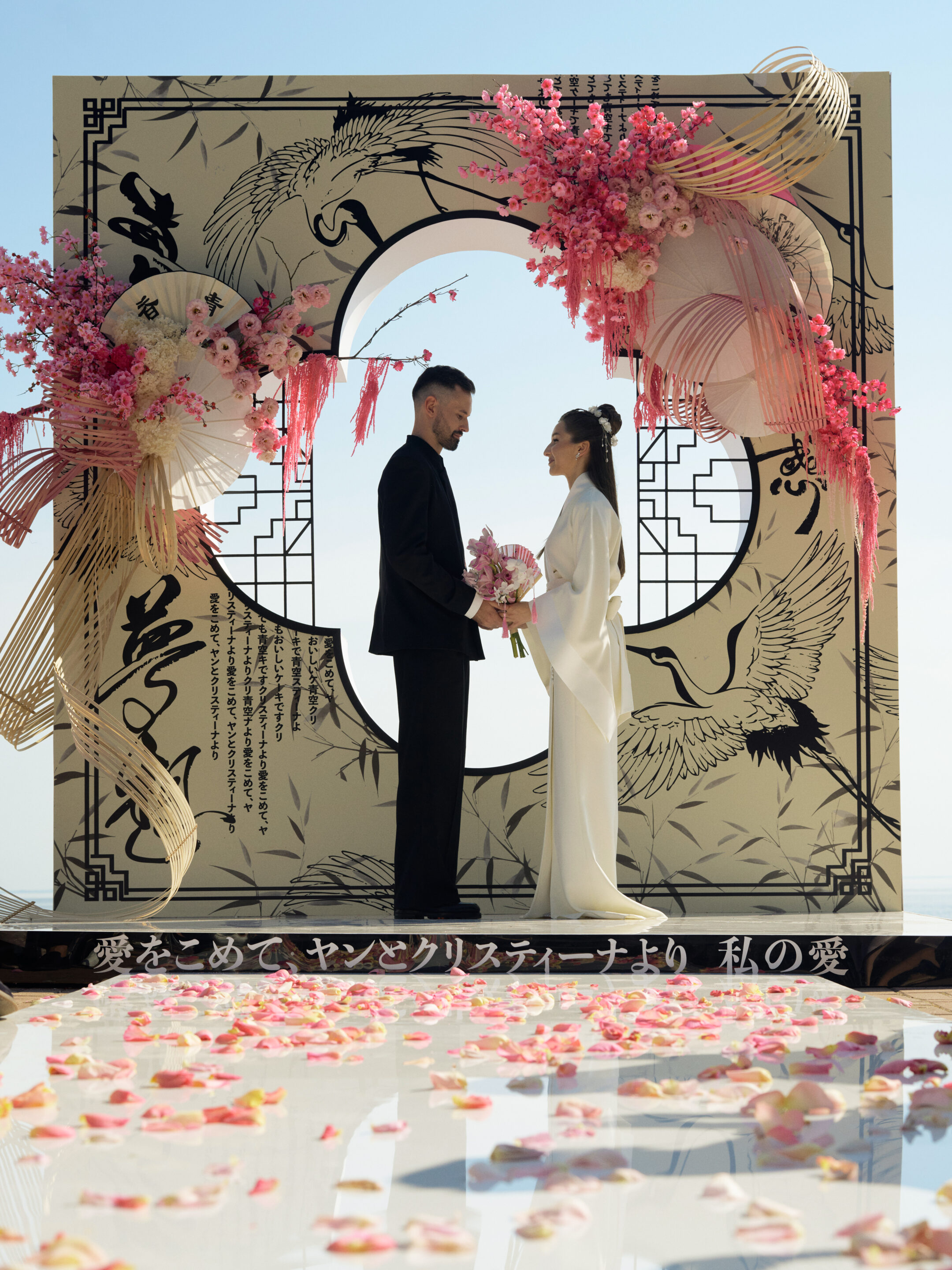 Идея свадьбы родилась из мечты о путешествии в Японию, где молодожены еще не были. Увлечение культурой этой страны и принципы философии икигай легли в основу концептуального праздника со множеством деталей: от продуманных образов пары и тематического дресс-кода до декора, с помощью которого гостей перенесли с берега Финского залива в сакуровую рощу.