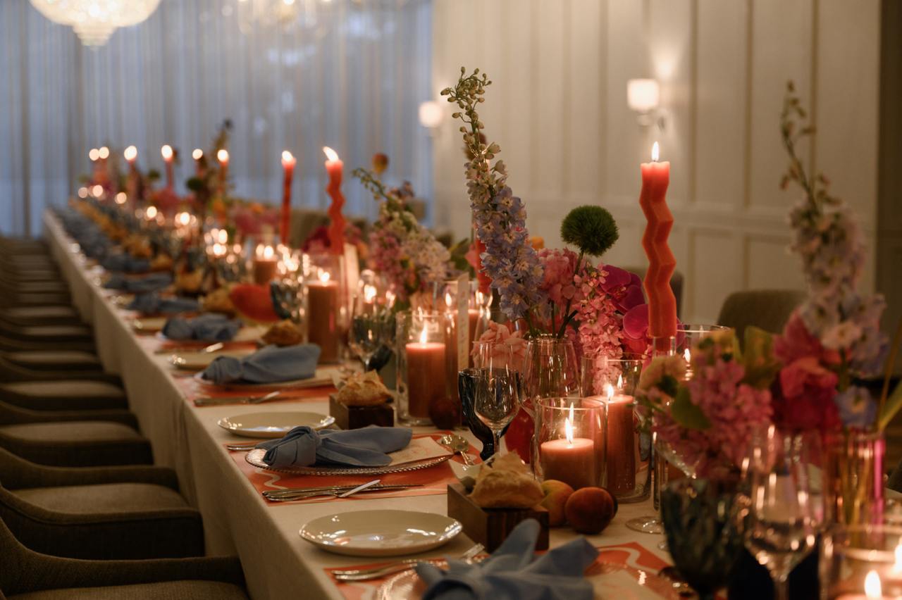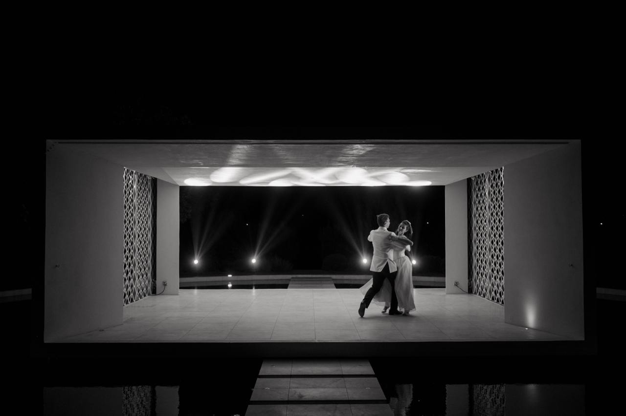 При заселении в отель каждый получил персонализированную карту местности и необычно-стилизованные ключи от номеров. Первый вечер гости провели за ужином с яркими цветочными акцентами за общим столом, играя с гостями в персонализированное бинго. А утро свадебного дня разделили: спа для девушек и гольф для мужчин. После церемонии на воде последовал сказочный первый танец в стиле диснеевских историй и красивый ужин в классическом стиле в стеклянной оранжерее. Завершили уикенд барбекю-вечеринкой.