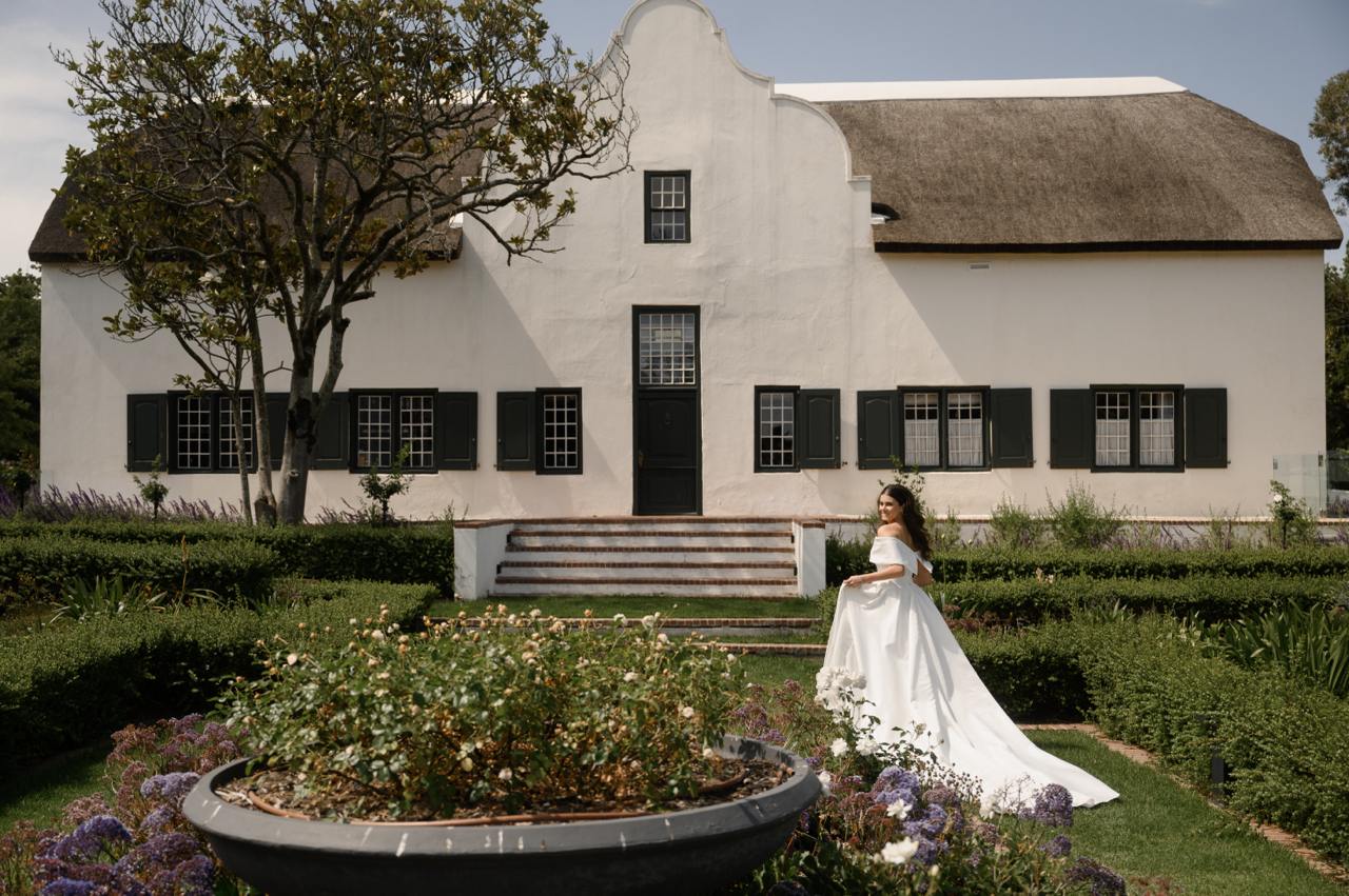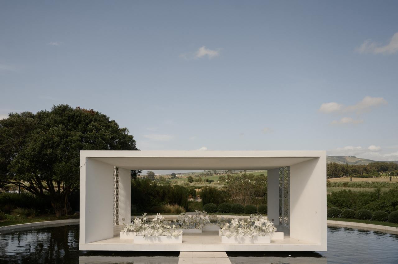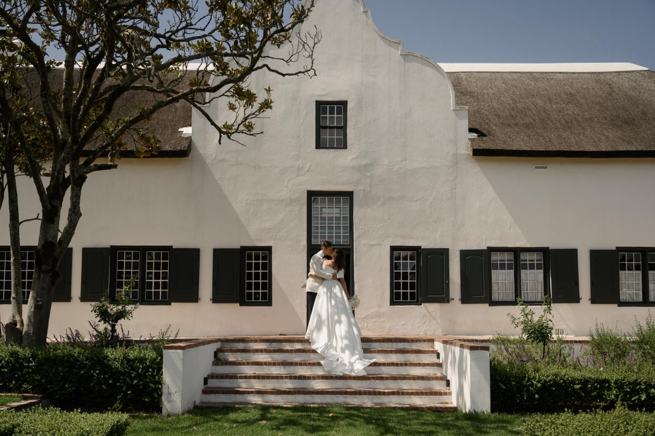 Три дня свадьбы прошли в бутиковом отеле Hazendal Wine Estate в винодельческом регионе Стелленбош. Сердце отеля — исторический белый павильон на воде с видом на горы превратился в зону церемонии. Декор основного свадебного дня был выбран в естественных бело-зеленых тонах, чтобы подчеркнуть мощь природы.